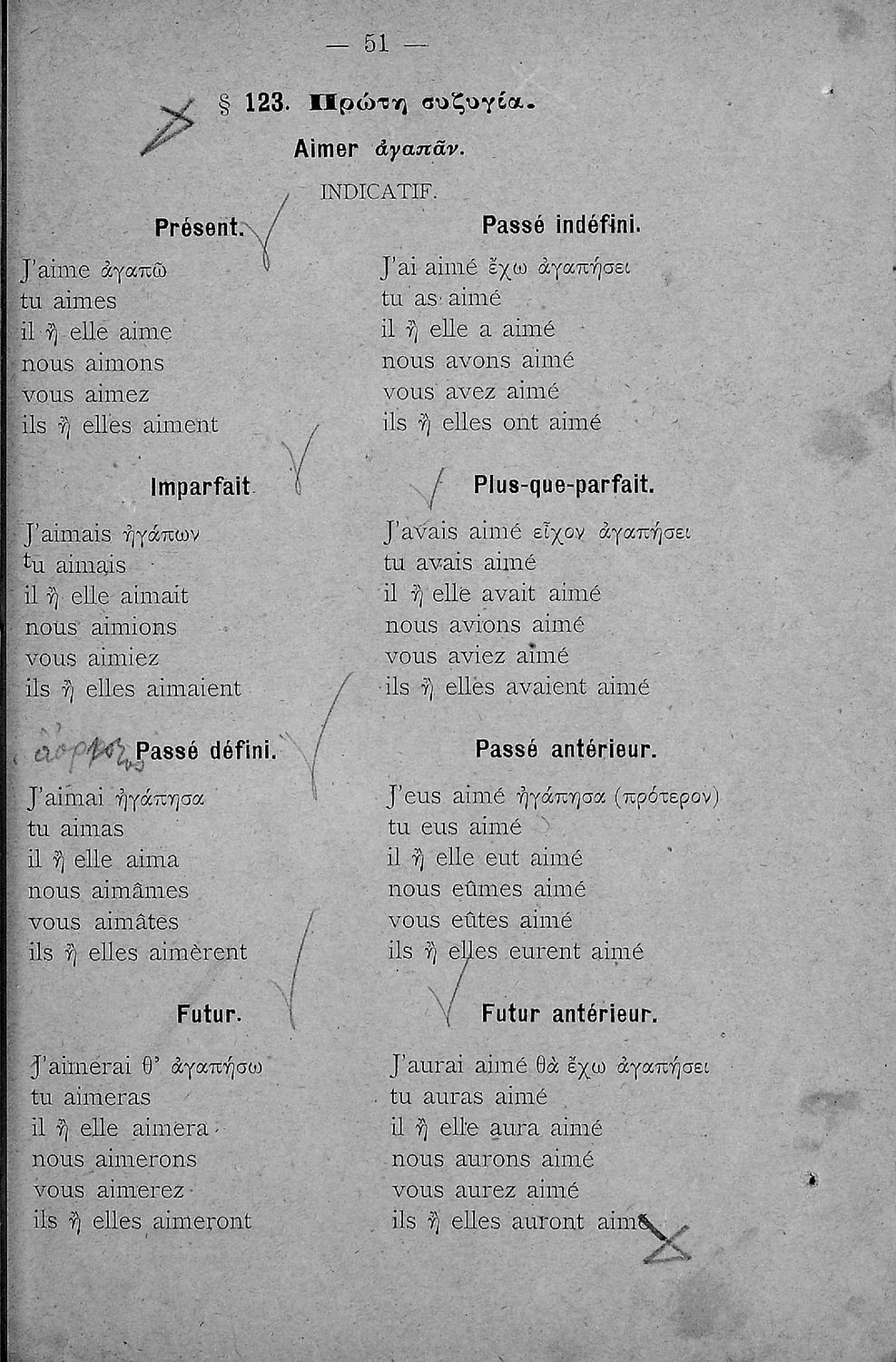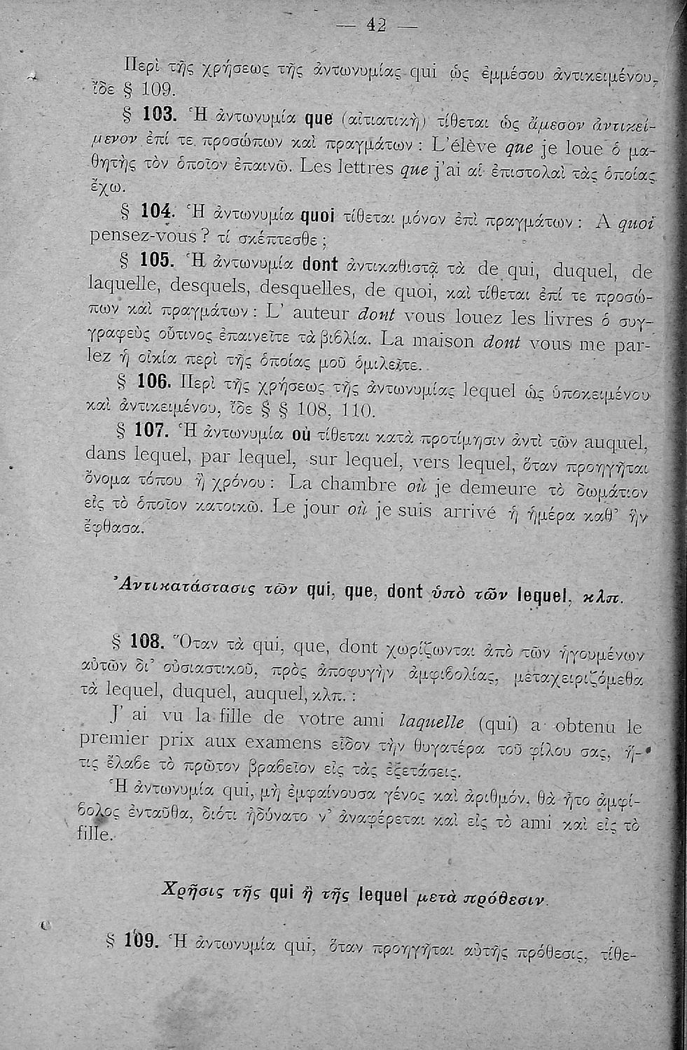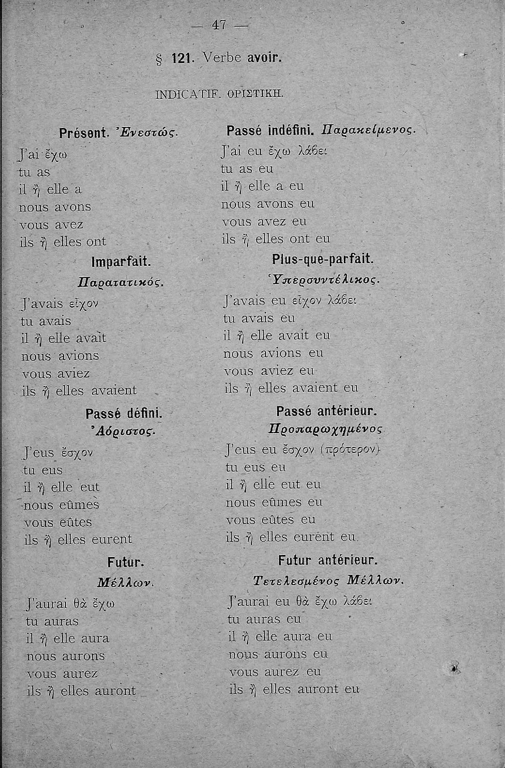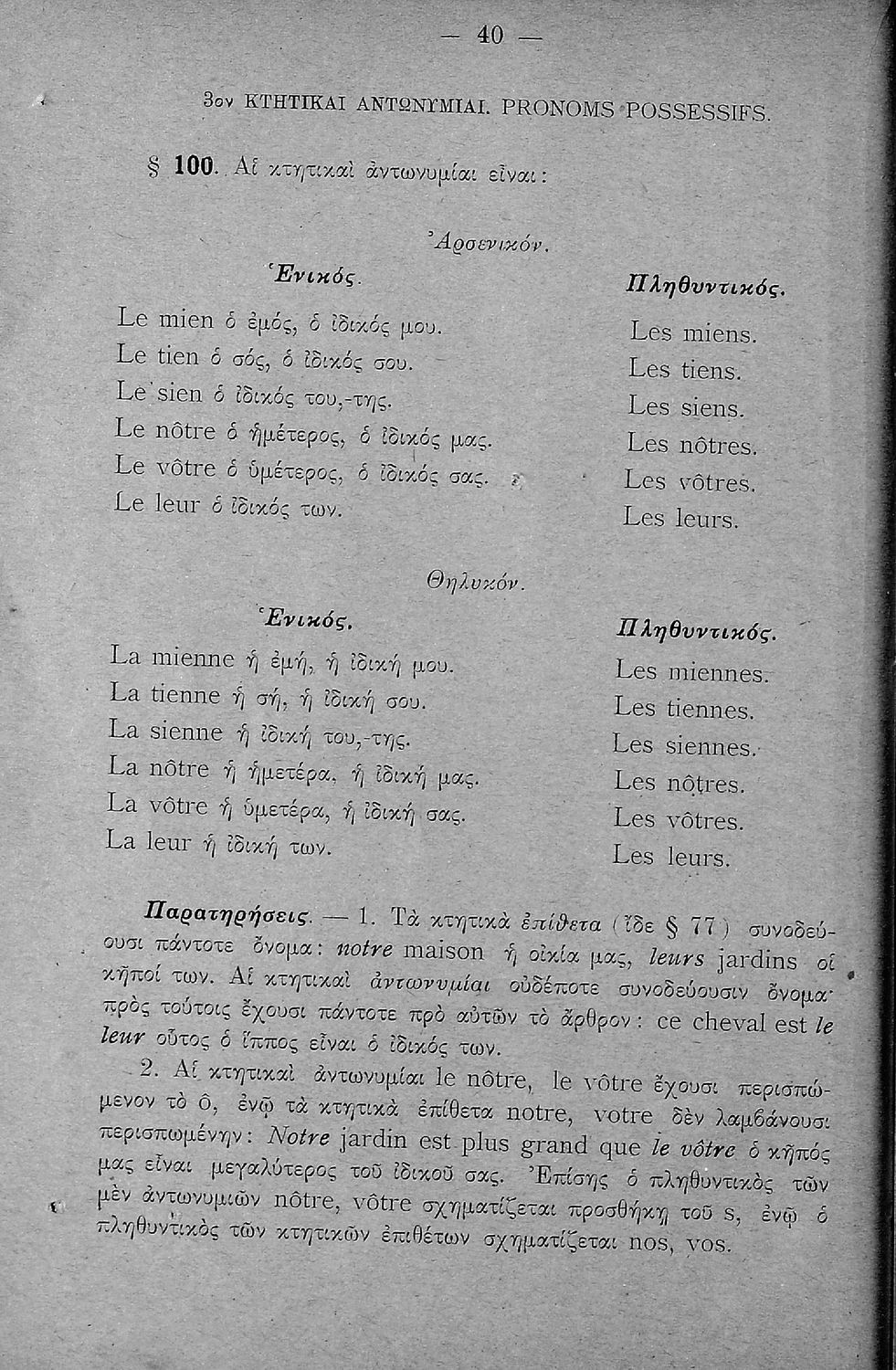 Γραμματική της Γαλλικής γλώσσας για τα Τετρατάξια Γυμνάσια, τη Γ΄ τάξη των Αστικών Σχολείων των Θηλέων και τα Διδασκαλεία της Δημοτικής Εκπαίδευσης που περιλαμβάνει θεωρία, ασκήσεις και λεξιλόγιο.