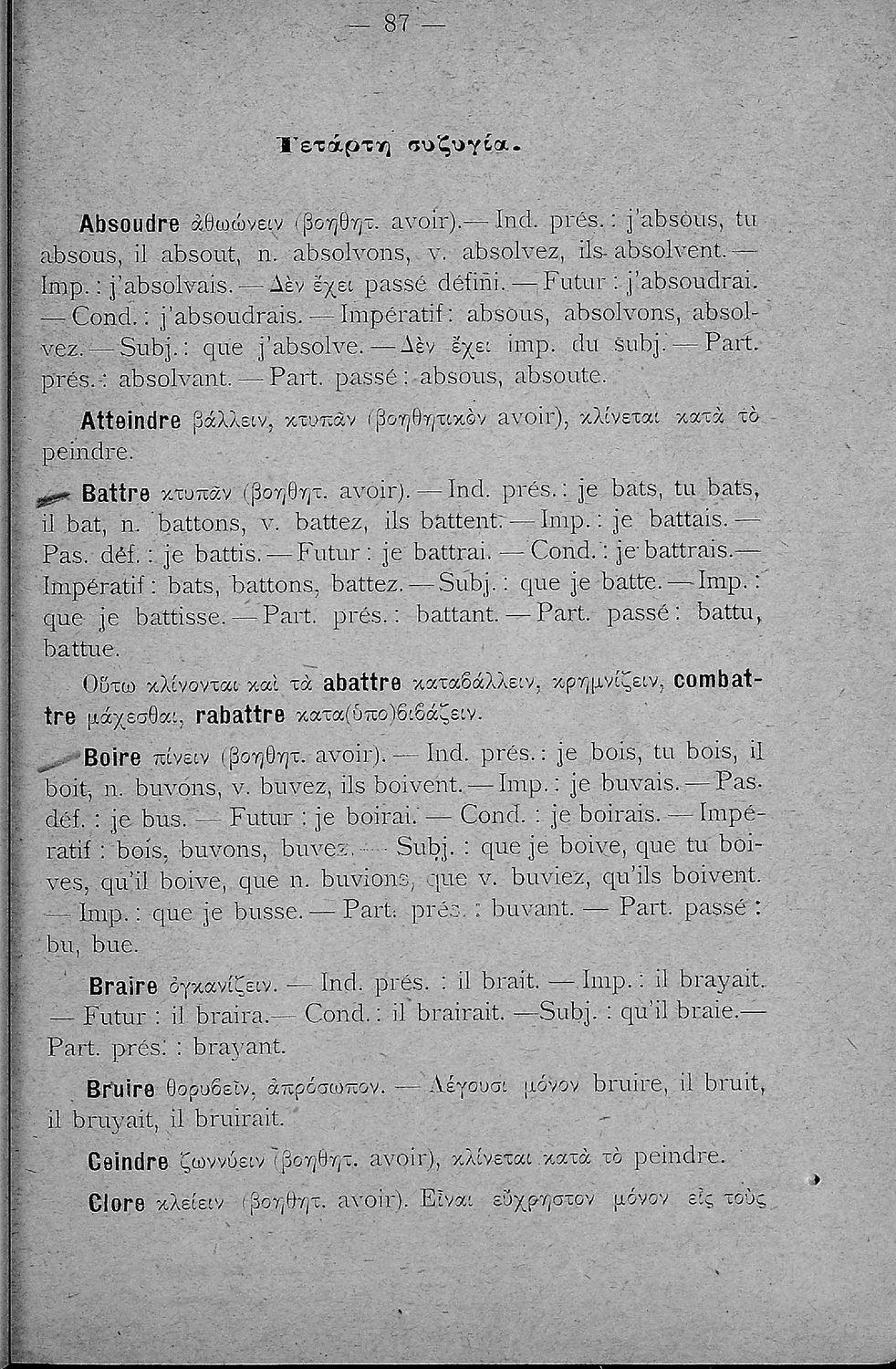 Σχολικό εγχειρίδιο Γαλλικών Β΄ και Γ' Ελληνικού Σχολείου, Αστικού Σχολείου και Παρθεναγωγείου που περιλαμβάνει κείμενα, κανόνες γραμματικής και συντακτικού, ερωτήσεις και ασκήσεις κατανόησης, και λεξιλογικά ...