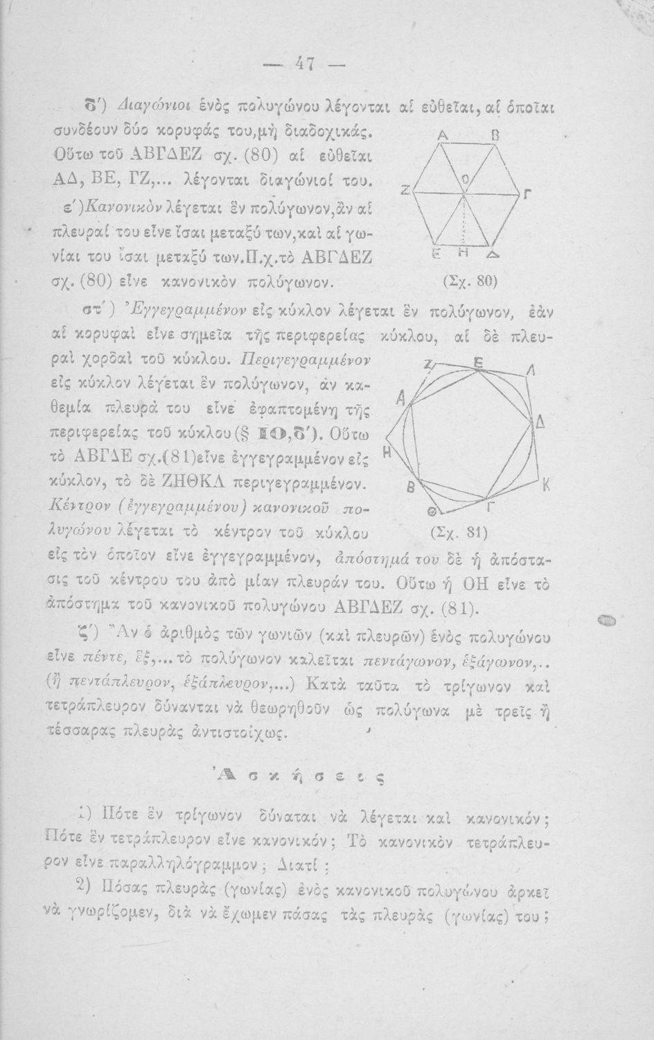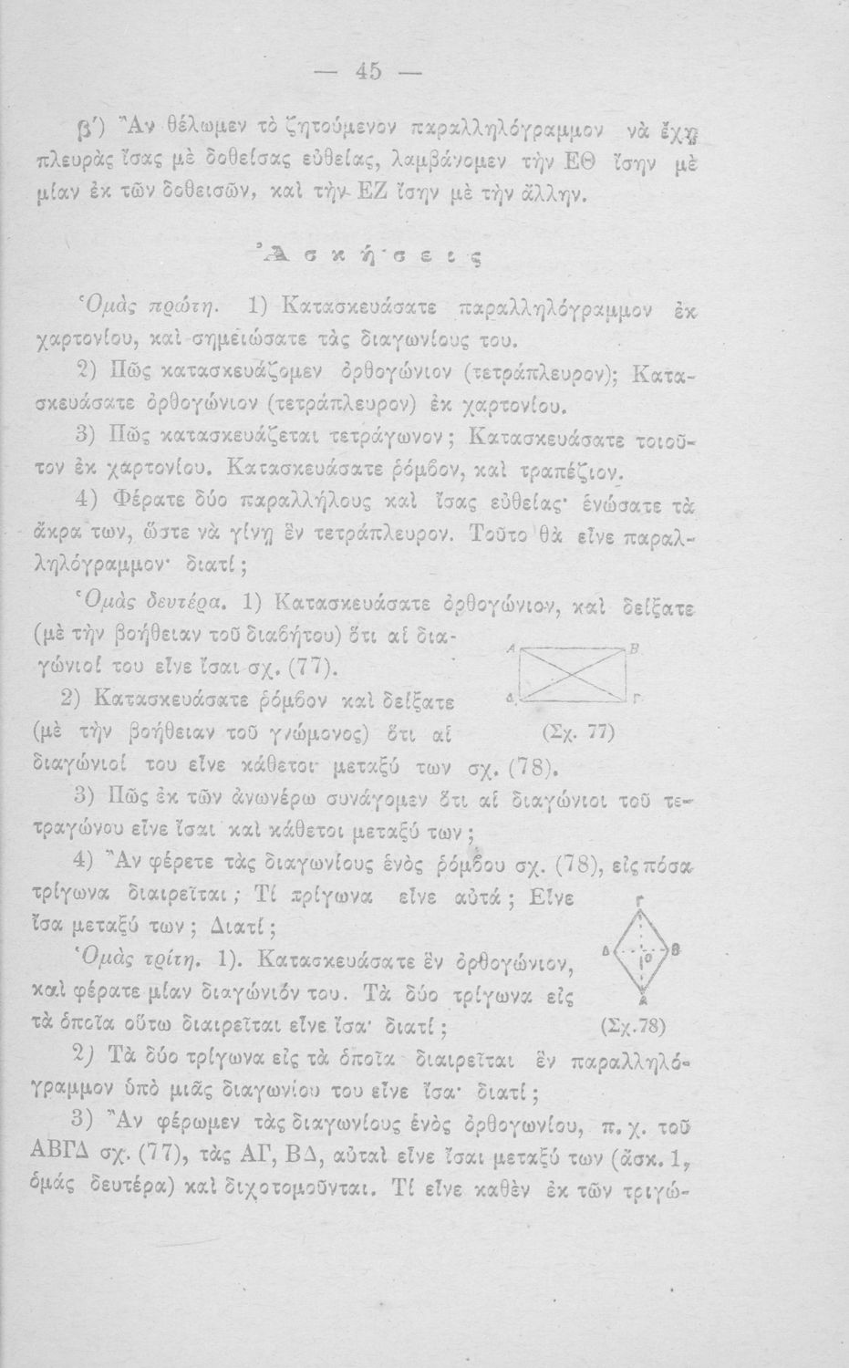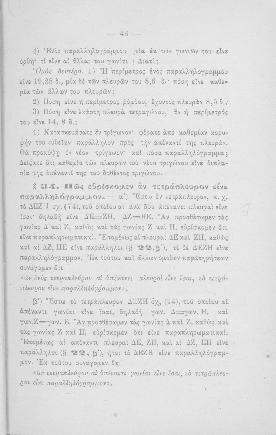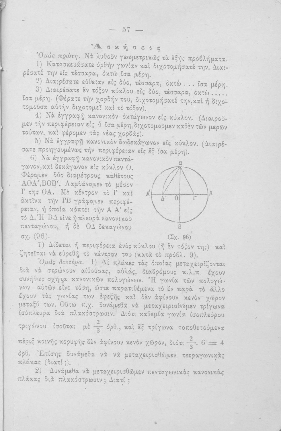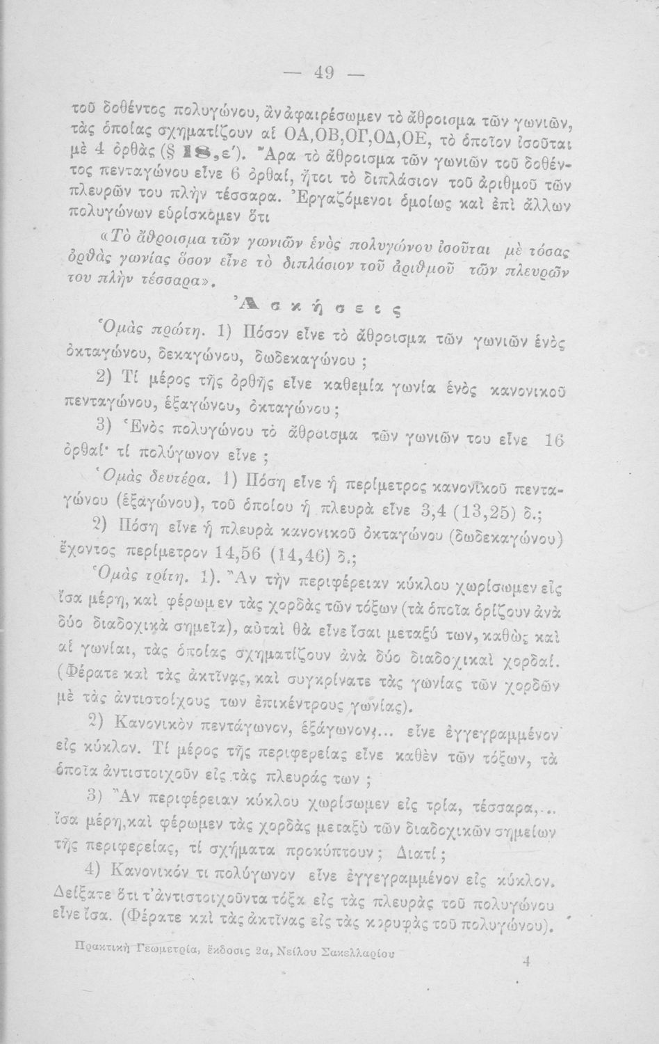 Σχολικό εγχειρίδιο Γεωμετρίας για τα Ελληνικά και Αστικά Σχολεία που περιέχει θεωρία και ασκήσεις και είναι χωρισμένο σε Επιπεδομετρία και Στερεομετρία.