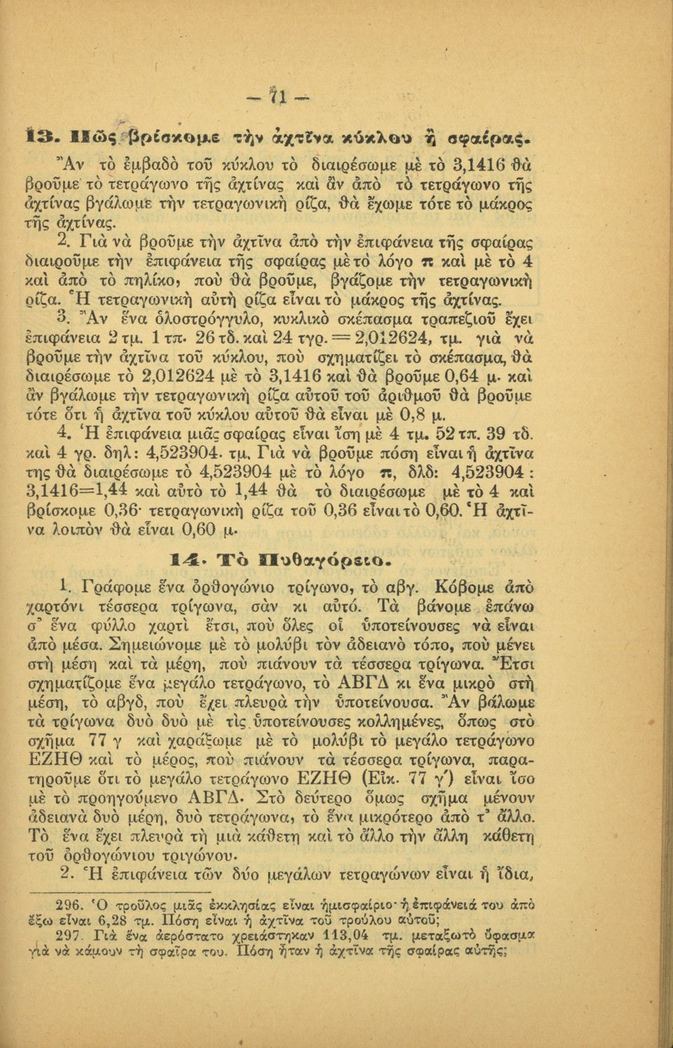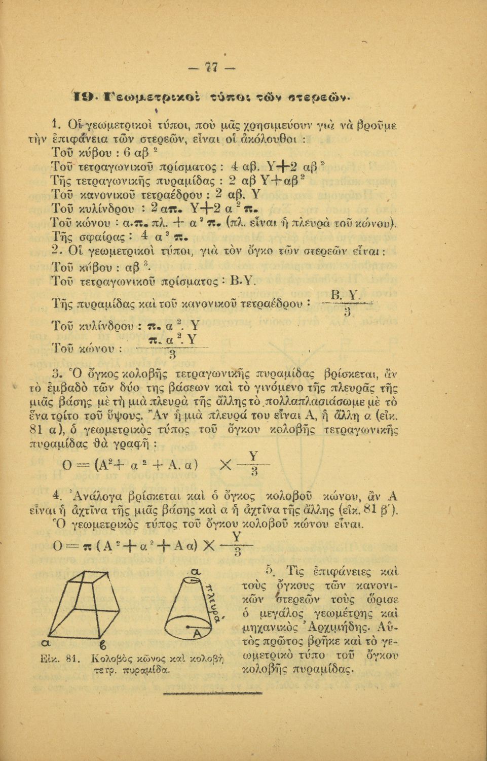 Σχολικό εγχειρίδιο Γεωμετρίας για την Α΄, Β΄ και Γ΄ τάξη των Ελληνικών και Αστικών Σχολείων και Παρθεναγωγείων που είναι χωρισμένο σε Επιπεδομετρία και Στερεομετρία και περιλαμβάνει θεωρία και ασκήσεις.