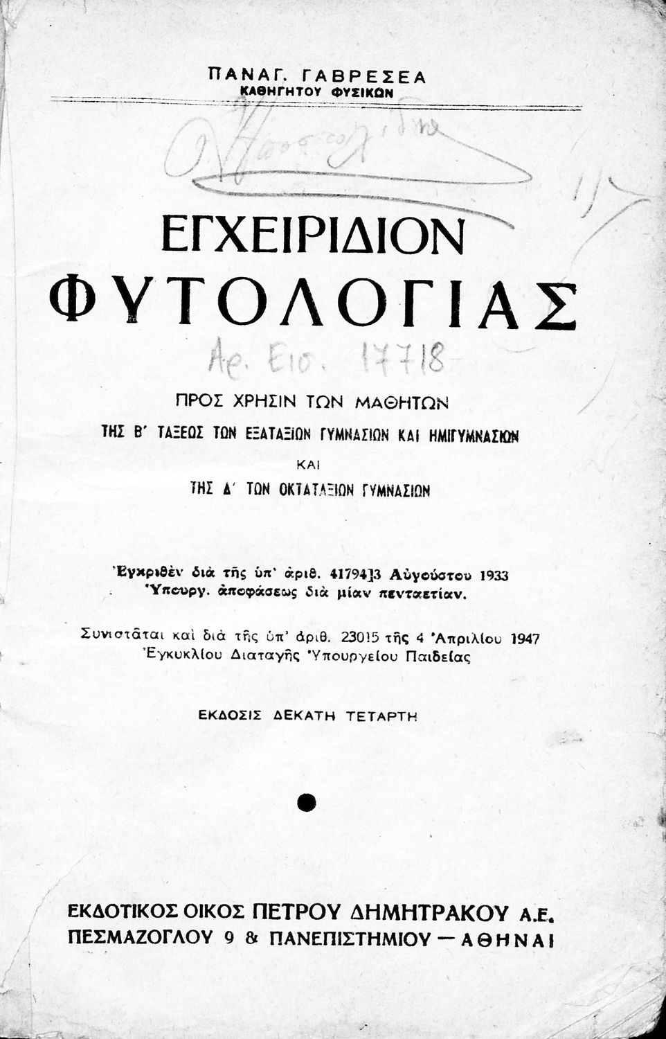 Σχολικό εγχειρίδιο Φυτολογίας για τη Β΄ τάξη των Εξαταξίων Γυμνασίων και Ημιγυμνασίων και τη Δ΄ τάξη των οκταταξίων Γυμνασίων που εξετάζει φυτά της Ελλάδας και παραθέτει στοιχεία γενικής φυτολογίας για την ...