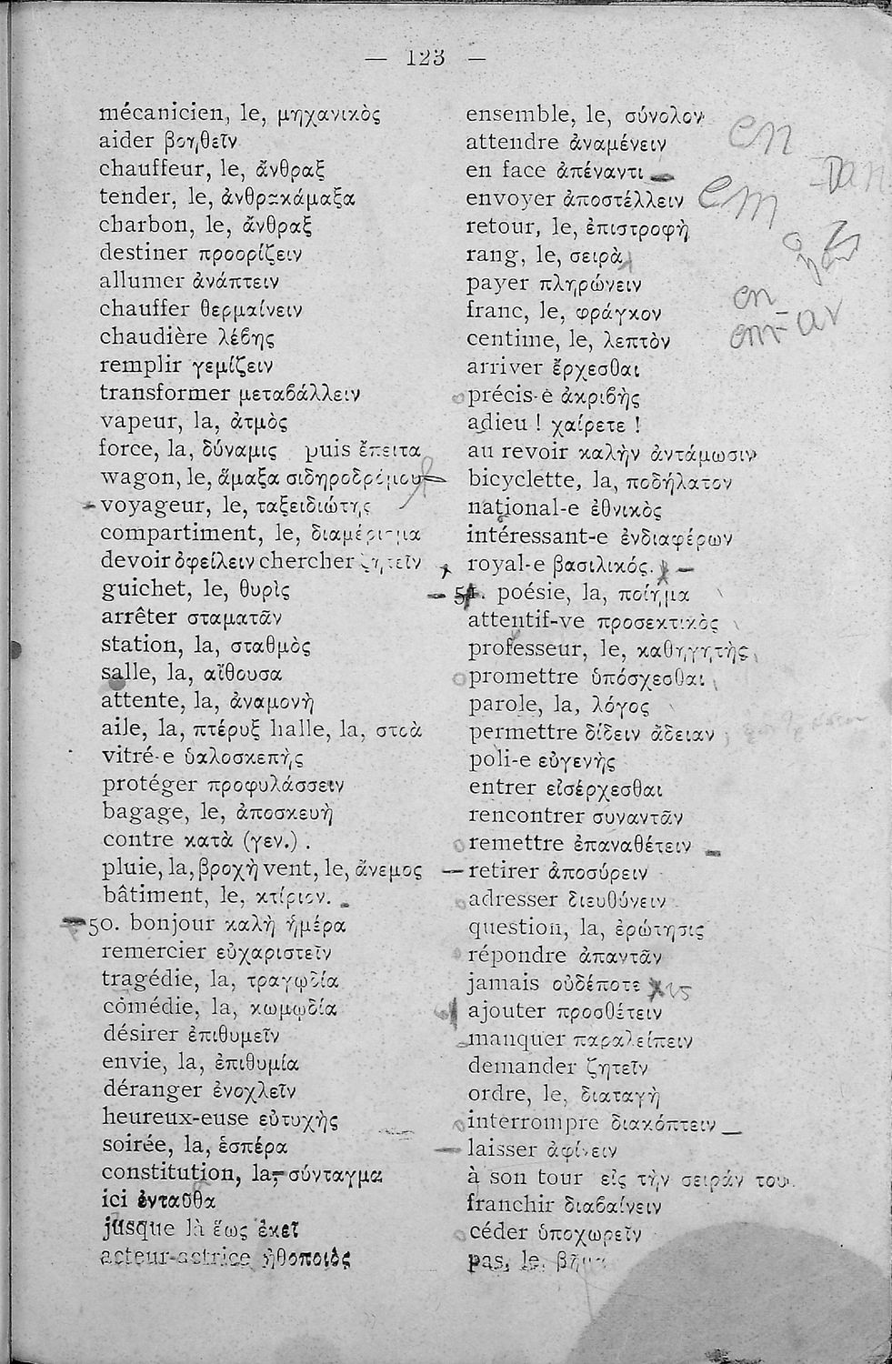 Σχολικό εγχειρίδιο Γαλλικών για τις Β΄ και Γ' Ελληνικού Σχολείου, Αστικού Σχολείου και Παρθεναγωγείου που περιλαμβάνει κείμενα, κανόνες γραμματικής και συντακτικού, λεξιλογικά και πραγματολογικά σχόλια.