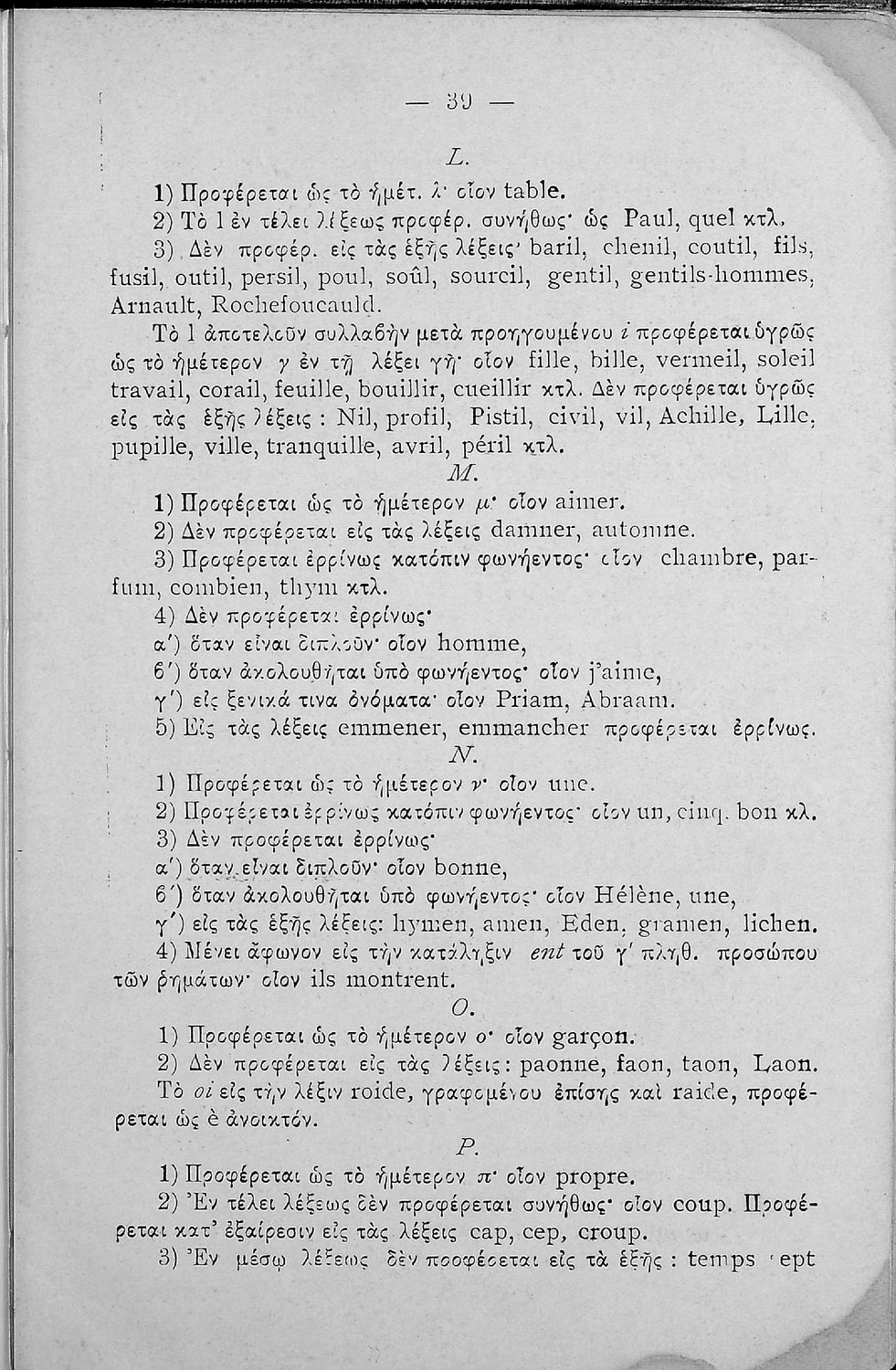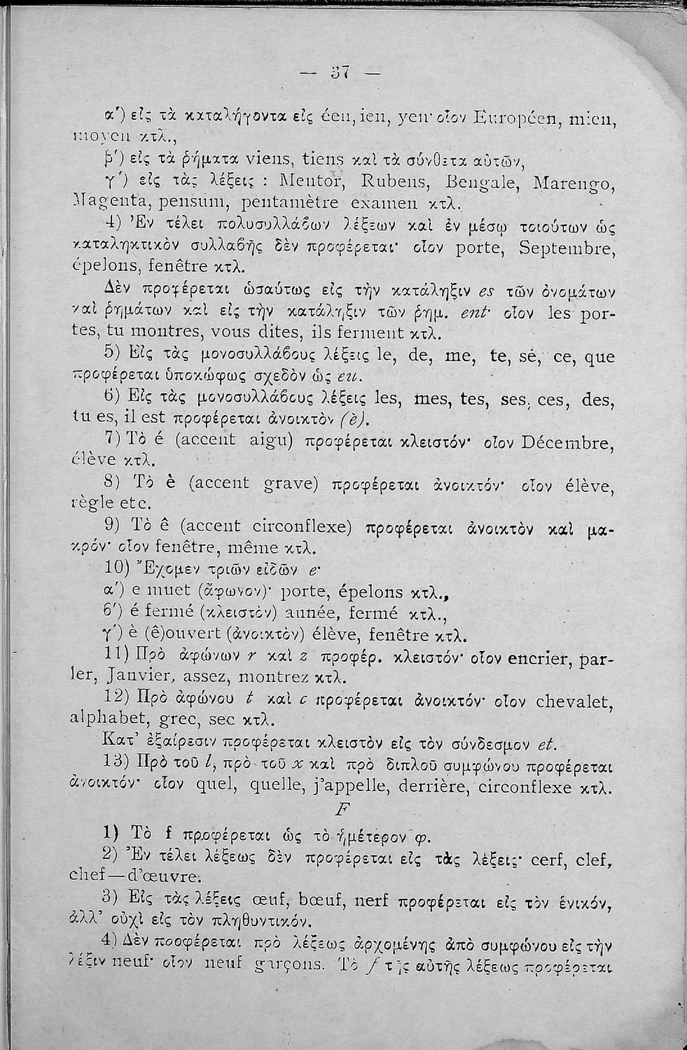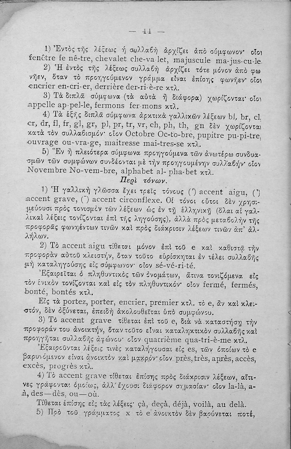 Σχολικό εγχειρίδιο για τα Ελληνικά Σχολεία και Παρθεναγωγεία περιλαμβάνει τους βασικούς κανόνες γραμματικής της γαλλικής γλώσσας.