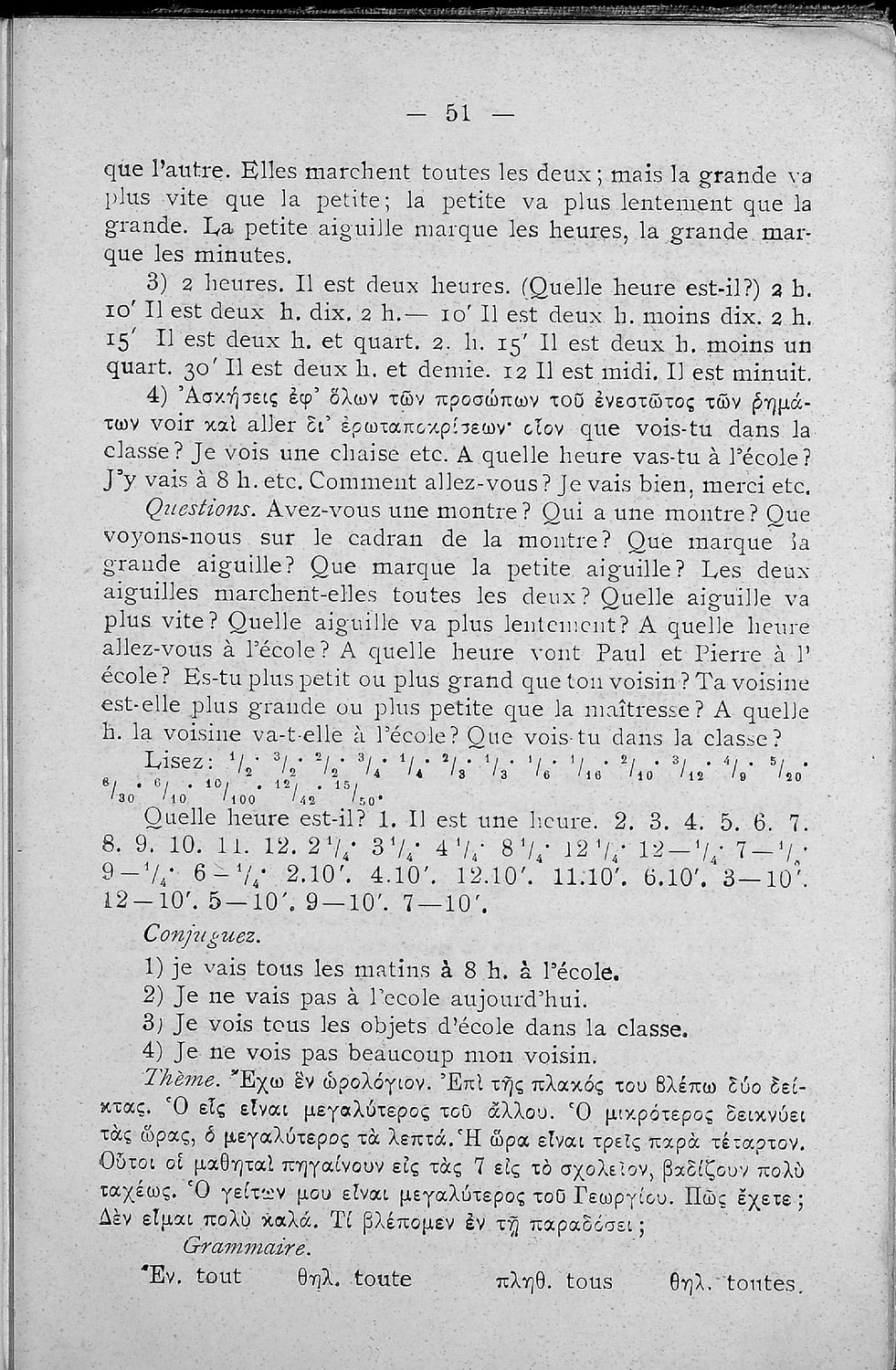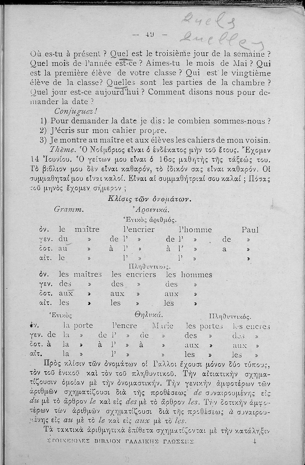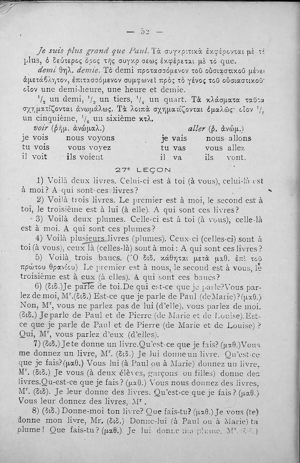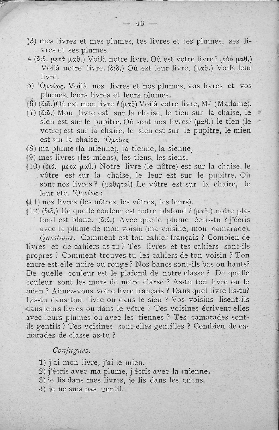 Σχολικό εγχειρίδιο Γαλλικών για τις Β΄ και Γ' Ελληνικού Σχολείου, Αστικού Σχολείου και Παρθεναγωγείου που περιλαμβάνει κείμενα, κανόνες γραμματικής και συντακτικού, και λεξιλογικά και πραγματολογικά σχόλια.