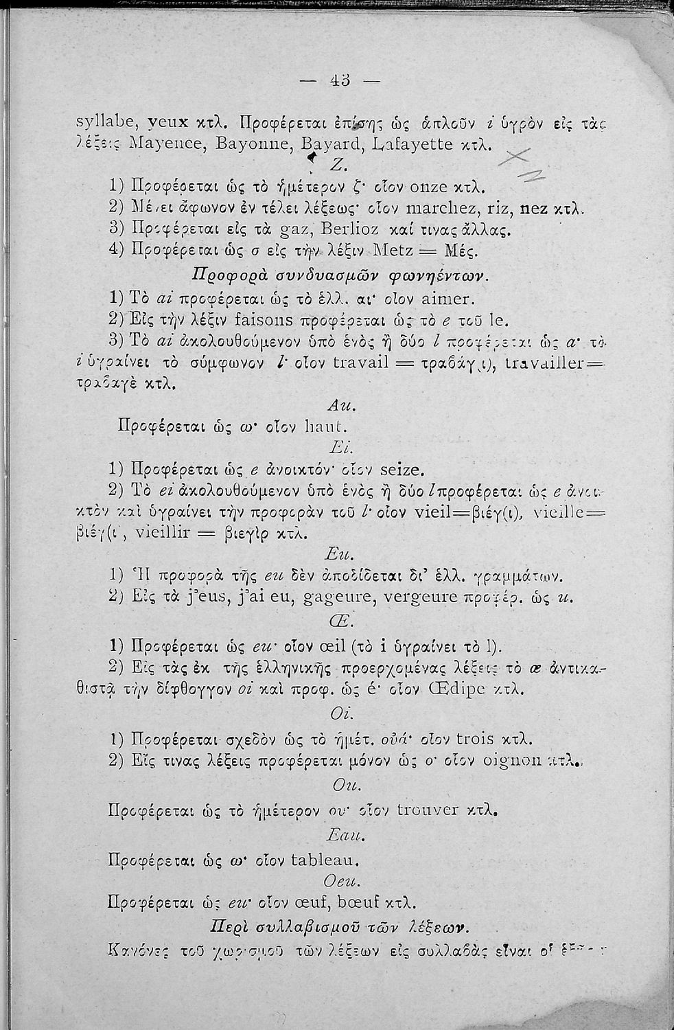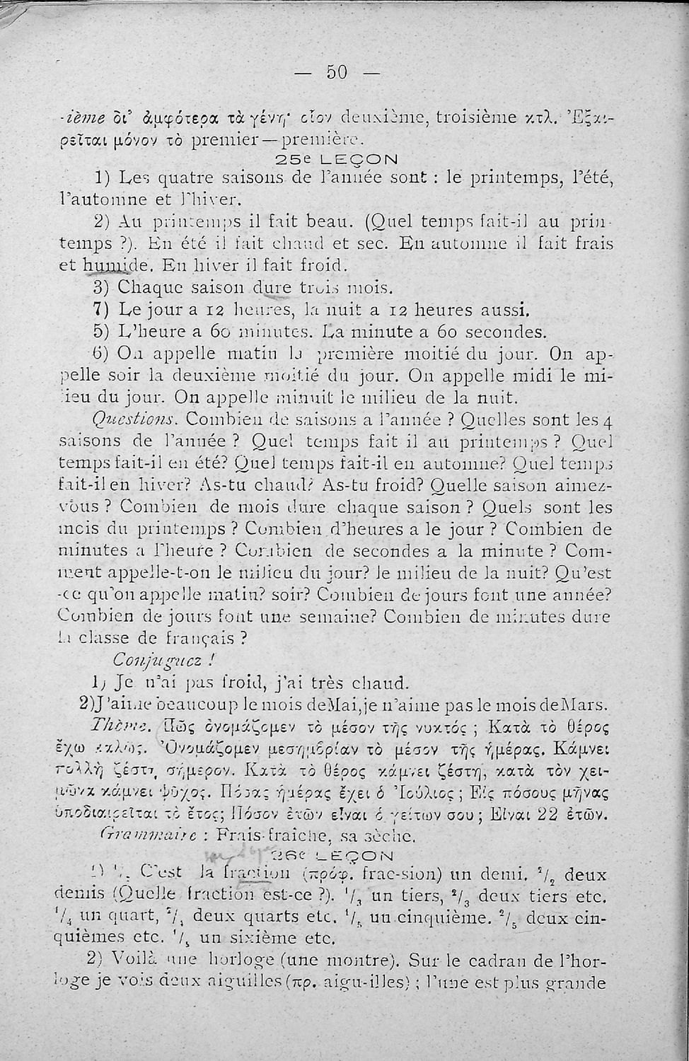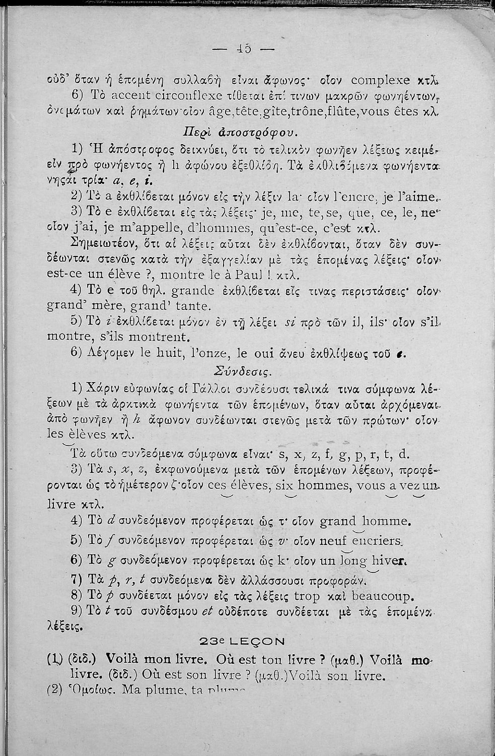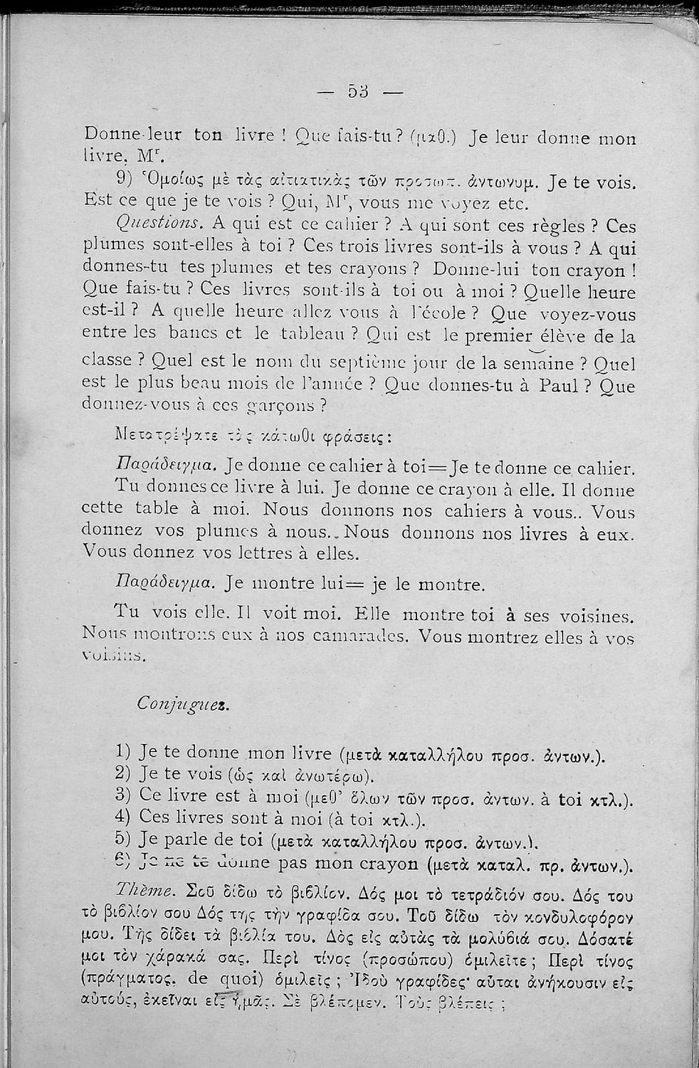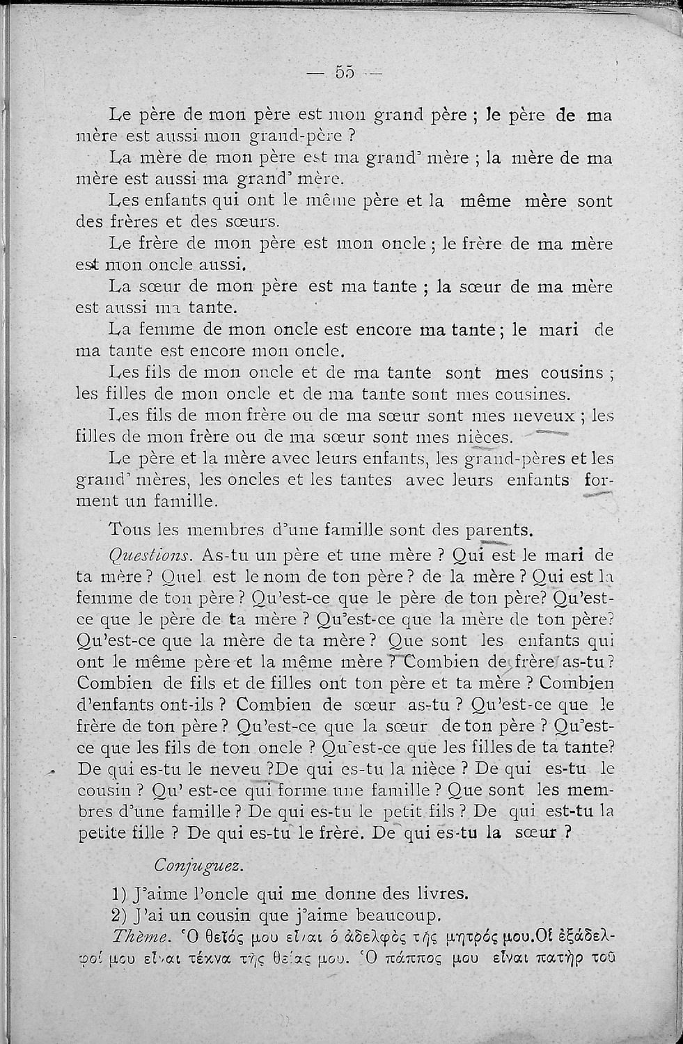Σχολικό εγχειρίδιο Γαλλικών για τις Β΄ και Γ' Ελληνικού Σχολείου, Αστικού Σχολείου και Παρθεναγωγείου που περιλαμβάνει κείμενα, κανόνες γραμματικής και συντακτικού, και λεξιλογικά και πραγματολογικά σχόλια.