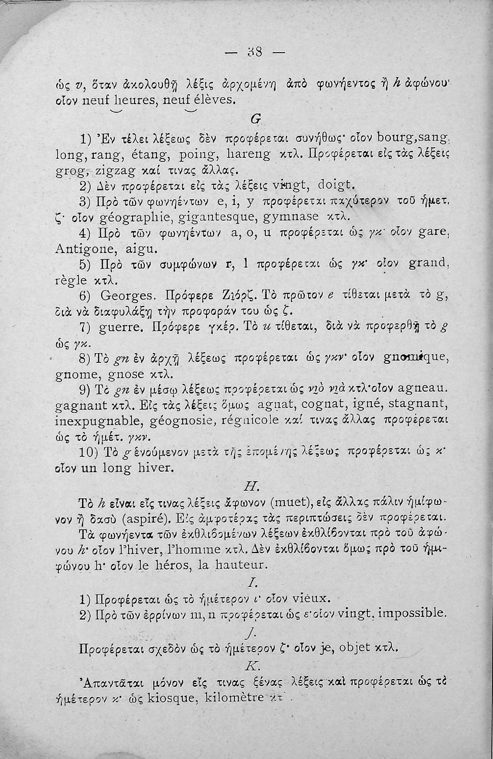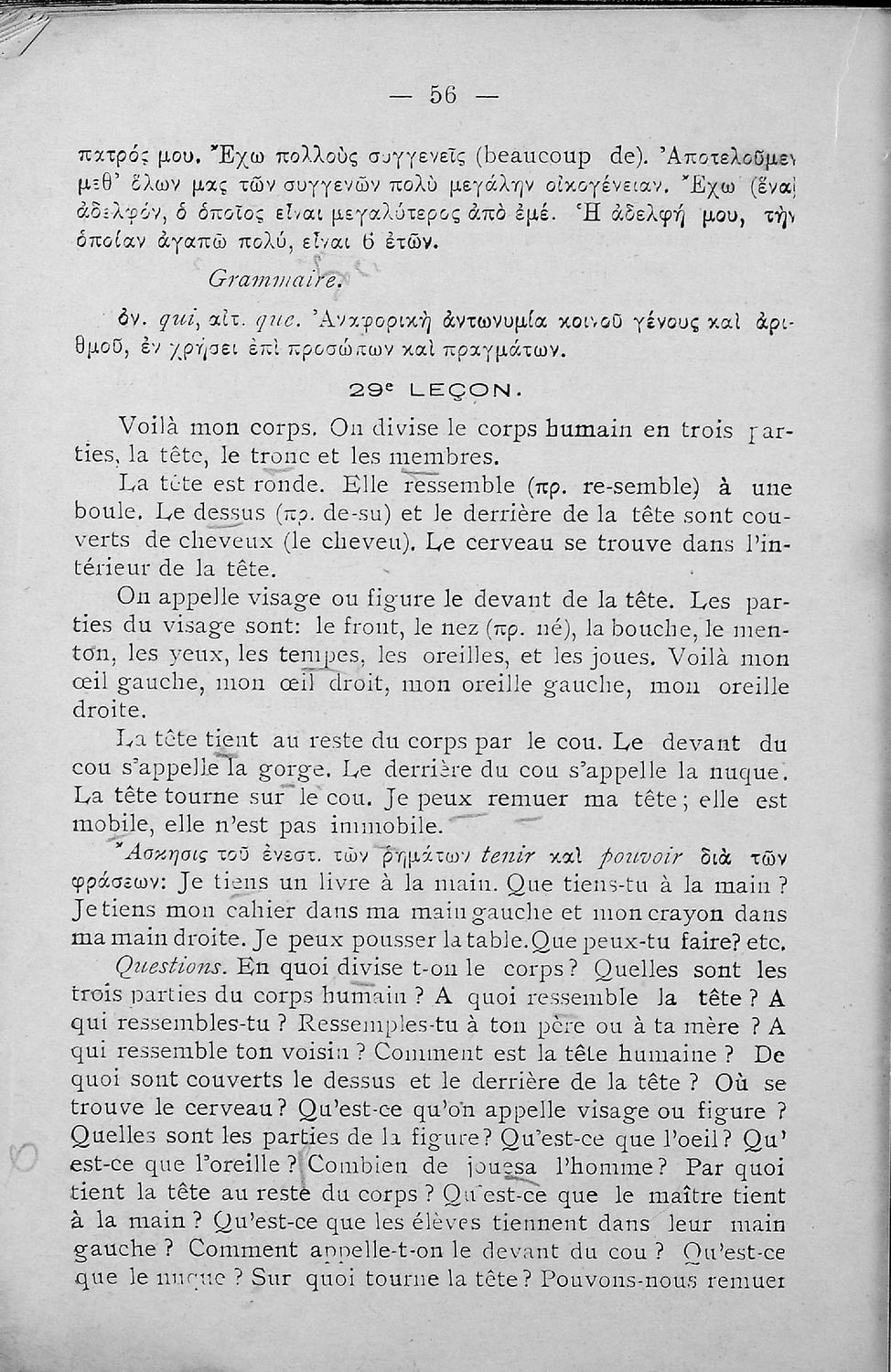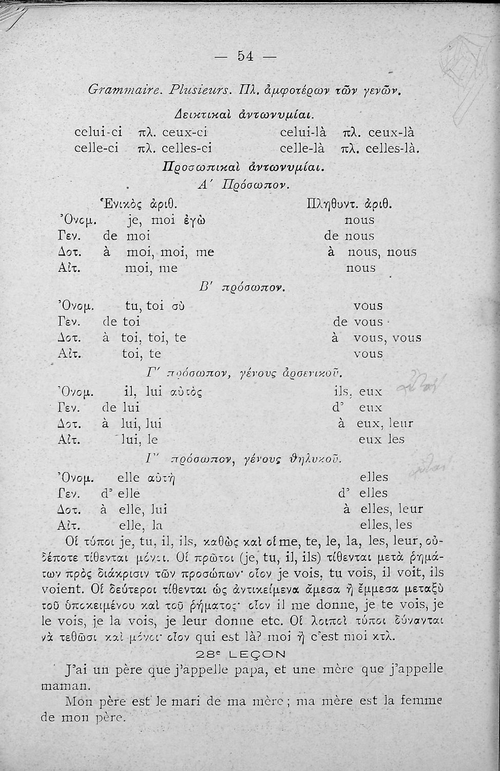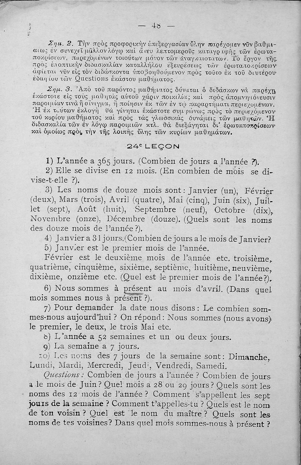 Σχολικό εγχειρίδιο Γαλλικών για τις Β΄ και Γ' Ελληνικού Σχολείου, Αστικού Σχολείου και Παρθεναγωγείου που περιλαμβάνει κείμενα, κανόνες γραμματικής και συντακτικού, και λεξιλογικά και πραγματολογικά σχόλια.