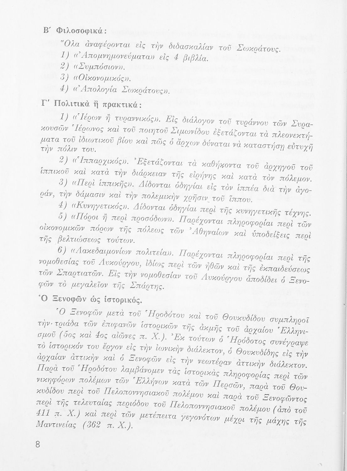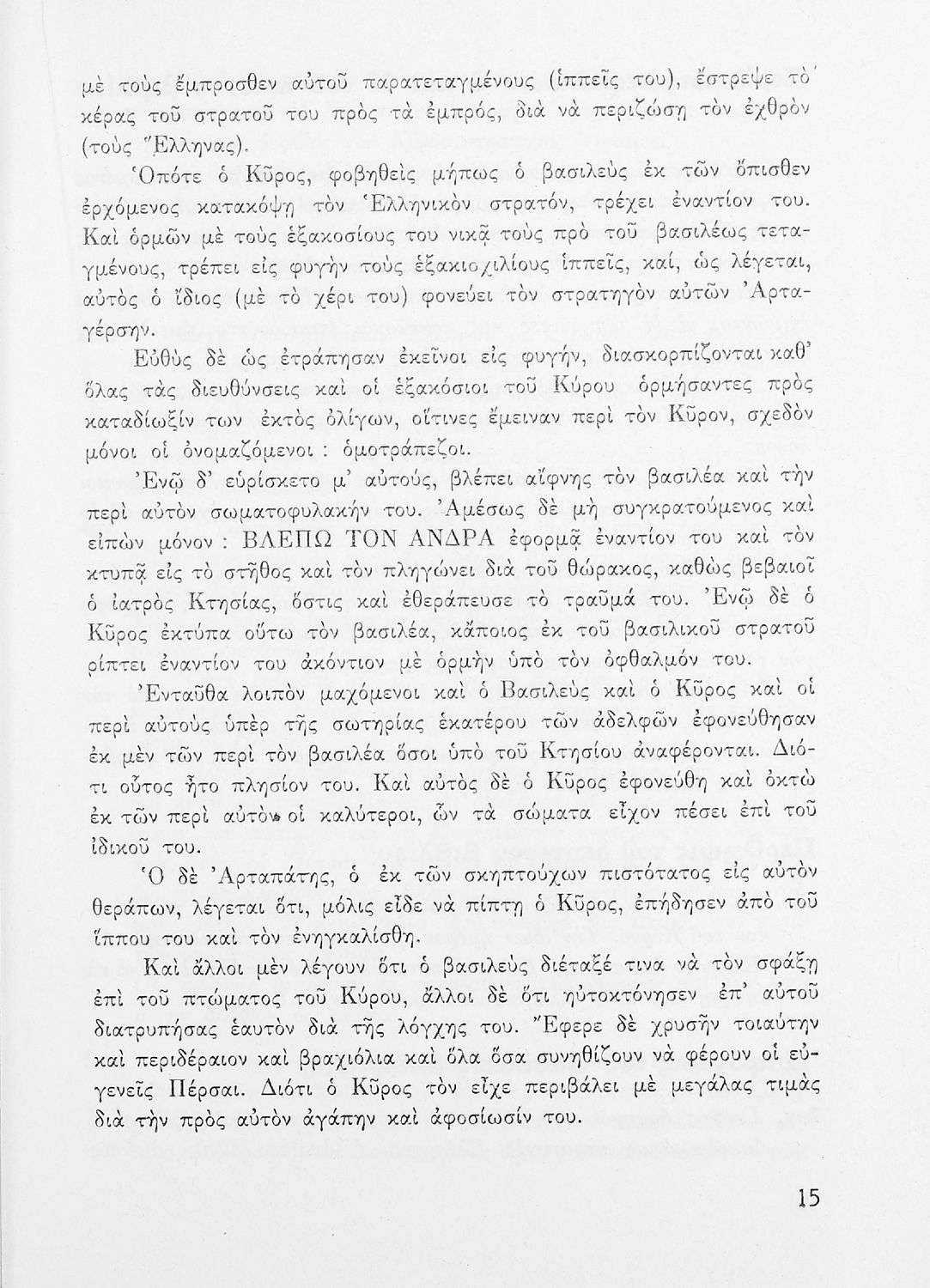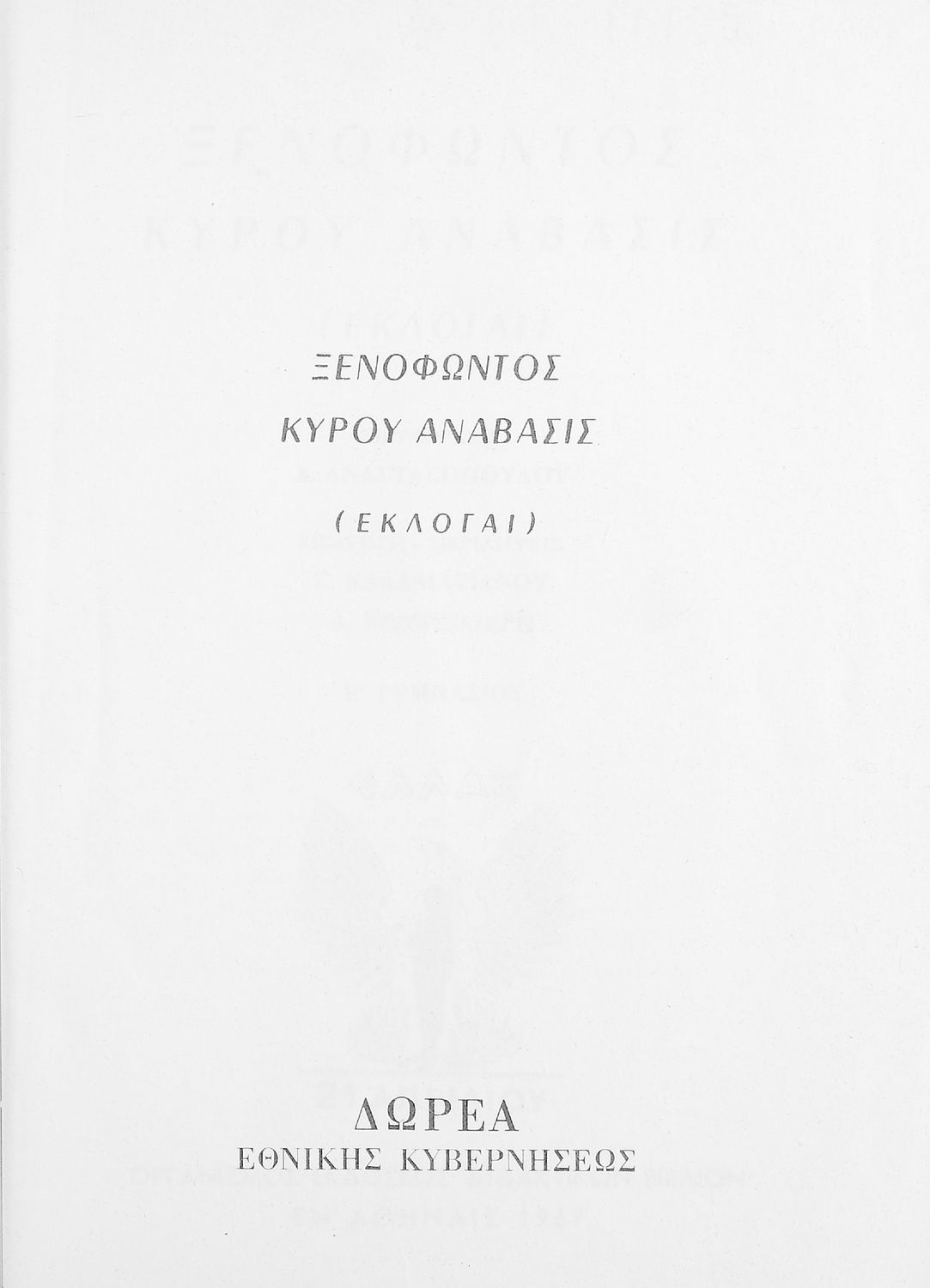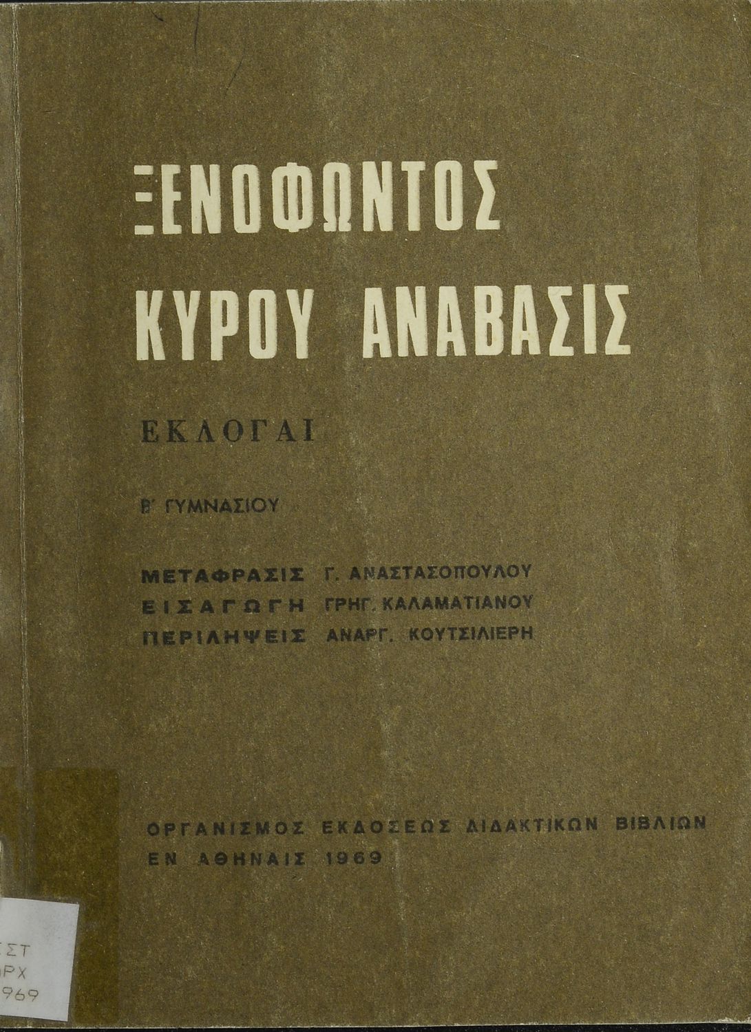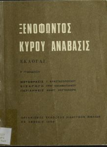 Σχολικό εγχειρίδιο Αρχαίων Ελληνικών για τη Β΄ Γυμνασίου. Πρόκειται για βιβλίο αρχαίων σε μετάφραση από το έργο του Ξενοφώντα. Στο βιβλίο απεικονίζεται το σύμβολο της επταετίας.