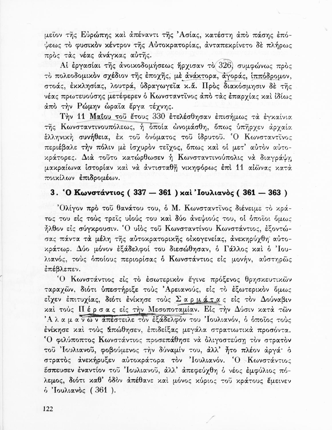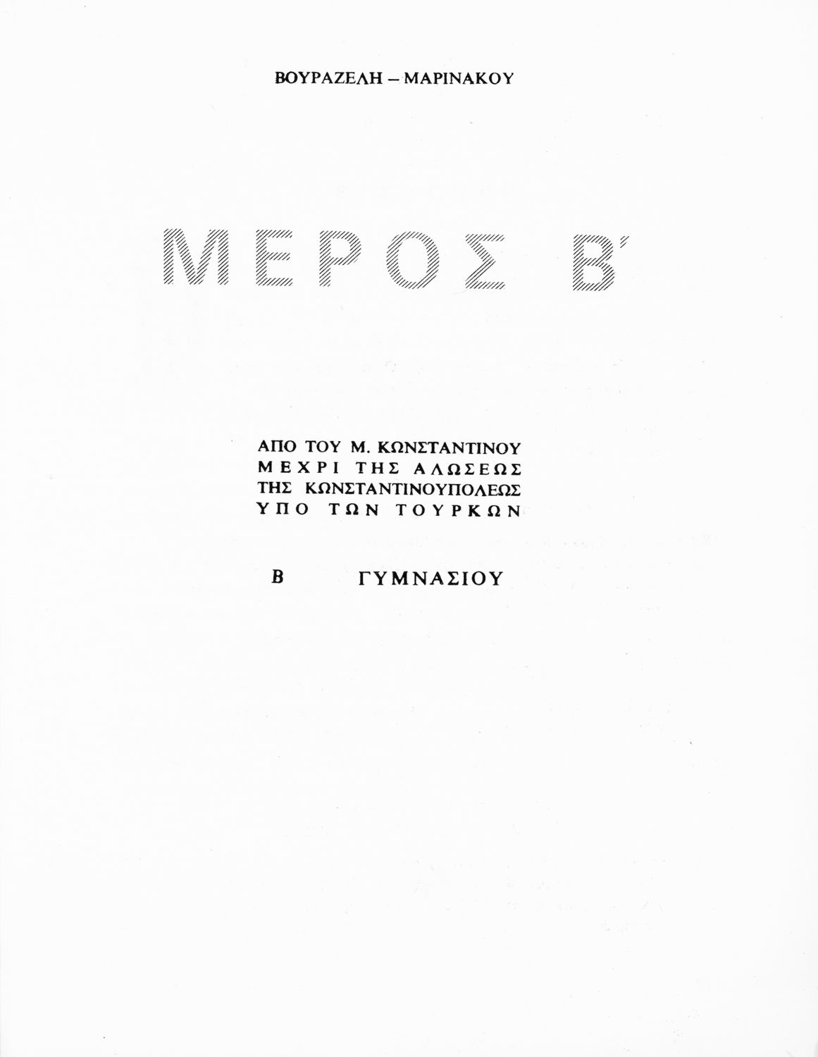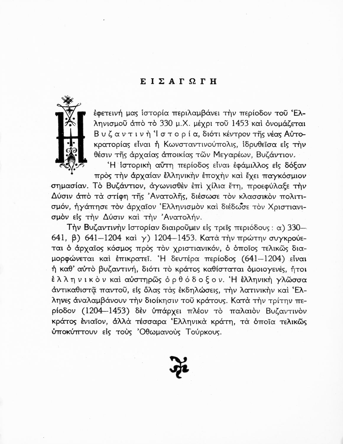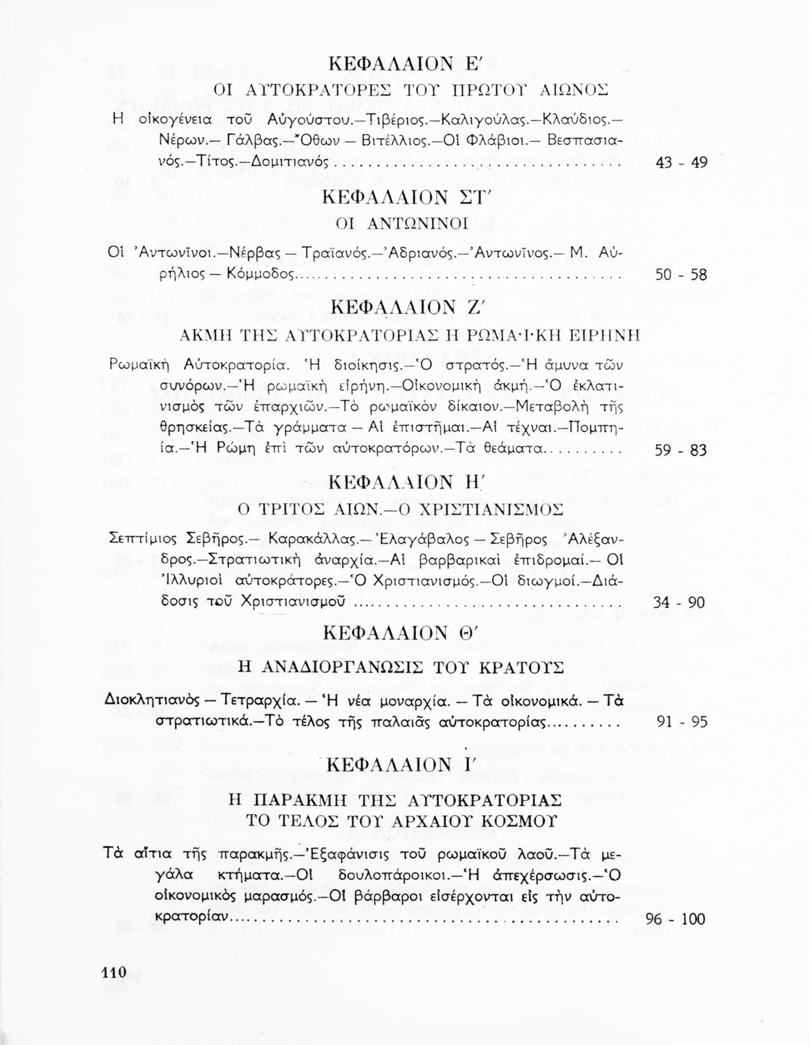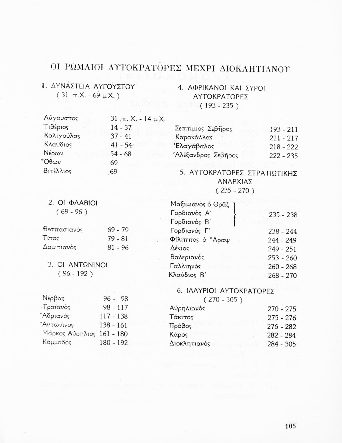 Σχολικό εγχειρίδιο Ιστορίας Β΄ και Ε΄ Γυμνασίου που καλύπτει την περίοδο από την άνοδο του Μ. Κωνσταντίνου στο θρόνο μέχρι και την άλωση της Κωνσταντινούπολης. Παρουσιάζει και τα πνευματικά και καλλιτεχνικά ρεύματα της περιόδου. Φέρει το σύμβολο της δικτατορίας.