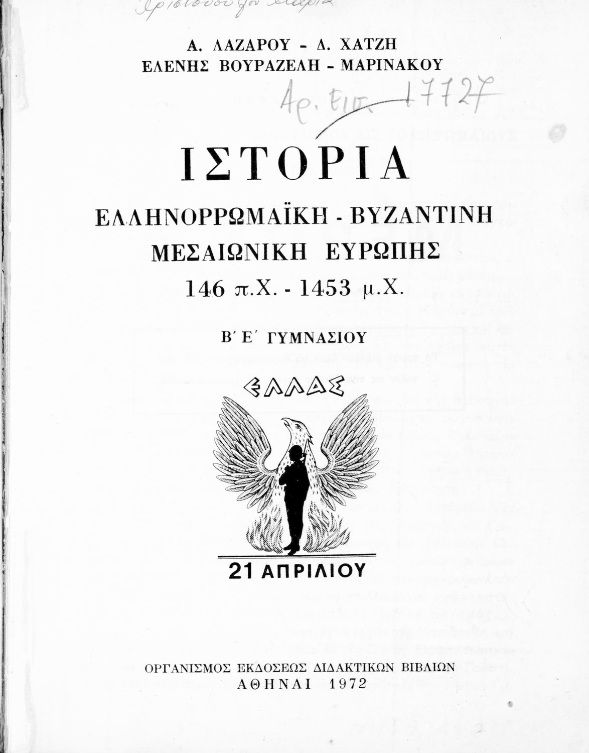 Παρουσίαση περιεχομένου: Σχολικό εγχειρίδιο Ιστορίας Β΄ και Ε΄ Γυμνασίου που καλύπτει την περίοδο από την άνοδο του Μ. Κωνσταντίνου στο θρόνο μέχρι και την άλωση της Κωνσταντινούπολης. Παρουσιάζει και τα πνευματικά και καλλιτεχνικά ρεύματα της περιόδου. Φέρει το σύμβολο της δικτατορίας.