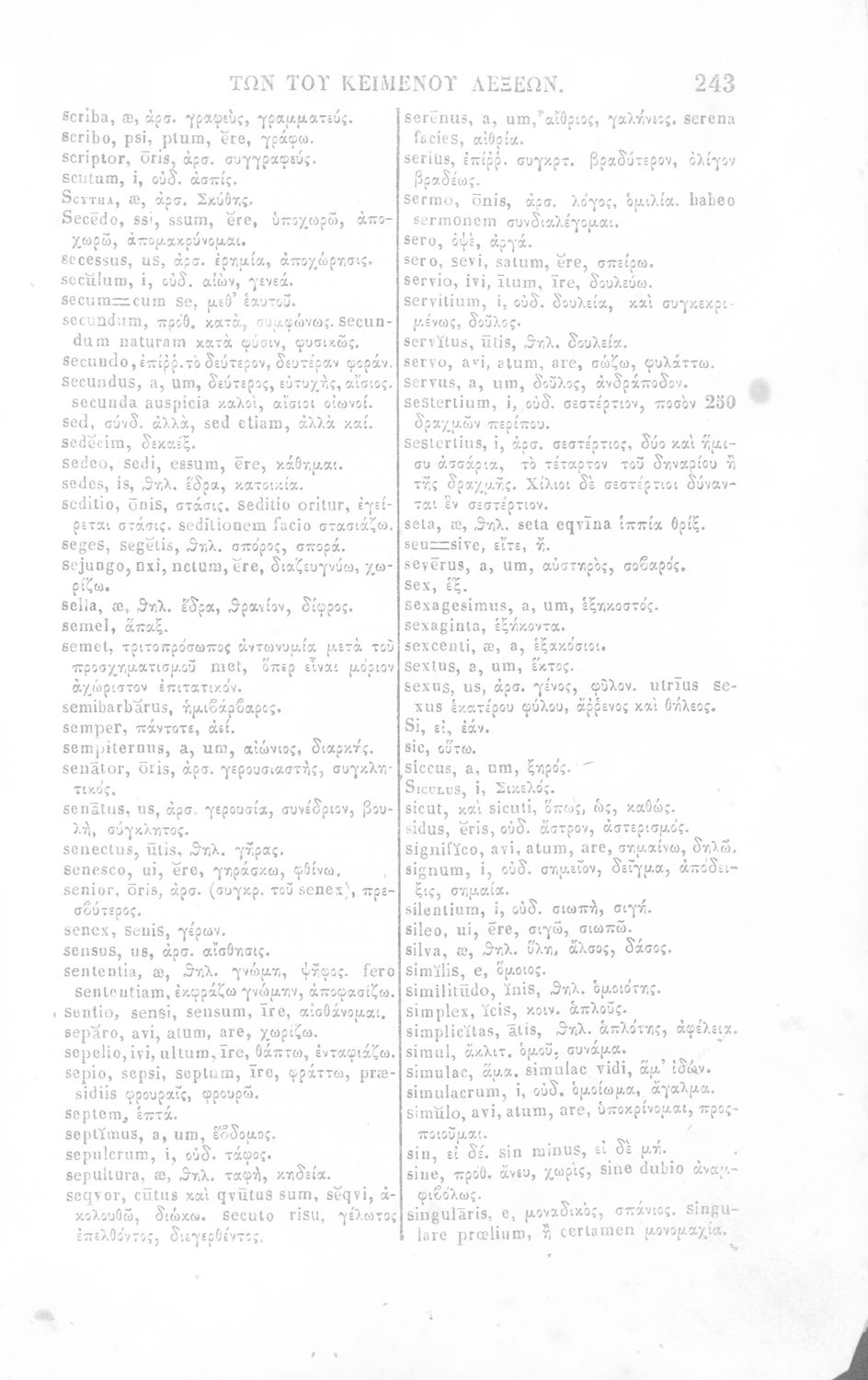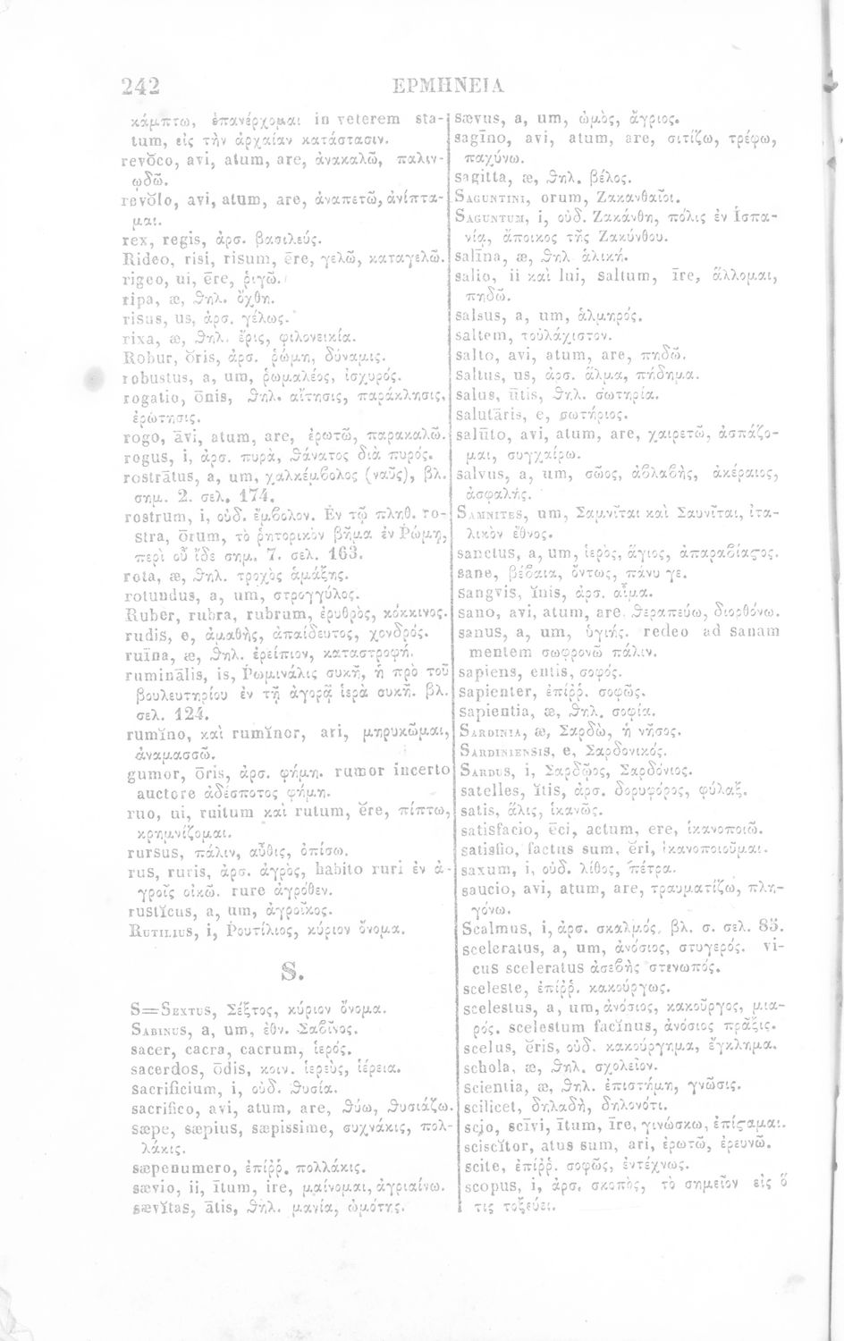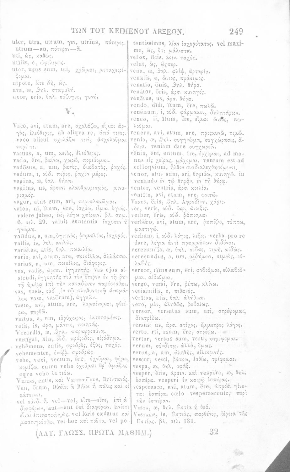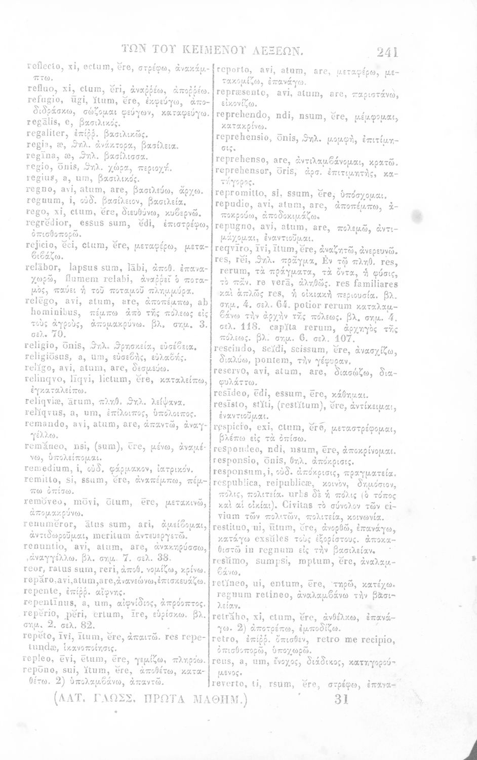 Σχολικό εγχειρίδιο Λατινικών Γυμνασίου που περιλαμβάνει γραμματική και συντακτικό και είναι χωρισμένο σε φθογγολογικό, τυπολογικό και ετυμολογικό μέρος.