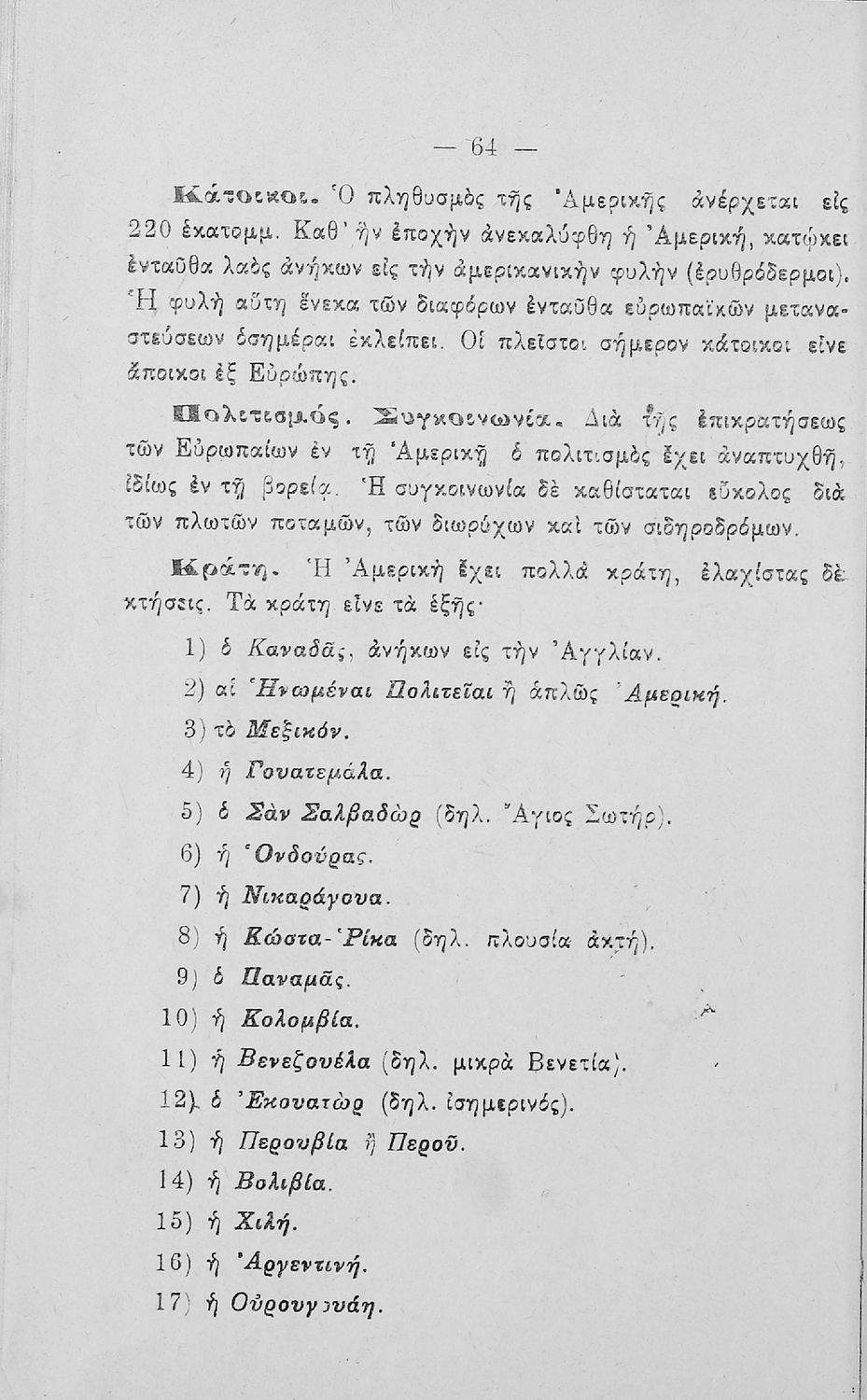 Σχολικό εγχειρίδιο Γεωγραφίας Α' Ελληνικού Σχολείου που περιλαμβάνει στοιχεία ανθρωπογεωγραφίας, μαθηματικής, και φυσικής γεωγραφίας και εξετάζει ενδεικτικά κράτη από τις πέντε ηπείρους από πολιτική, γεωφυσική και οικονομική άποψη.