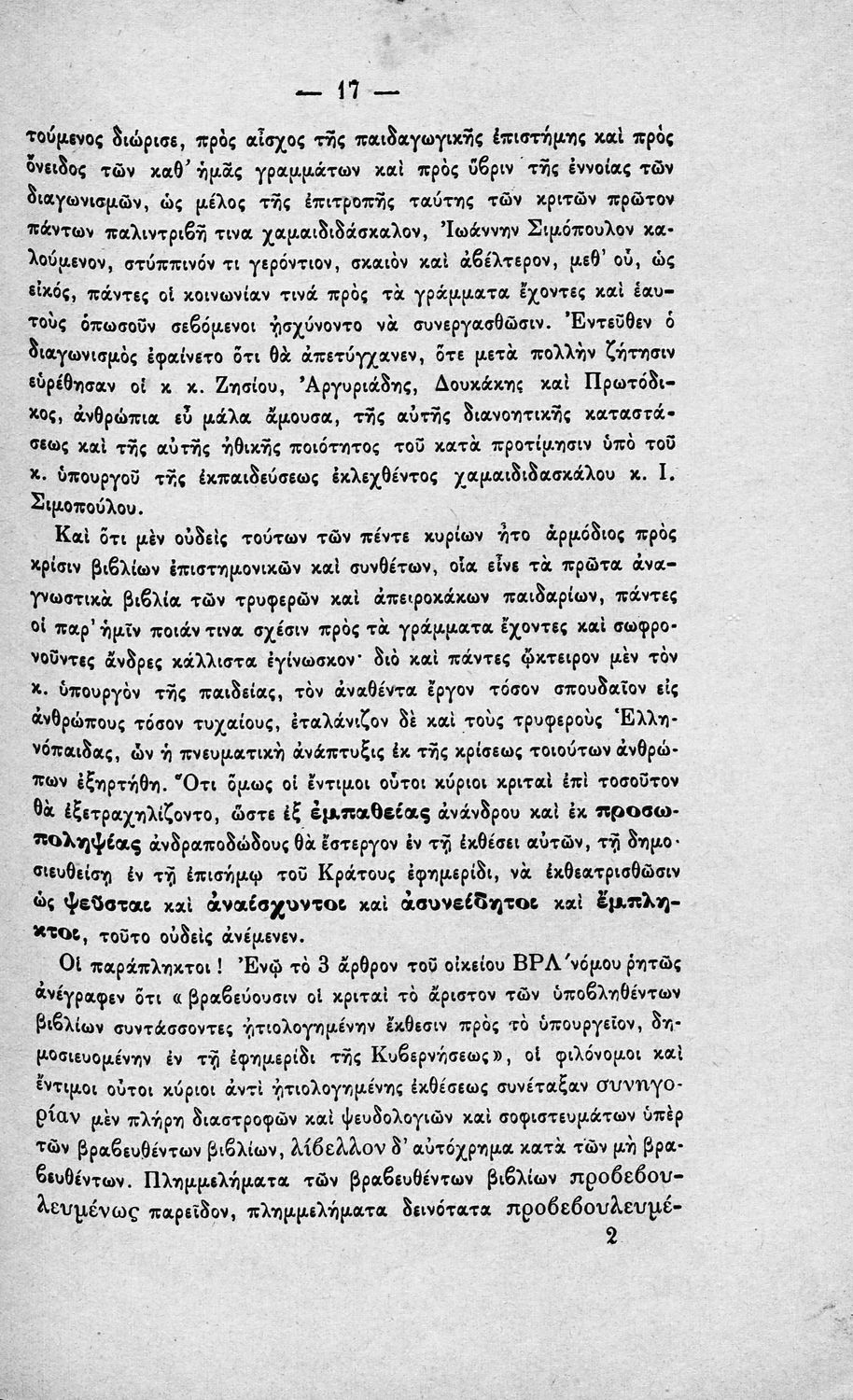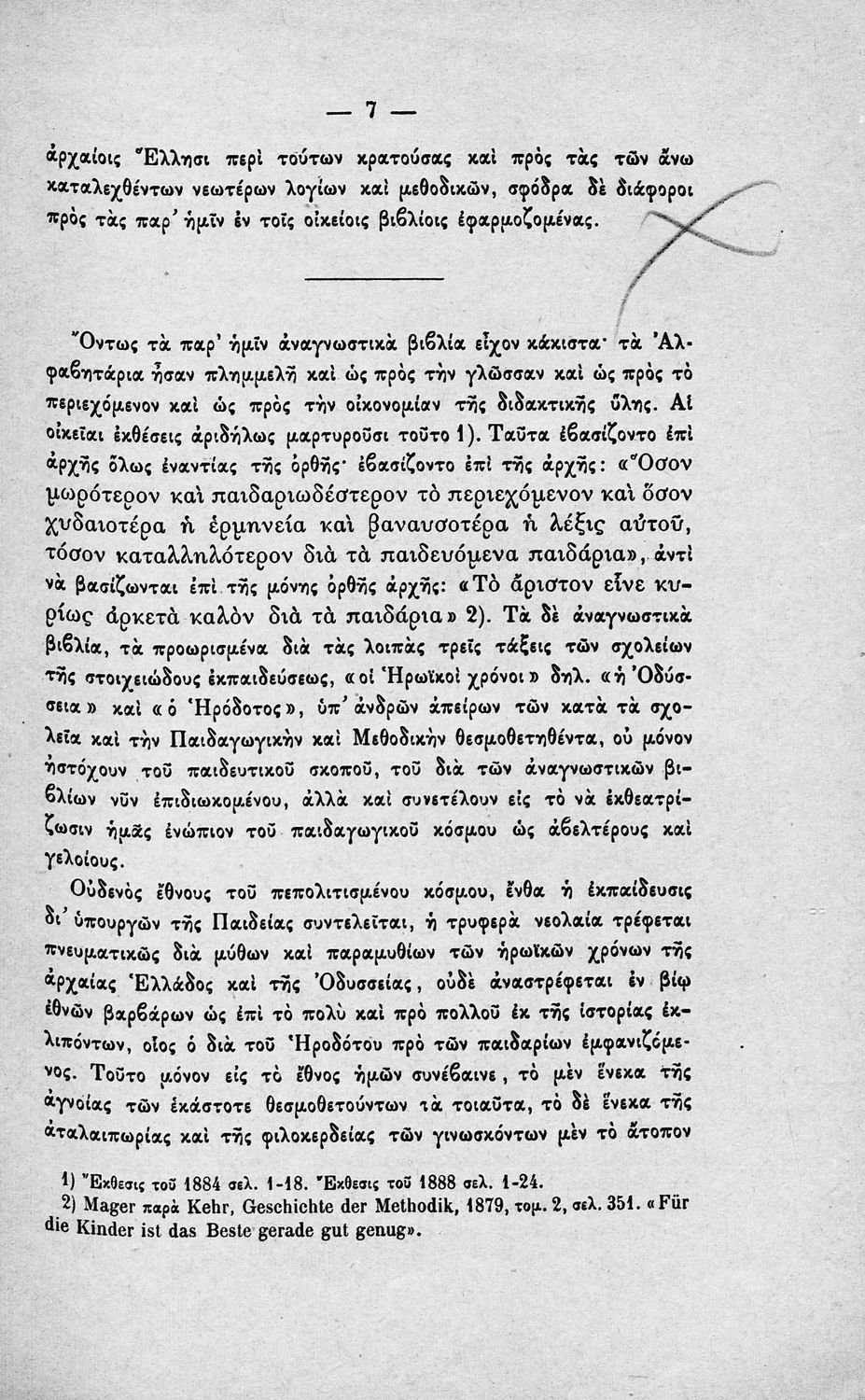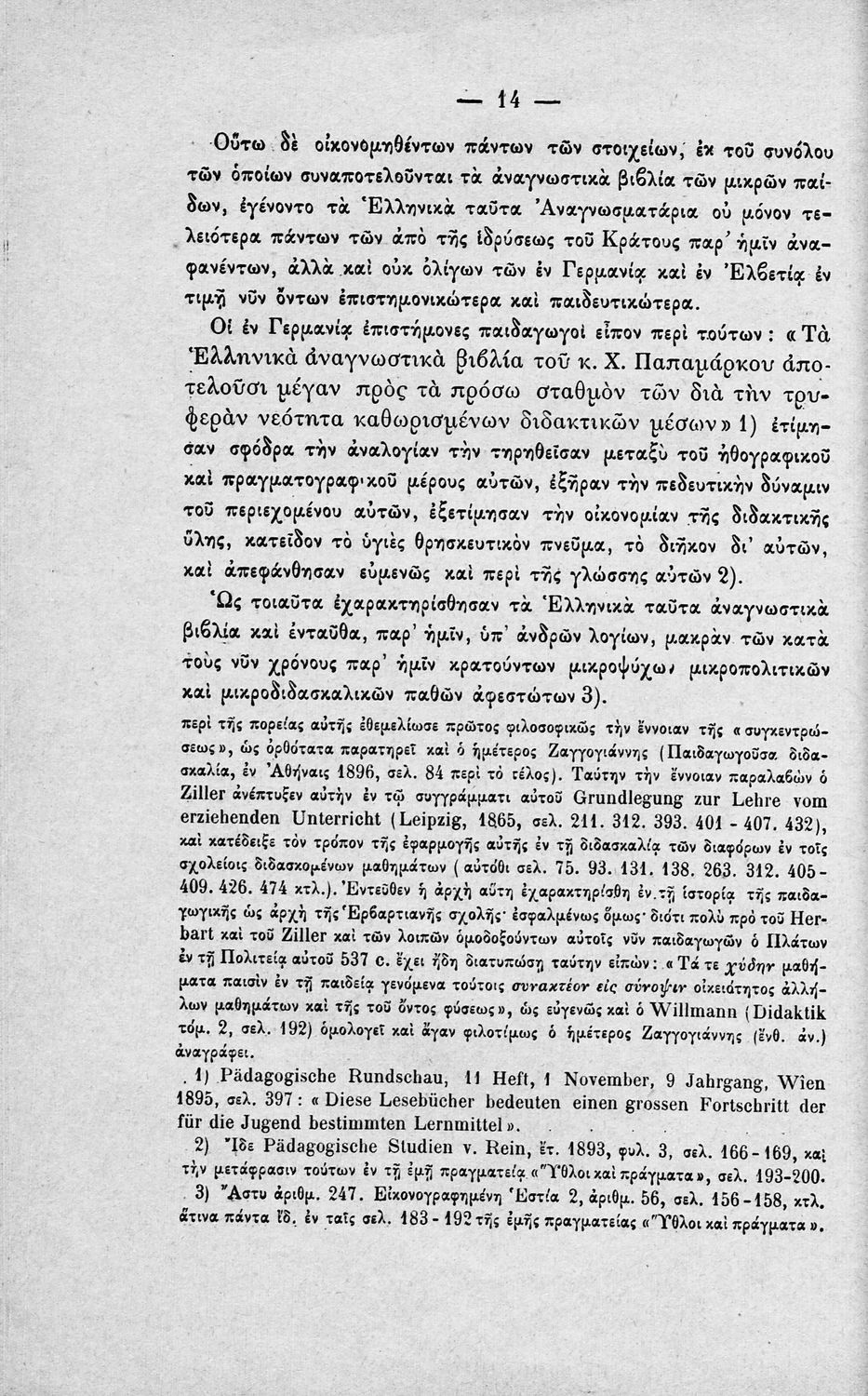 Έκδοση που περιλαμβάνει κριτική, από πραγματολογική και διδακτική άποψη, της Ελληνικής Χρηστομάθειας του Ιωάννη Γεράνη. Ο συγγραφέας αποφαίνεται ότι το εν λόγω σχολικό εγχειρίδιο είναι όχι μόνο ακατάλληλο αλλά