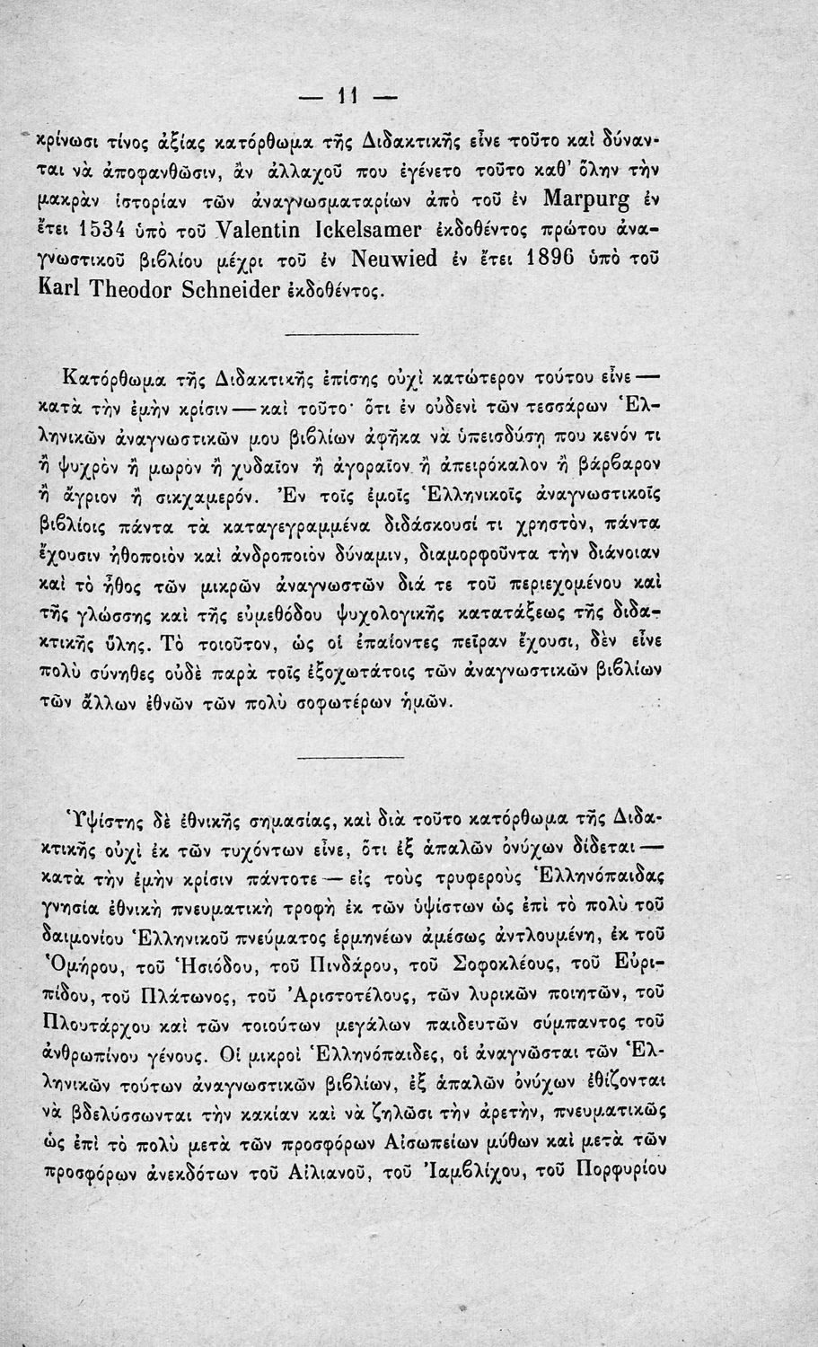 Σχολικό εγχειρίδιο Νέων Ελληνικών του 1889. Περιέχει πεζά και ποιήματα Ελλήνων λογοτεχνών εμπνευσμένα από την καθημερινή και ιστορική ζωή του τόπου. Έχει την έγκριση του Υπουργείου Δημόσιας Εκπαίδευσης.