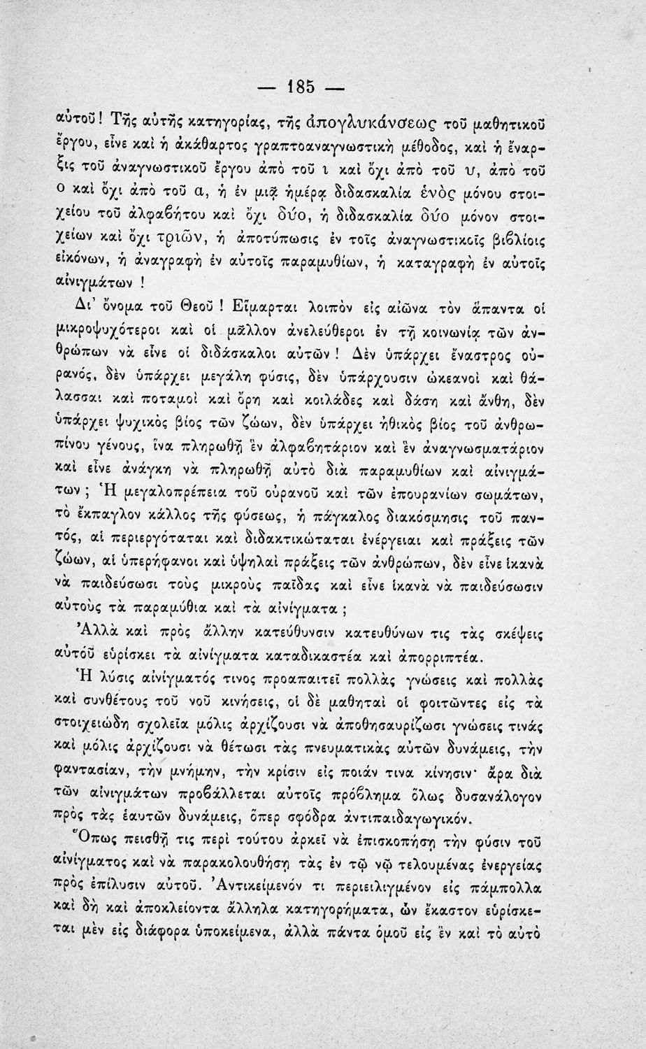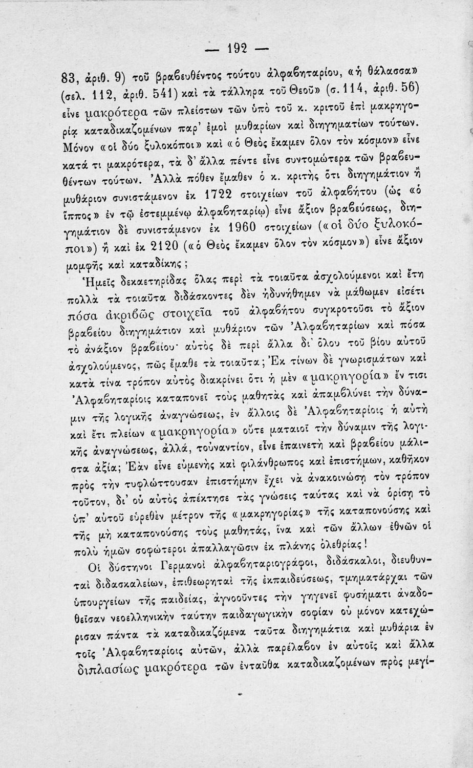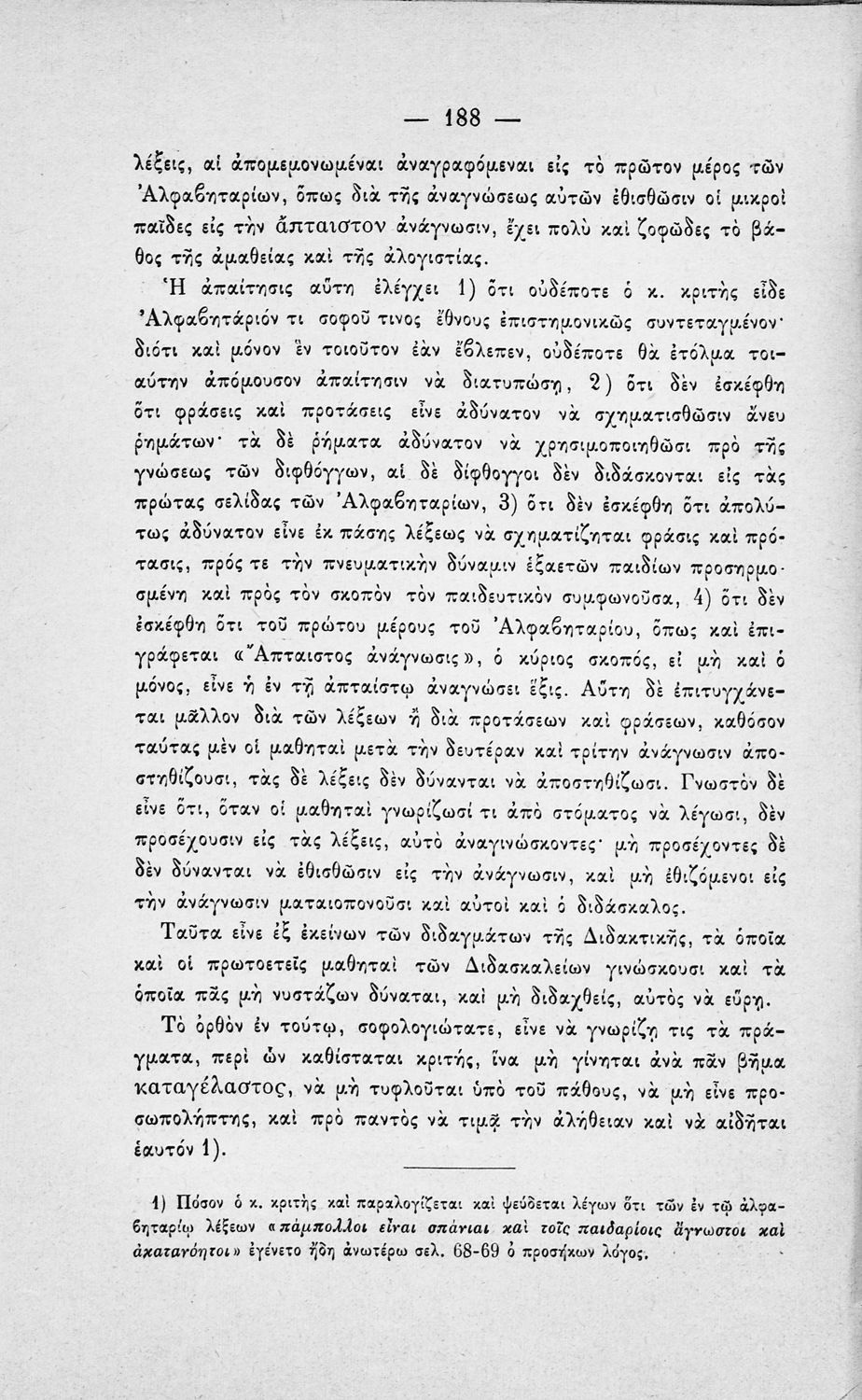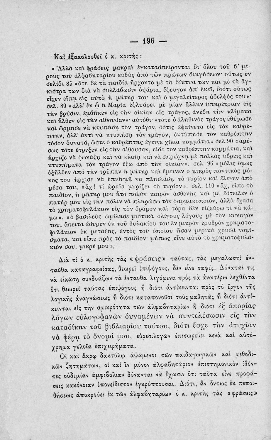 Έκδοση που περιλαμβάνει κριτική, από πραγματολογική και διδακτική άποψη, της Ελληνικής Χρηστομάθειας του Ιωάννη Γεράνη. Ο συγγραφέας αποφαίνεται ότι το εν λόγω σχολικό εγχειρίδιο είναι όχι μόνο ακατάλληλο αλλά