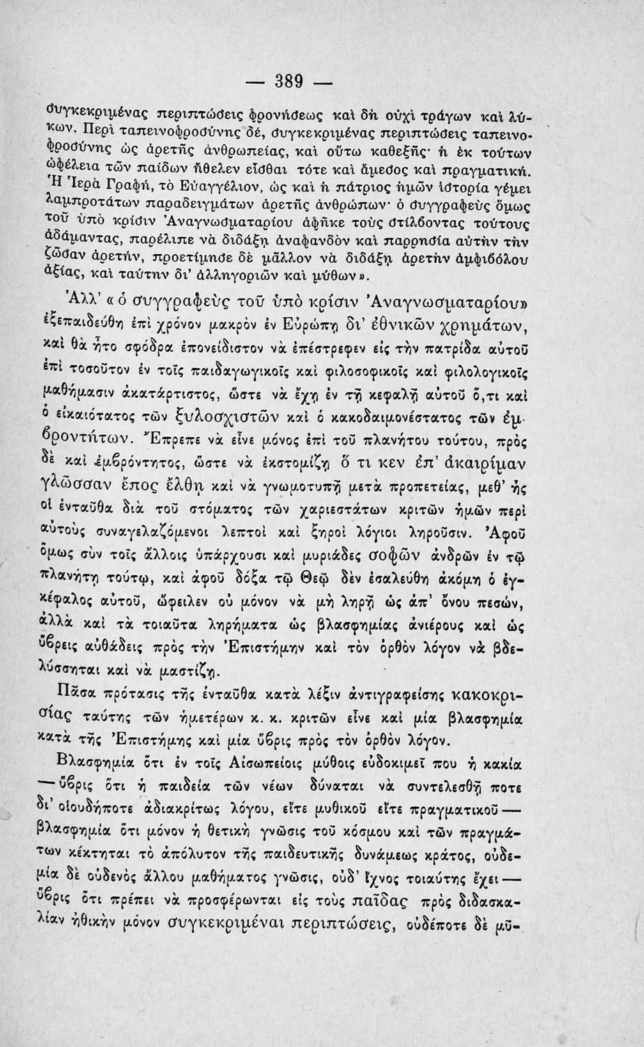 Έκδοση που περιλαμβάνει κριτική, από πραγματολογική και διδακτική άποψη, της Ελληνικής Χρηστομάθειας του Ιωάννη Γεράνη. Ο συγγραφέας αποφαίνεται ότι το εν λόγω σχολικό εγχειρίδιο είναι όχι μόνο ακατάλληλο αλλά