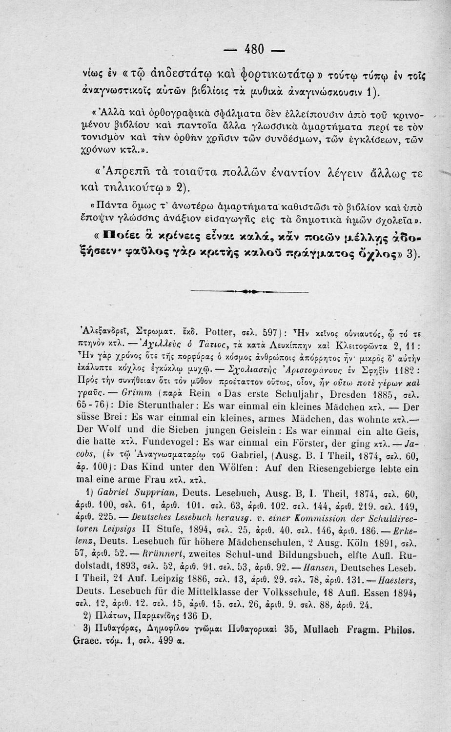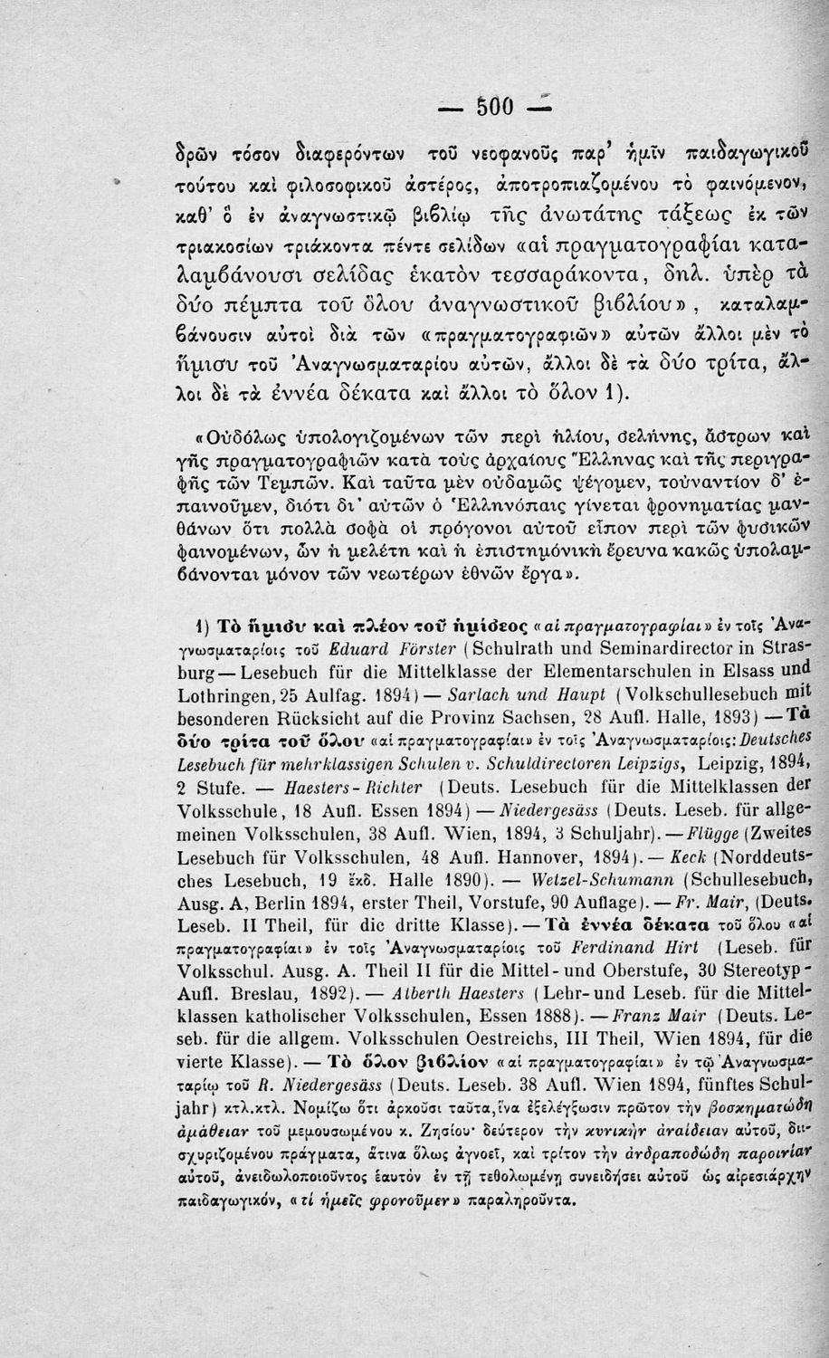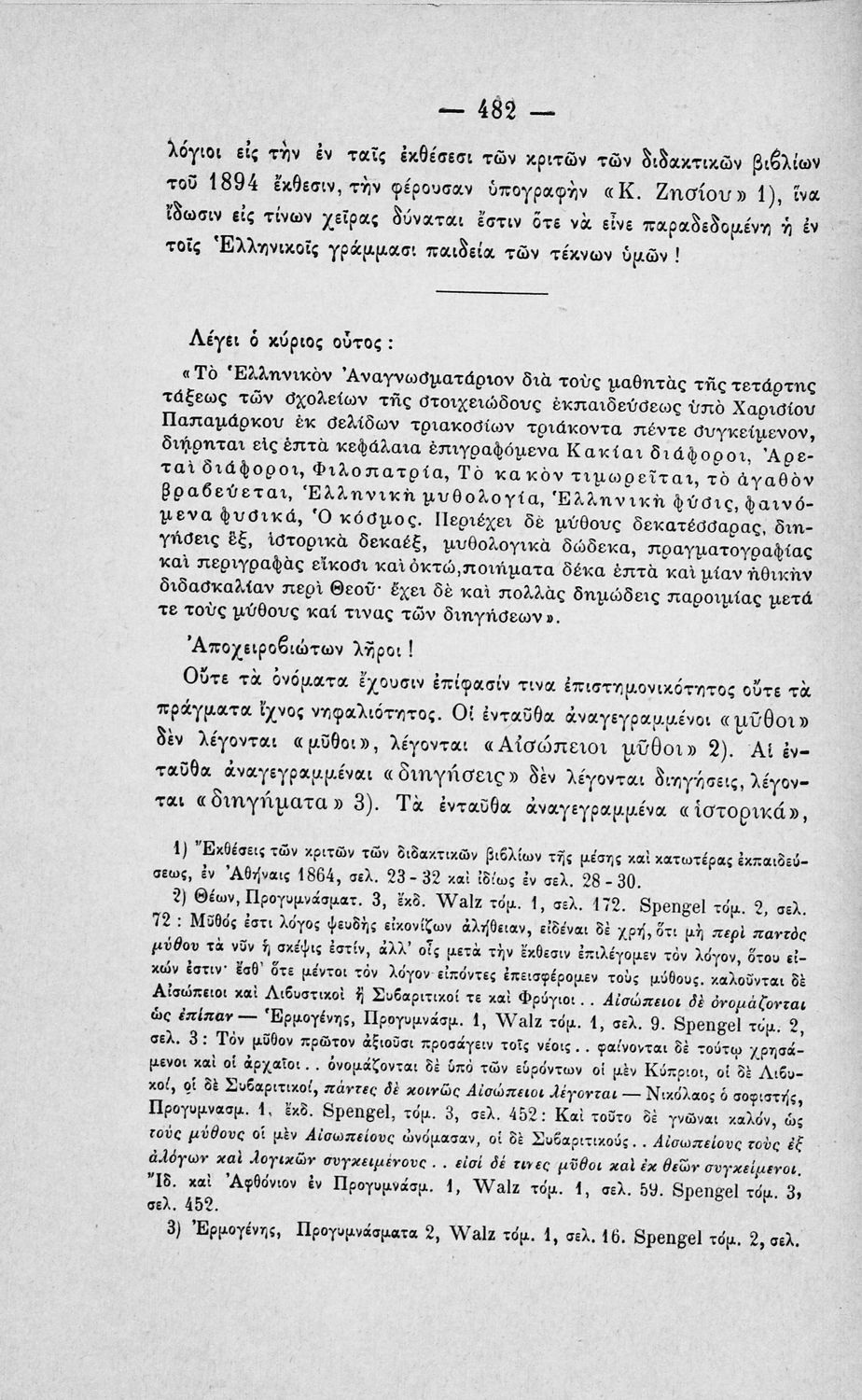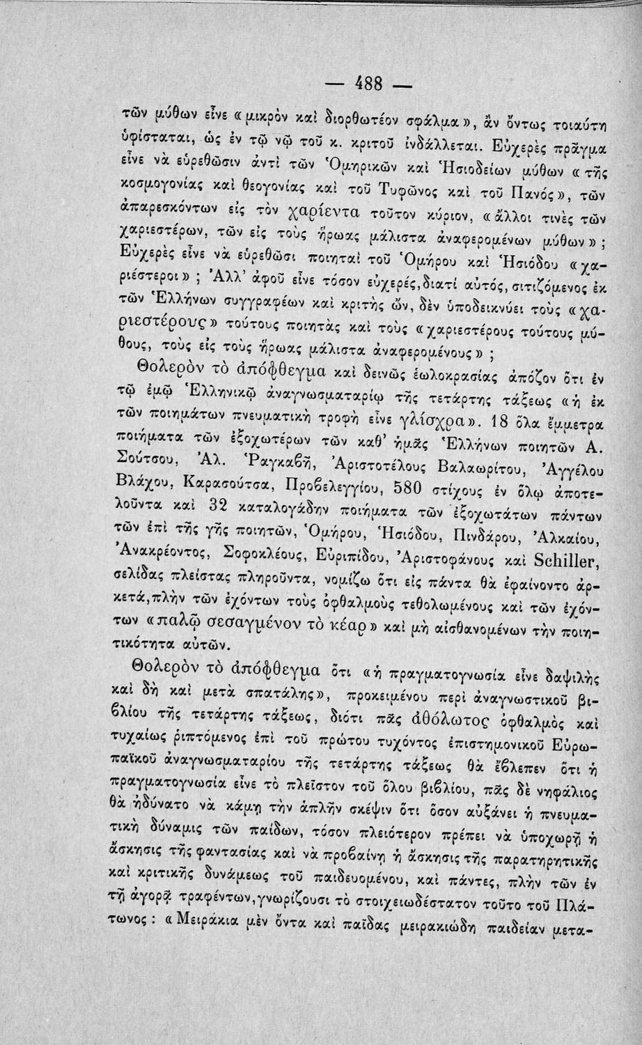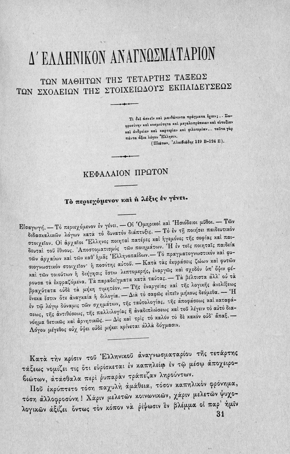 Σχολικό εγχειρίδιο Νέων Ελληνικών του 1889. Περιέχει πεζά και ποιήματα Ελλήνων λογοτεχνών εμπνευσμένα από την καθημερινή και ιστορική ζωή του τόπου. Έχει την έγκριση του Υπουργείου Δημόσιας Εκπαίδευσης.