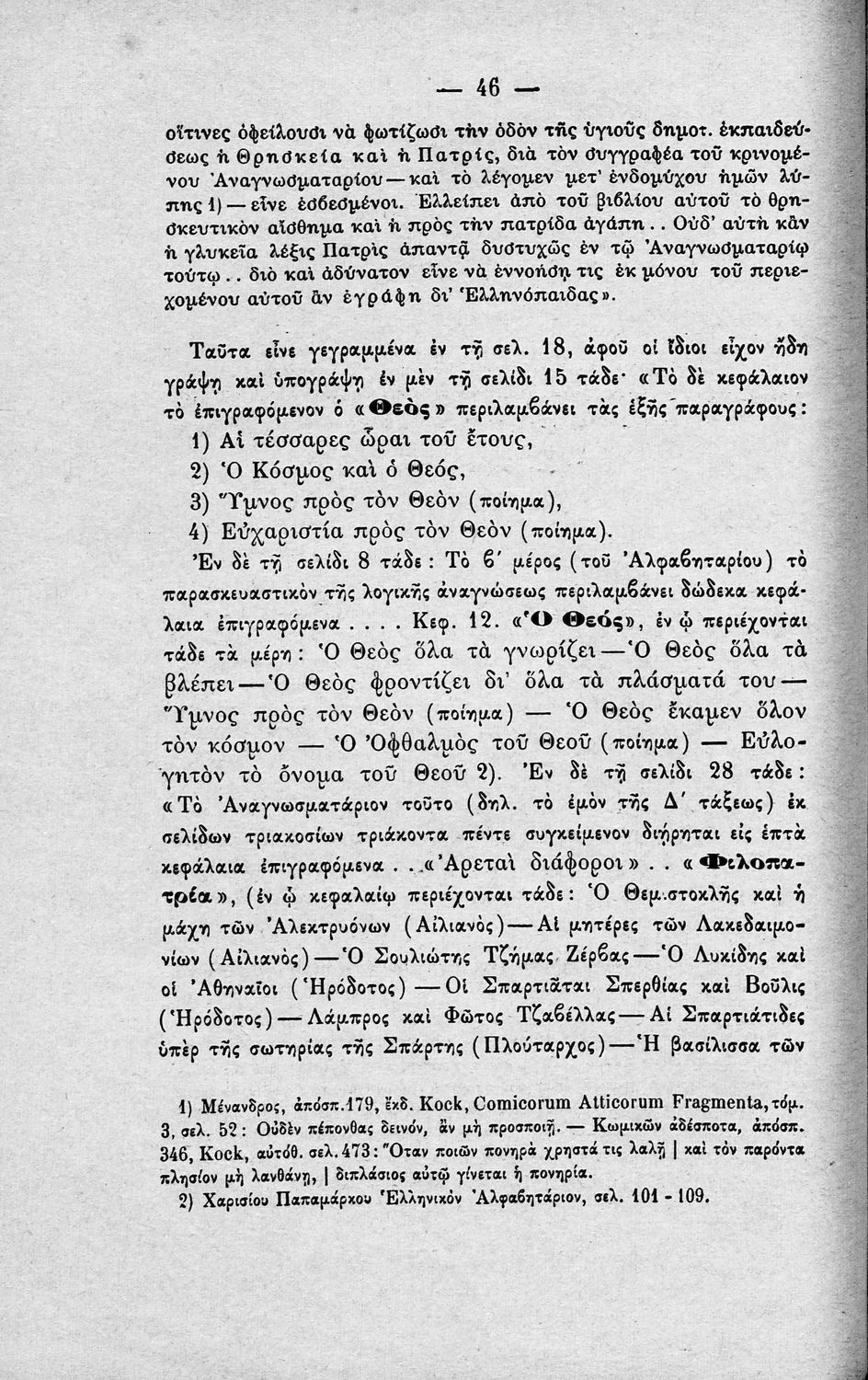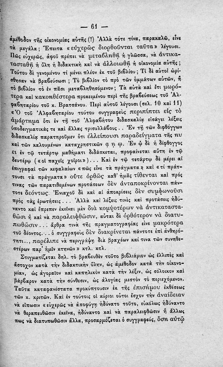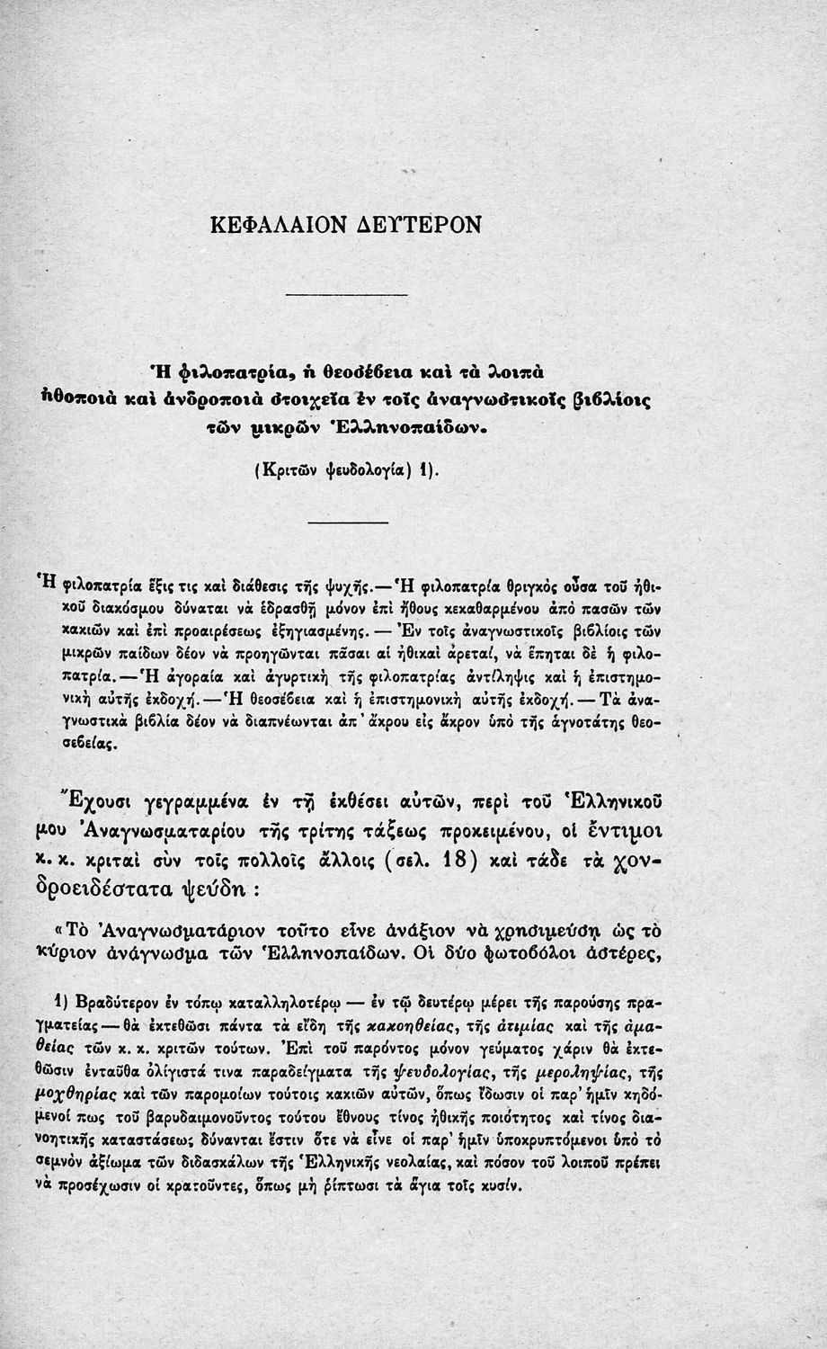 Έκδοση που περιλαμβάνει κριτική, από πραγματολογική και διδακτική άποψη, της Ελληνικής Χρηστομάθειας του Ιωάννη Γεράνη. Ο συγγραφέας αποφαίνεται ότι το εν λόγω σχολικό εγχειρίδιο είναι όχι μόνο ακατάλληλο αλλά