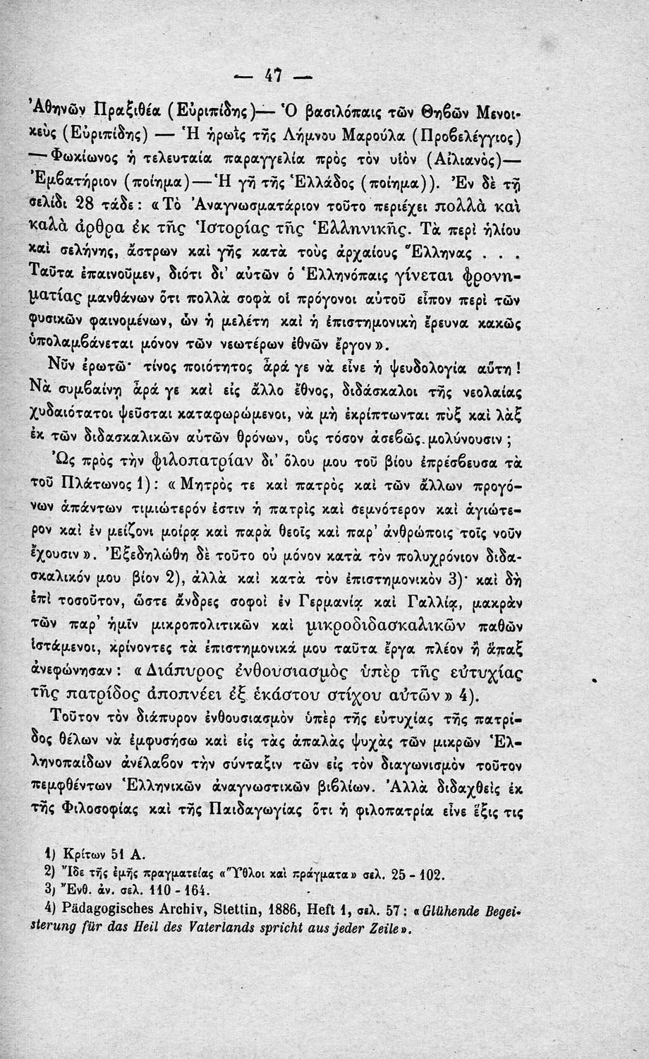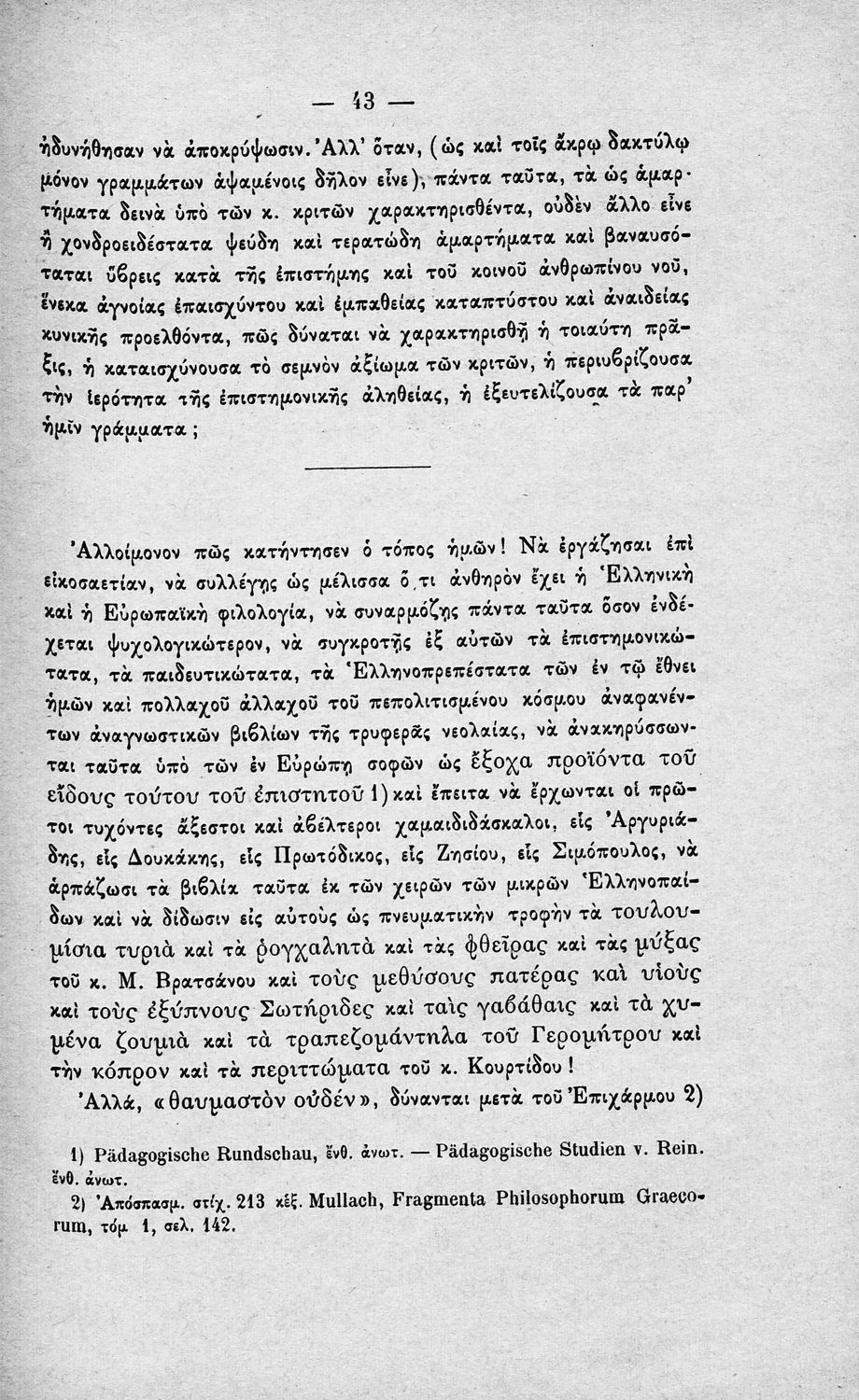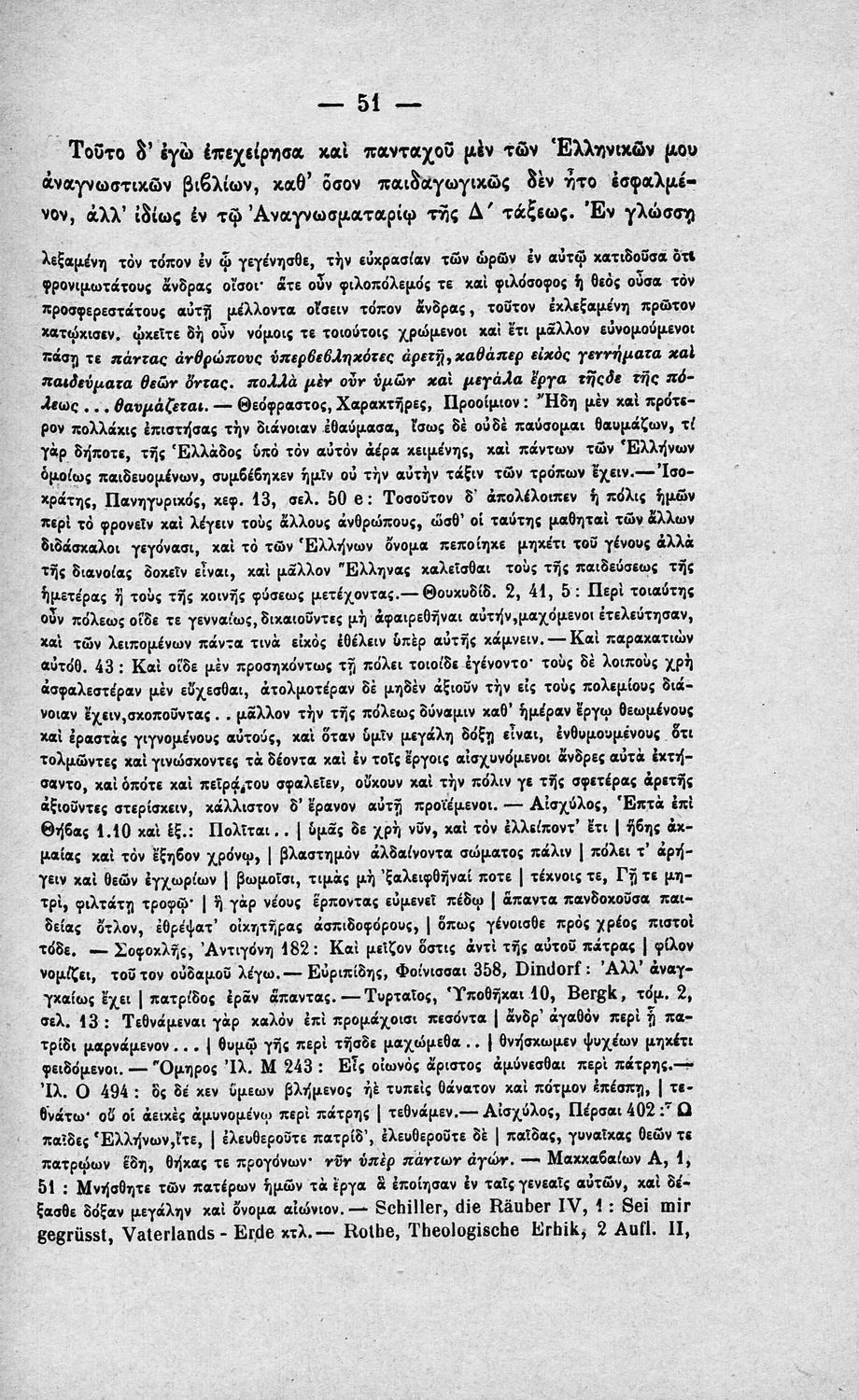Έκδοση που περιλαμβάνει κριτική, από πραγματολογική και διδακτική άποψη, της Ελληνικής Χρηστομάθειας του Ιωάννη Γεράνη. Ο συγγραφέας αποφαίνεται ότι το εν λόγω σχολικό εγχειρίδιο είναι όχι μόνο ακατάλληλο αλλά
