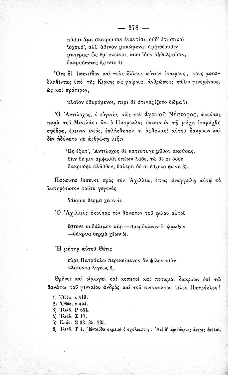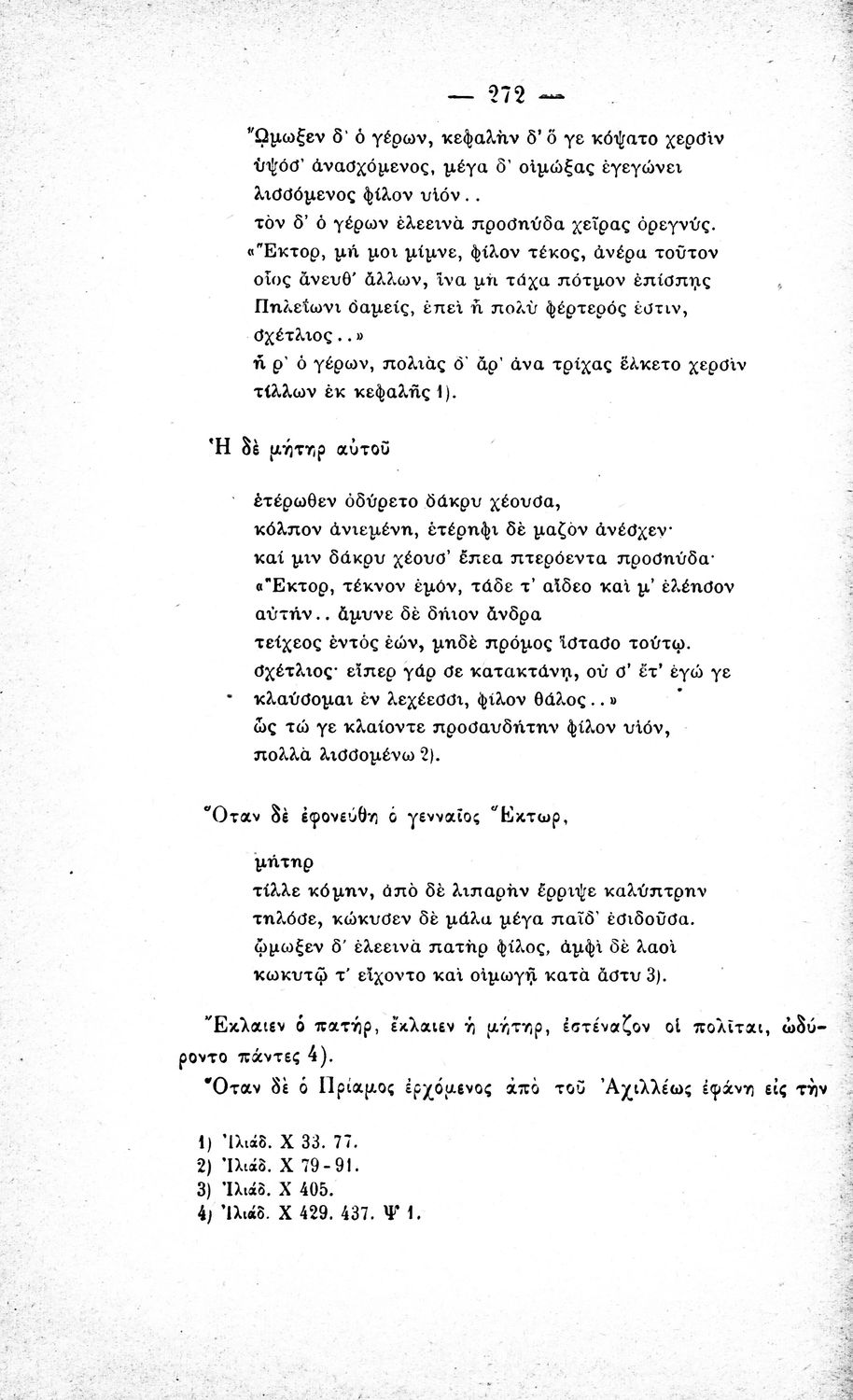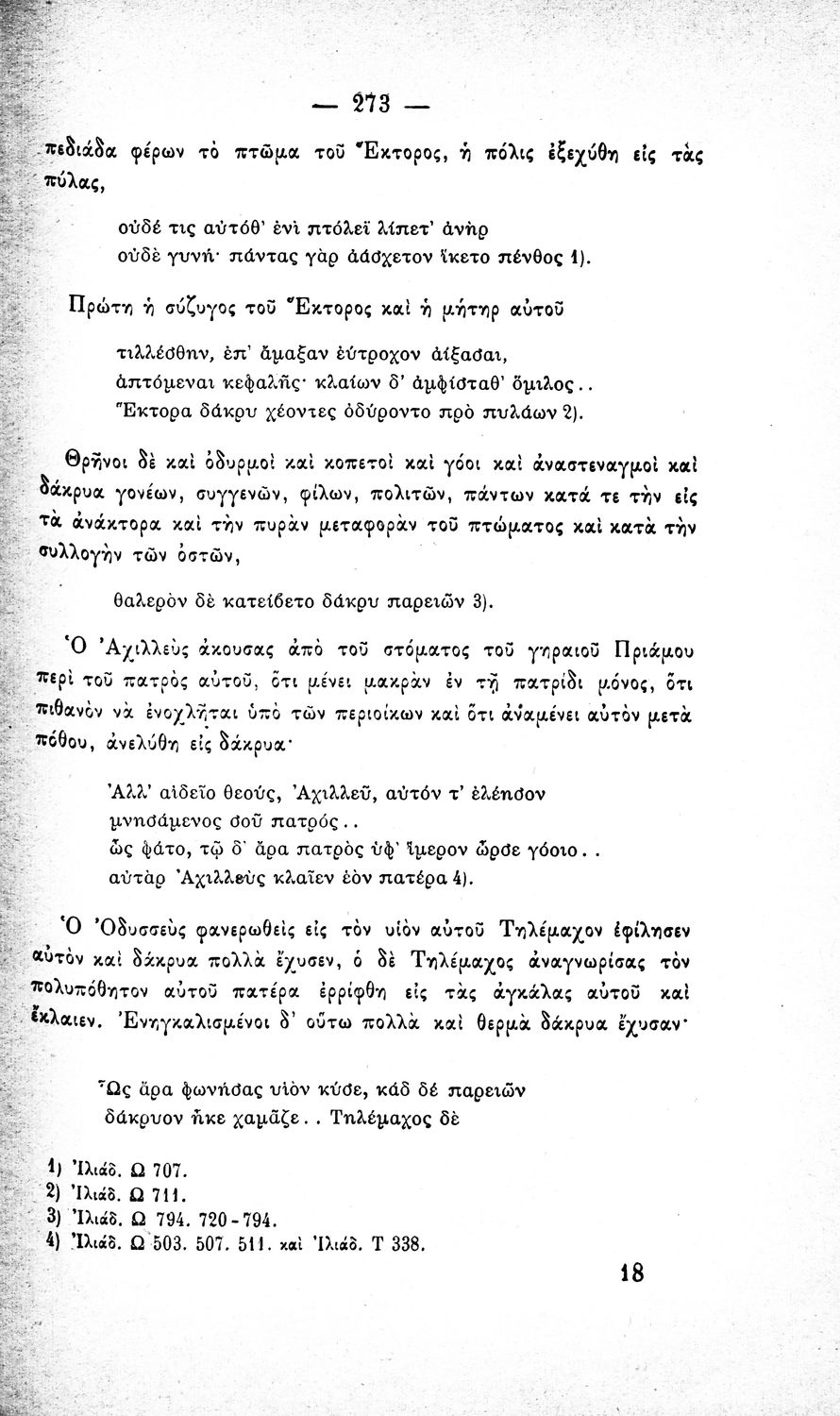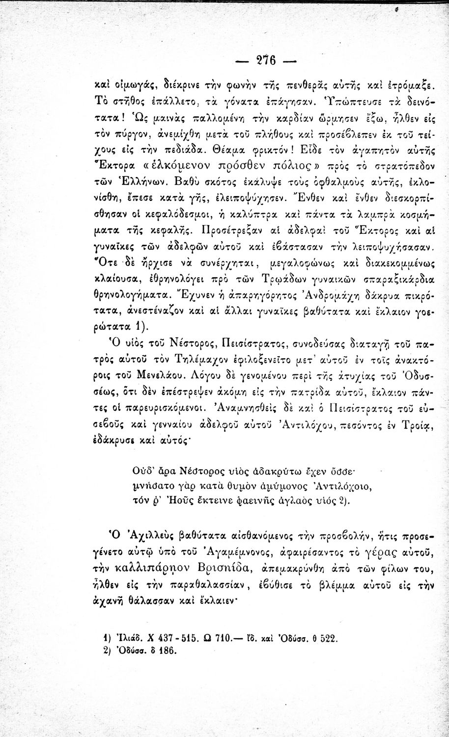 Μαθητικό βοήθημα του Ελληνικού Σχολείου, των Παρθεναγωγείων και του Γυμνασίου για το μάθημα των Αρχαίων Ελληνικών. Περιέχει τις ραψωδίες Ο, Π, Ρ, Σ, Τ, Χ, ψ, Ω από το πρωτότυπο με σχόλια και ερμηνευτικές ...