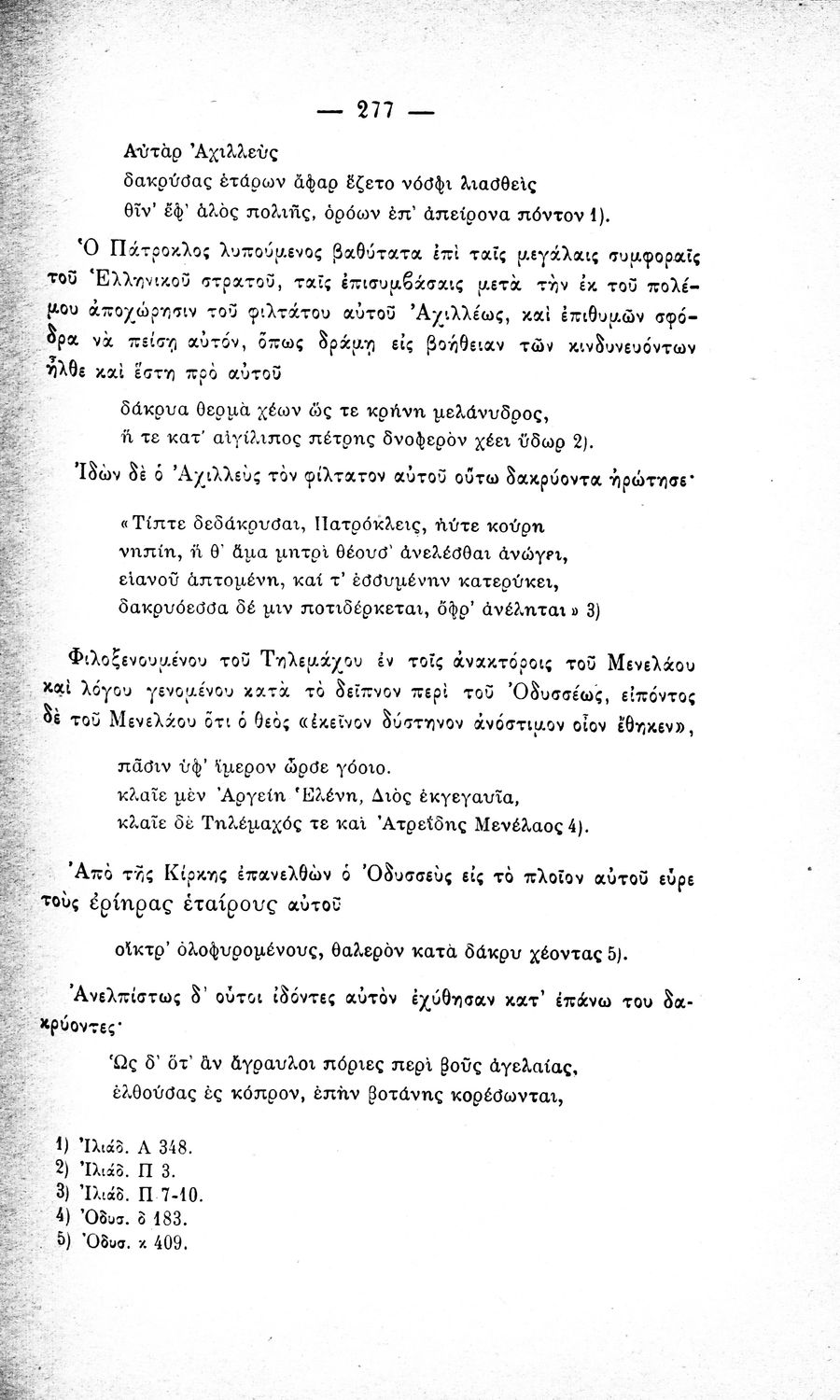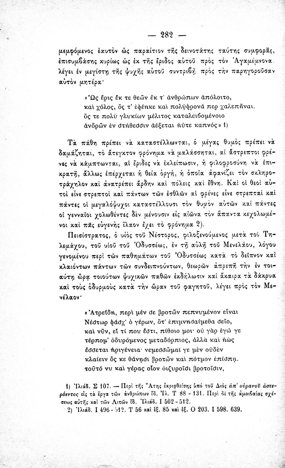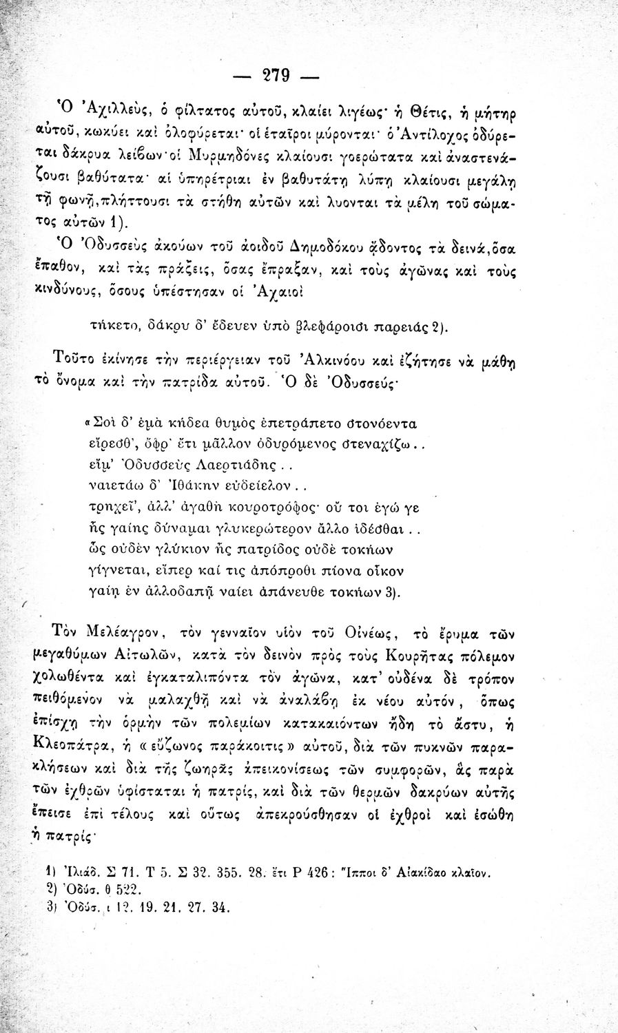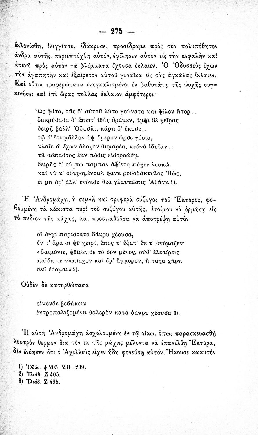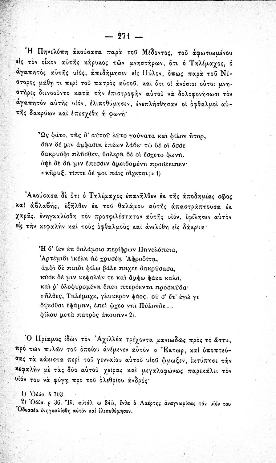 Μαθητικό βοήθημα του Ελληνικού Σχολείου, των Παρθεναγωγείων και του Γυμνασίου για το μάθημα των Αρχαίων Ελληνικών. Περιέχει τις ραψωδίες Ο, Π, Ρ, Σ, Τ, Χ, ψ, Ω από το πρωτότυπο με σχόλια και ερμηνευτικές ...