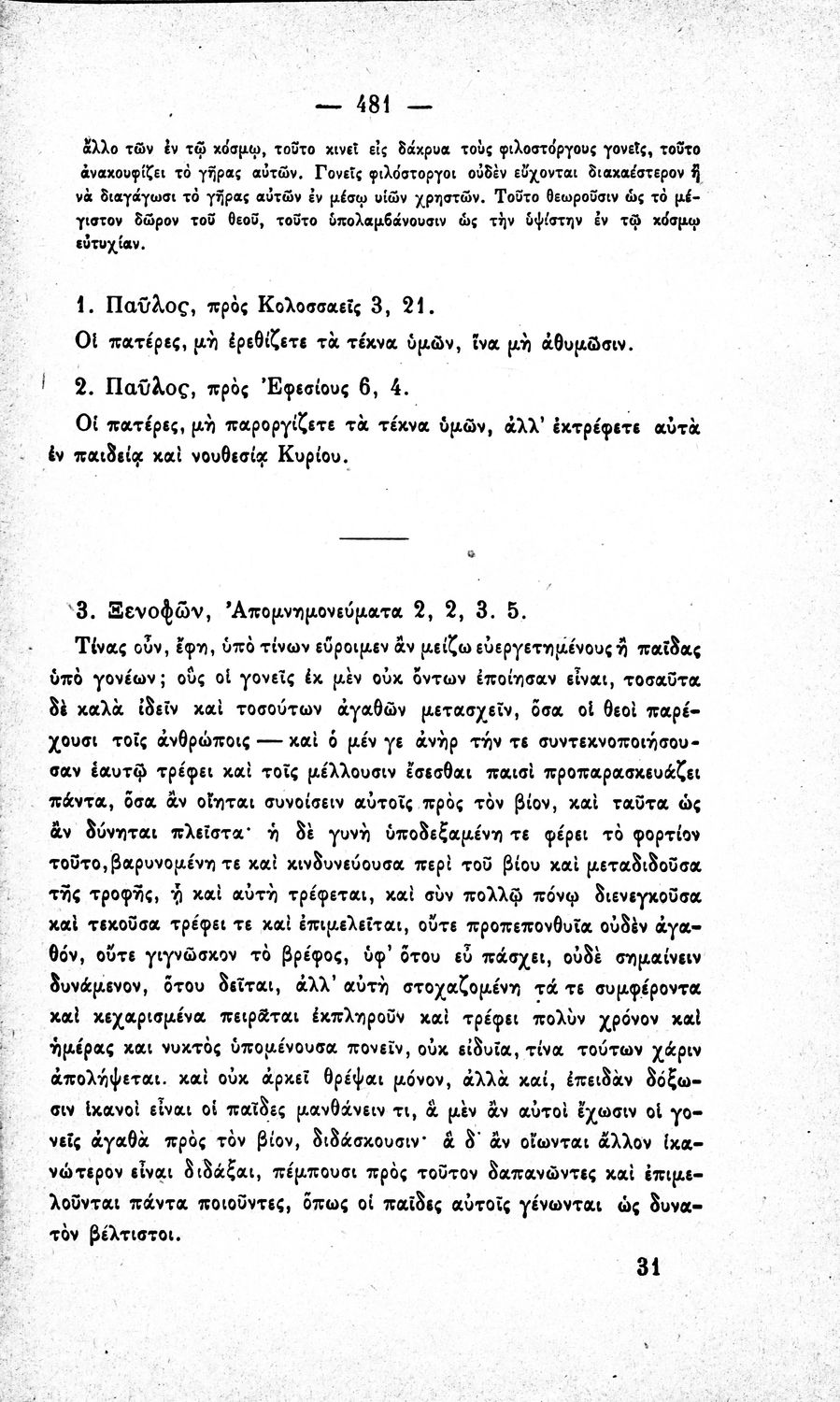Σχολικό εγχειρίδιο Αρχαίων Ελληνικών για τα Ιερατικά Σχολεία. Ο τόμος περιέχει «..τεμάχια κατ’ εκλογήν εκ της Ξενοφώντος Κύρου Ανάβασεως και εκ των Γεωγραφικών και Εθνογραφικών Στράβωνος, Διοδώρου και άλλων, ...