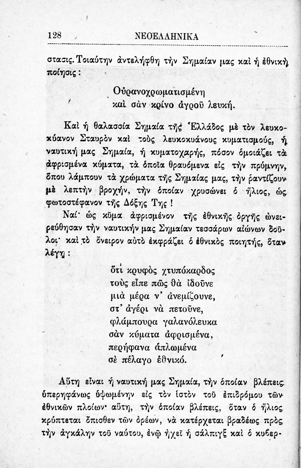 Σχολικό εγχειρίδιο Νέων Ελληνικών Γ' Ελληνικού Σχολείου και Α΄ Αστικού Σχολείου των Θηλέων που περιλαμβάνει ποιήματα και πεζά Ελλήνων συγγραφέων και δημοτικά τραγούδια εμπνευσμένα από την σύγχρονη ελληνική ...