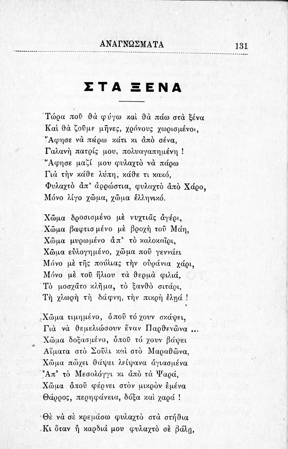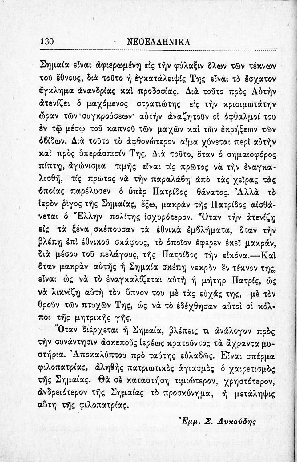 Σχολικό εγχειρίδιο Νεοελληνικών αναγνωσμάτων που περιλαμβάνει πεζά και ποιήματα Ελλήνων συγγραφέων με θέματα από την εθνική ζωή. Περιέχει και παράρτημα με βιογραφίες των συγγραφέων και λεξιλόγιο.