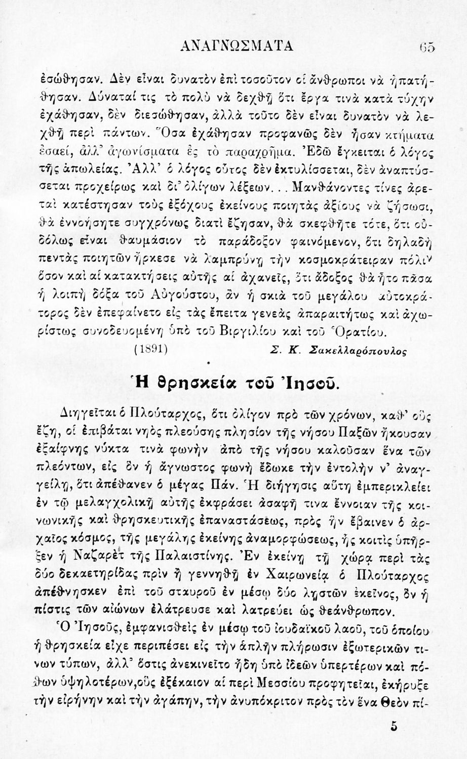 Σχολικό εγχειρίδιο Νέων Ελληνικών Γ΄ Γυμνασίου και Α' Αστικού Σχολείου που περιέχει πεζά και ποιήματα Ελλήνων συγγραφέων εμπνευσμένα από τη θρησκευτική και κοινωνική ζωή, την ελληνική μυθολογία, την αρχαία και