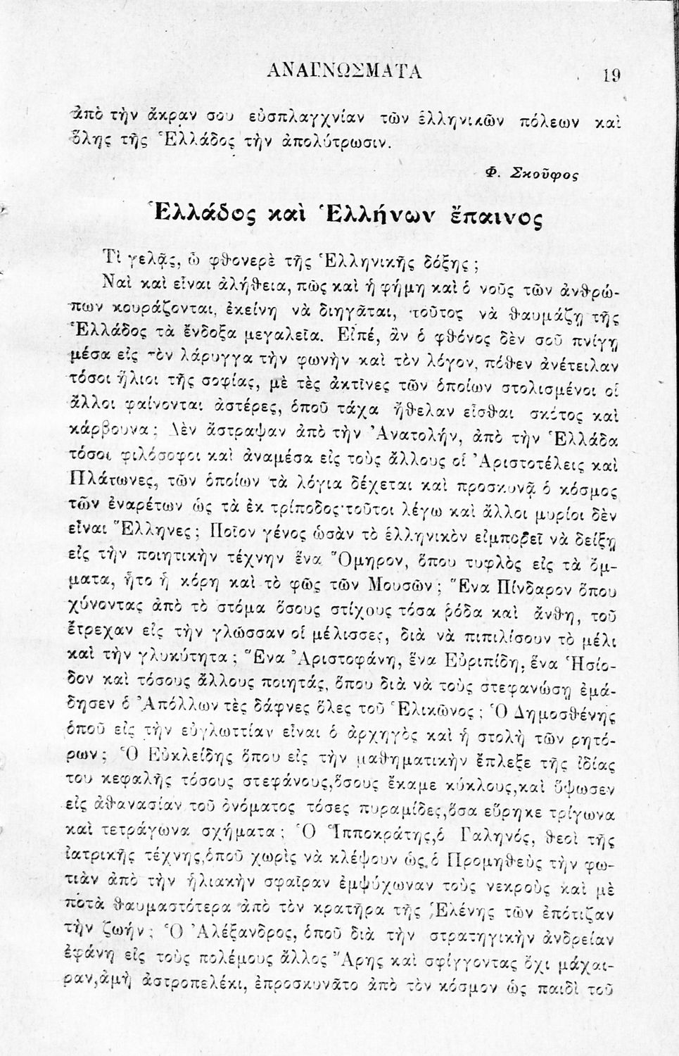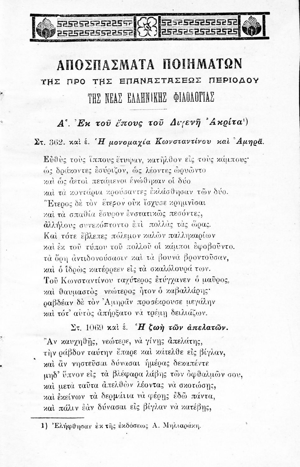 Σχολικό εγχειρίδιο Νέων Ελληνικών Γ΄ Γυμνασίου και Α' Αστικού Σχολείου που περιέχει πεζά και ποιήματα Ελλήνων συγγραφέων εμπνευσμένα από τη θρησκευτική και κοινωνική ζωή, την ελληνική μυθολογία, την αρχαία και