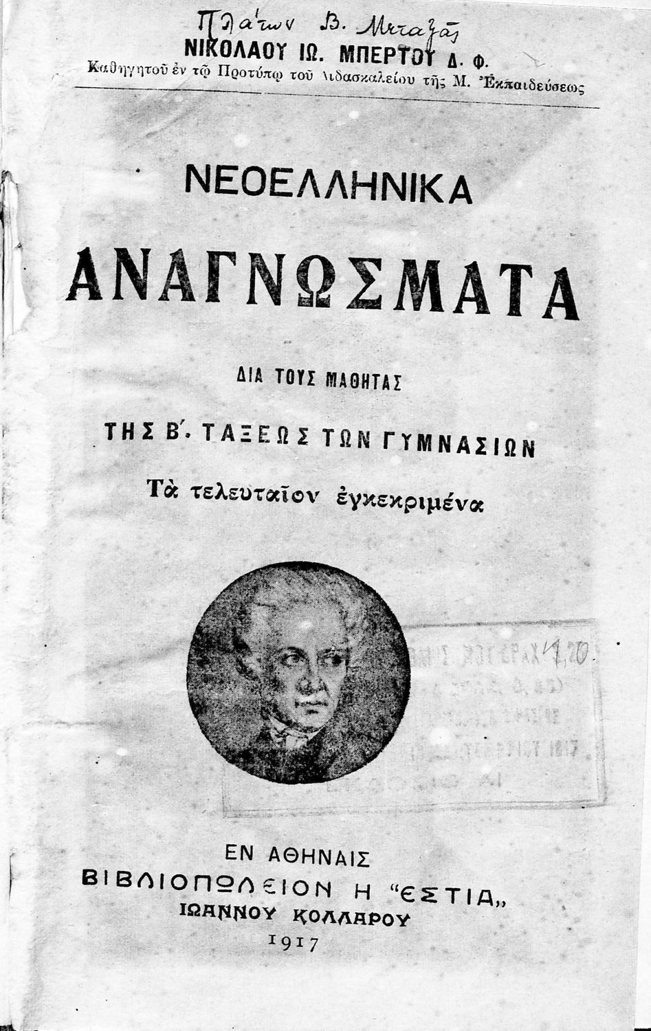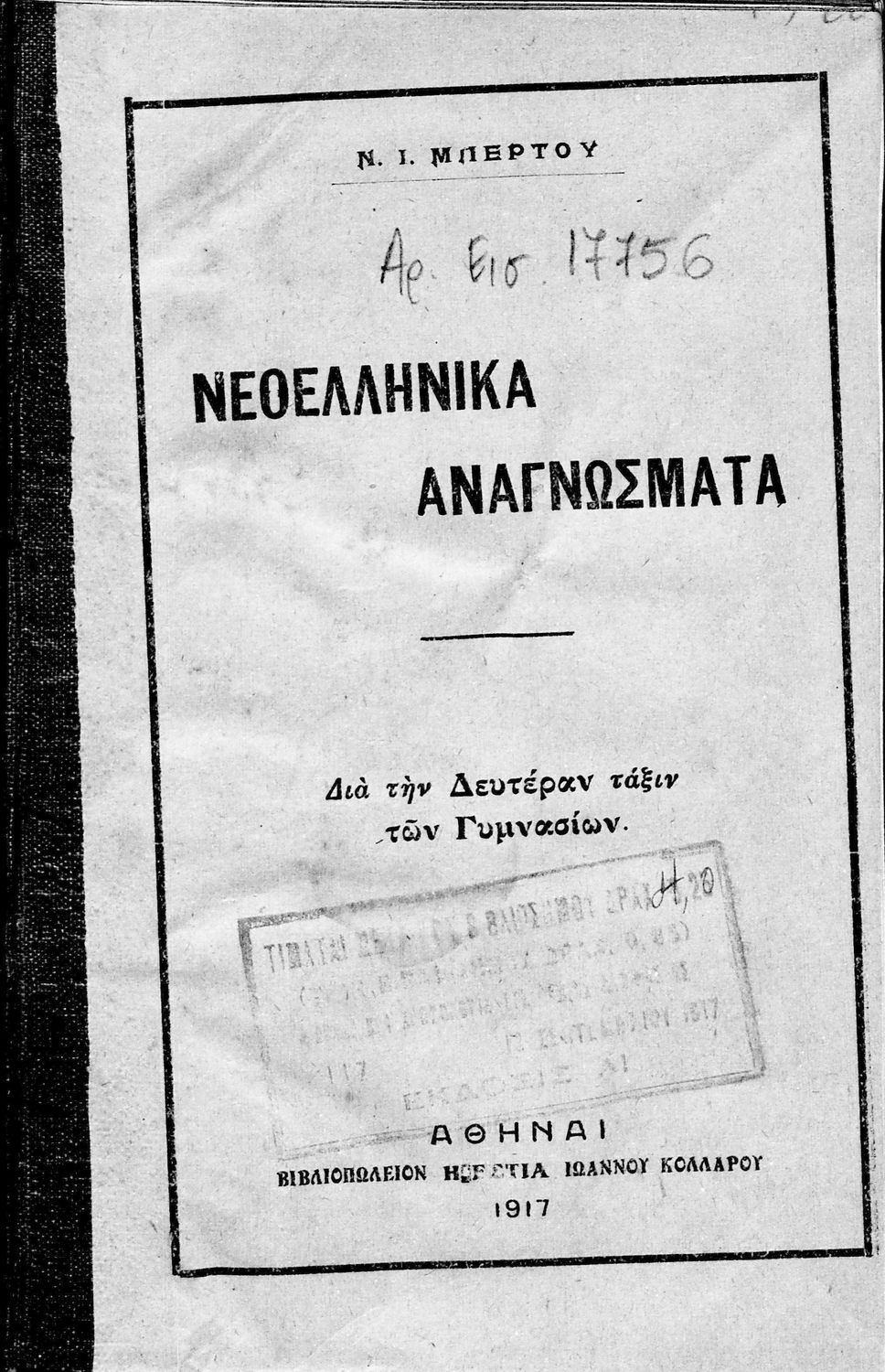 Τίτλος: Νεοελληνικά αναγνώσματα δια την δευτέρα τάξιν των Γυμνασίων