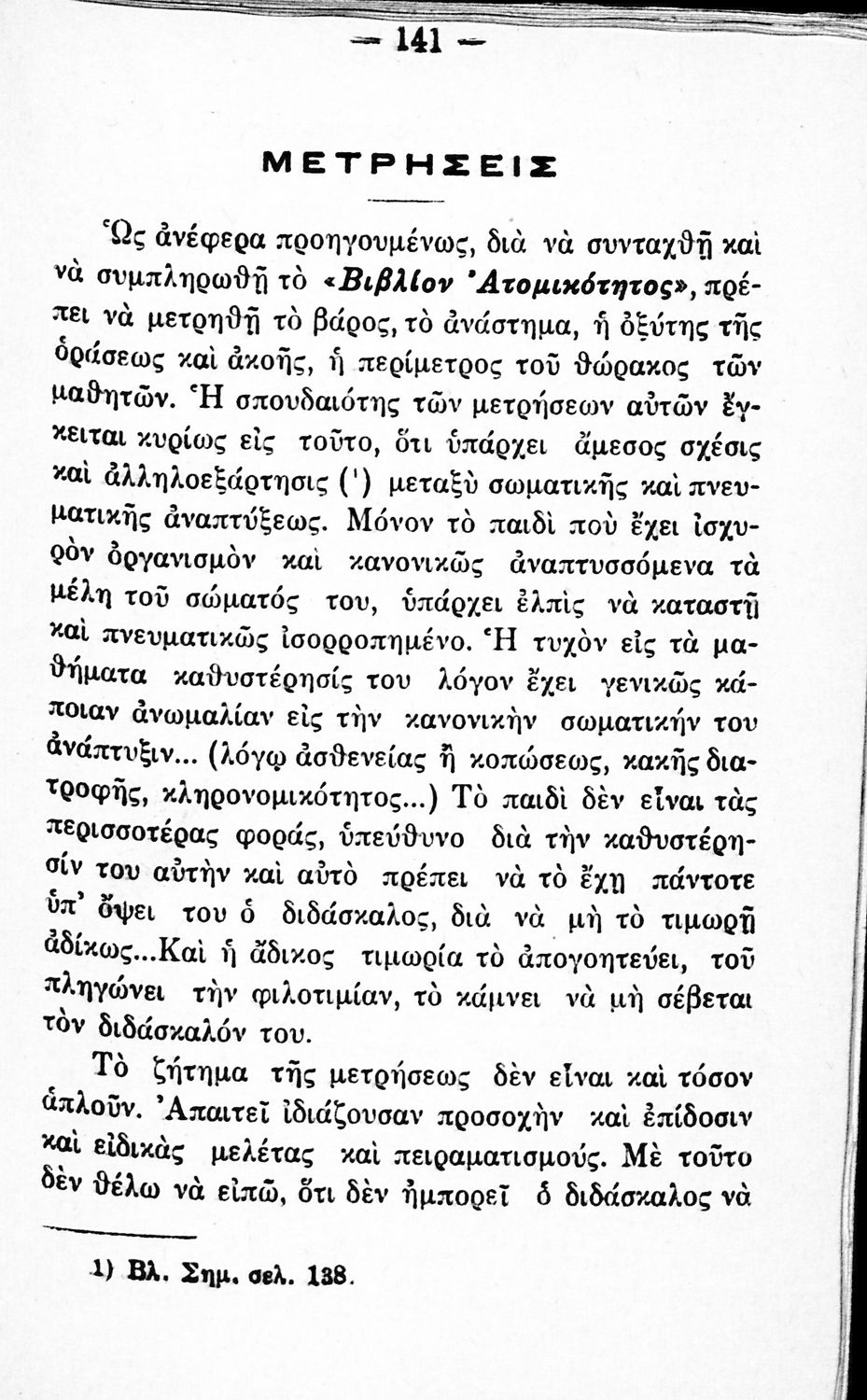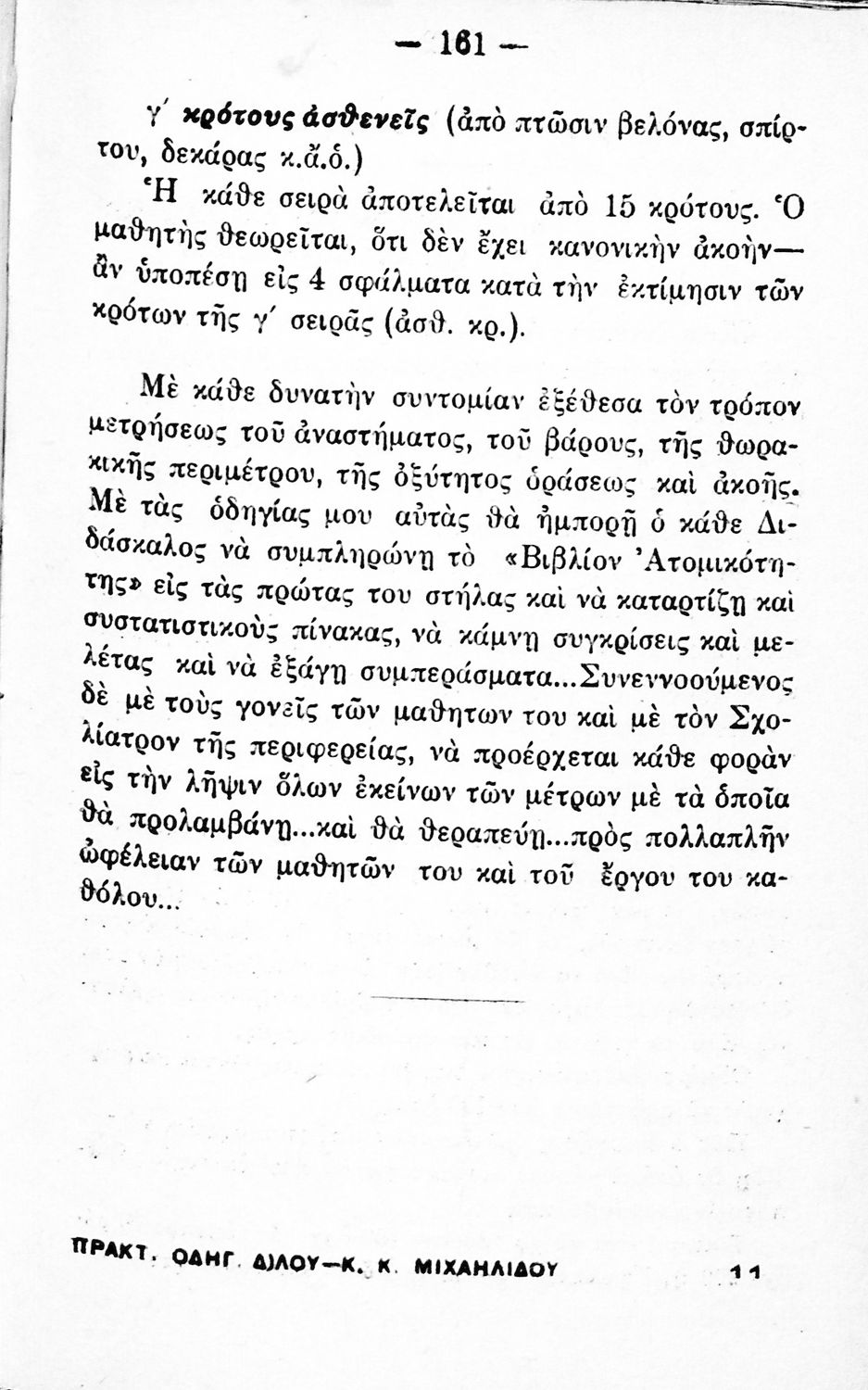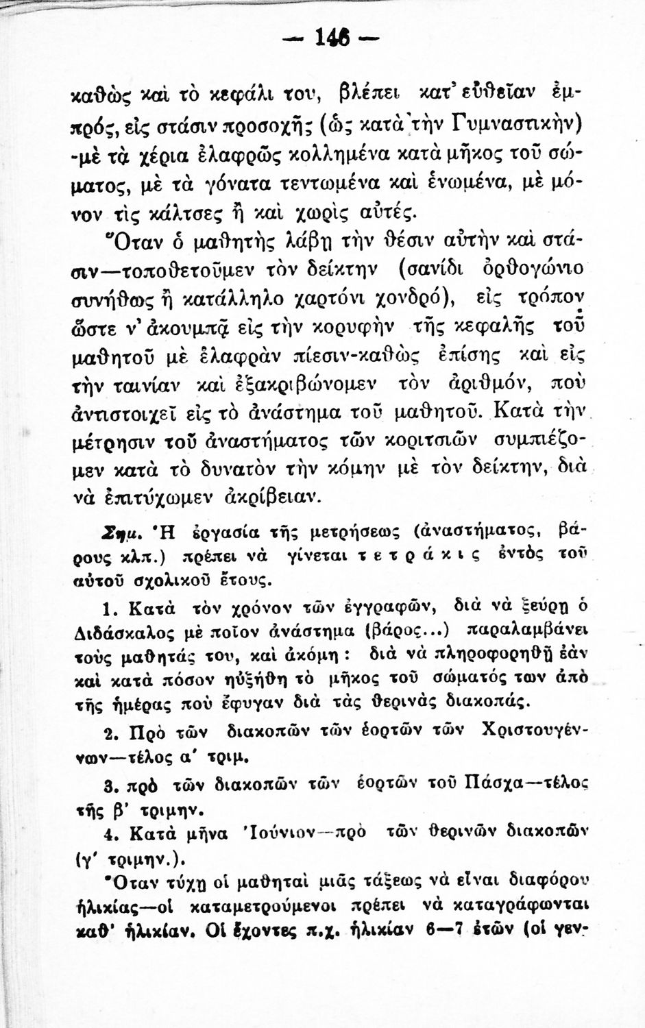 Παιδαγωγικό βοήθημα που απευθύνεται στους δημοδιδασκάλους με σκοπό να τους εξοικειώσει με τα συστήματα εκγύμνασης των μαθητών. Ο συγγραφέας ήταν διευθυντής στην Σχολή Γυμναστών.