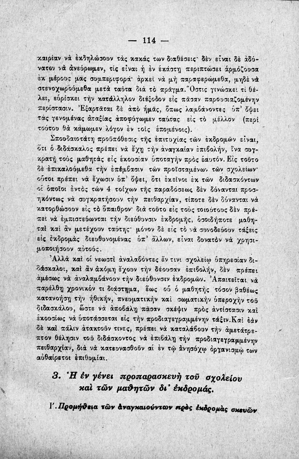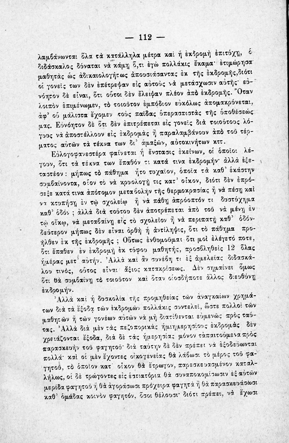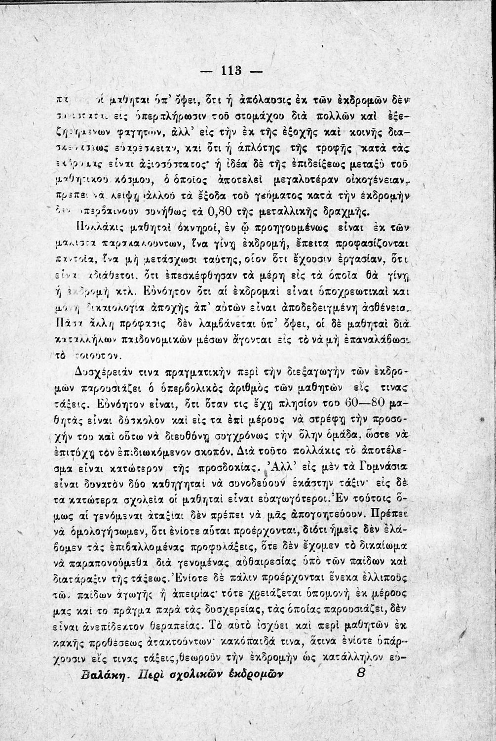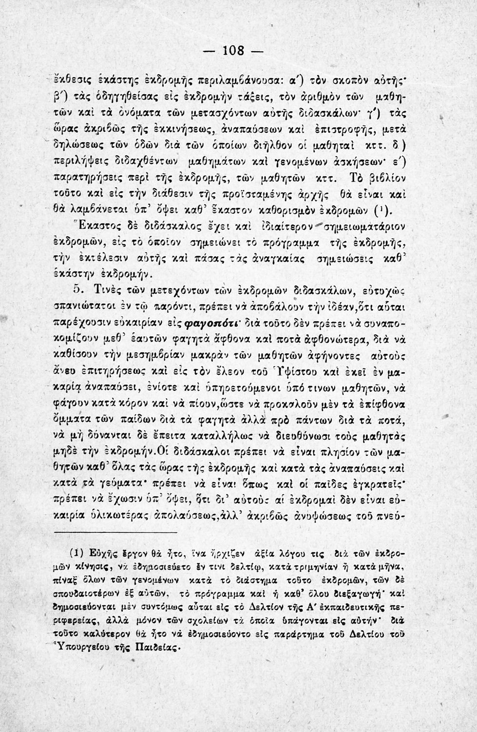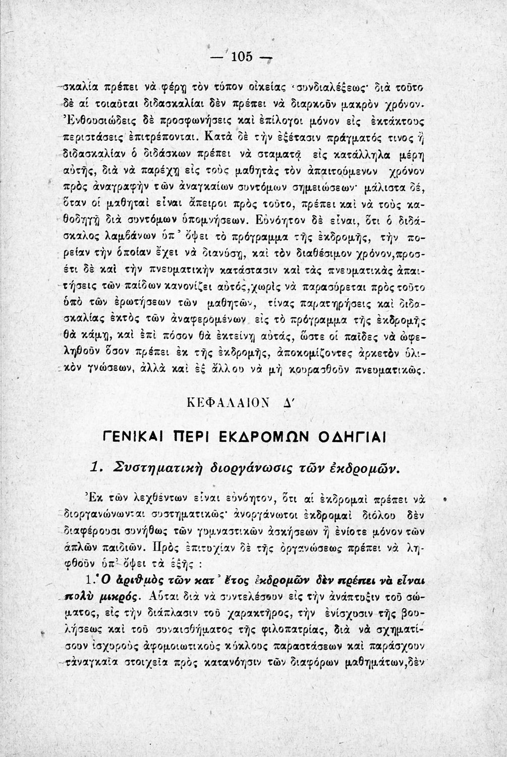 Παρουσίαση περιεχομένου: Παιδαγωγικό βοήθημα που αναφέρεται στην οργάνωση των σχολικών εκδρομών όλων των Δημοτικών, Γυμνασίων, Παρθεναγωγείων και εμπορικών σχολών. Η πρώτη έκδοση έγινε το 1917. Ο συγγραφέας ήταν Διδάκτορας Φιλολογίας και Γυμνασιάρχης στην Αθήνα.
