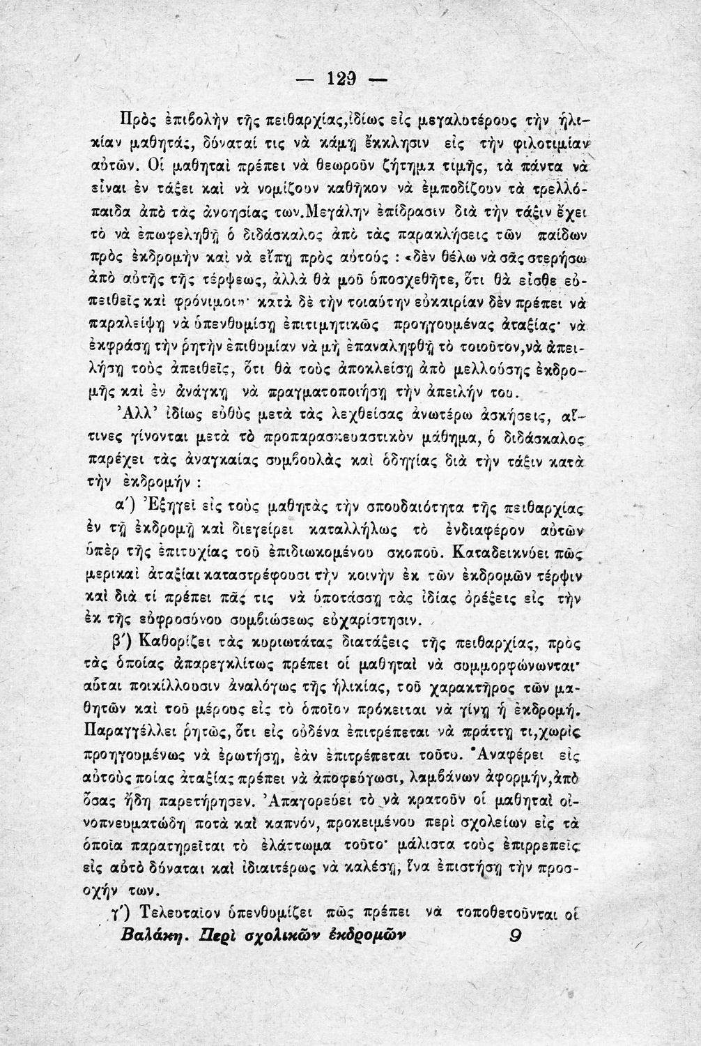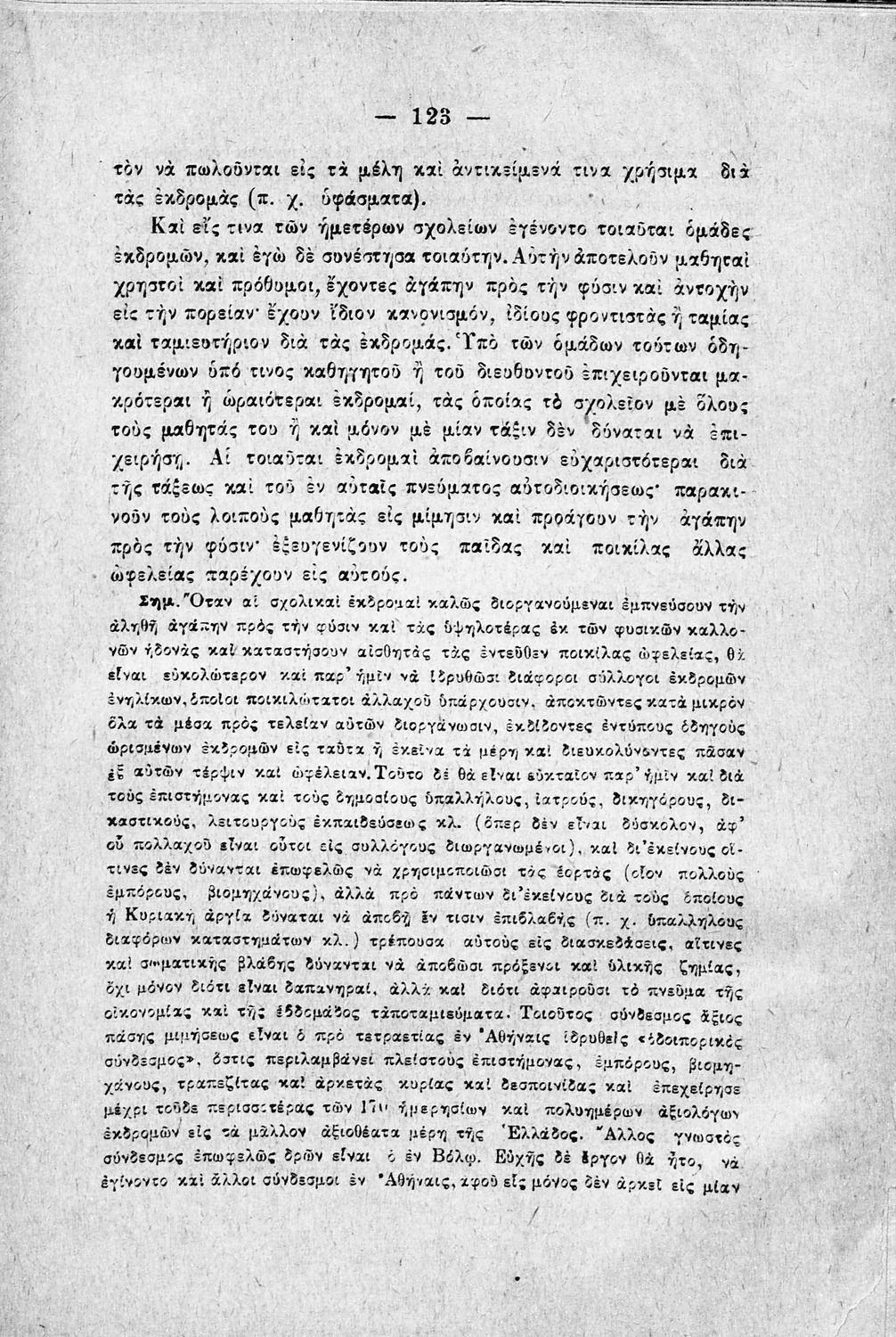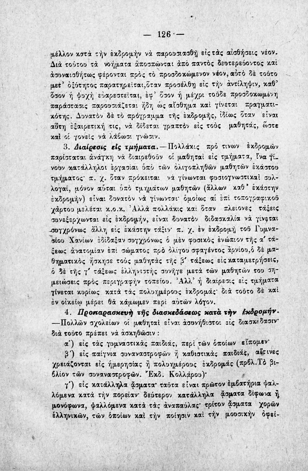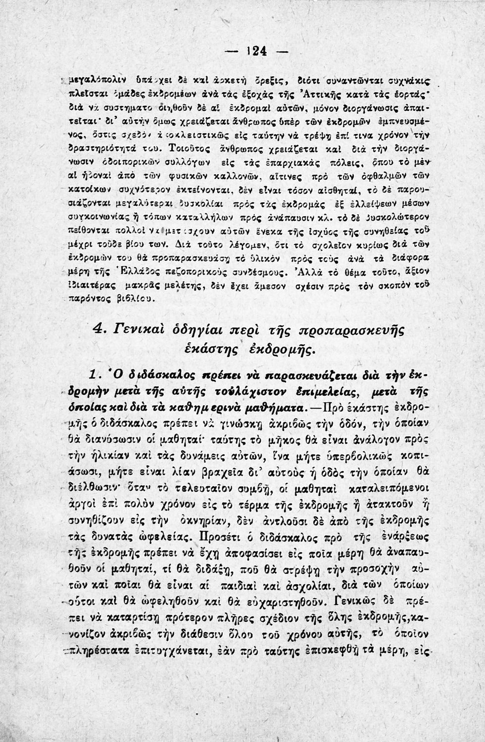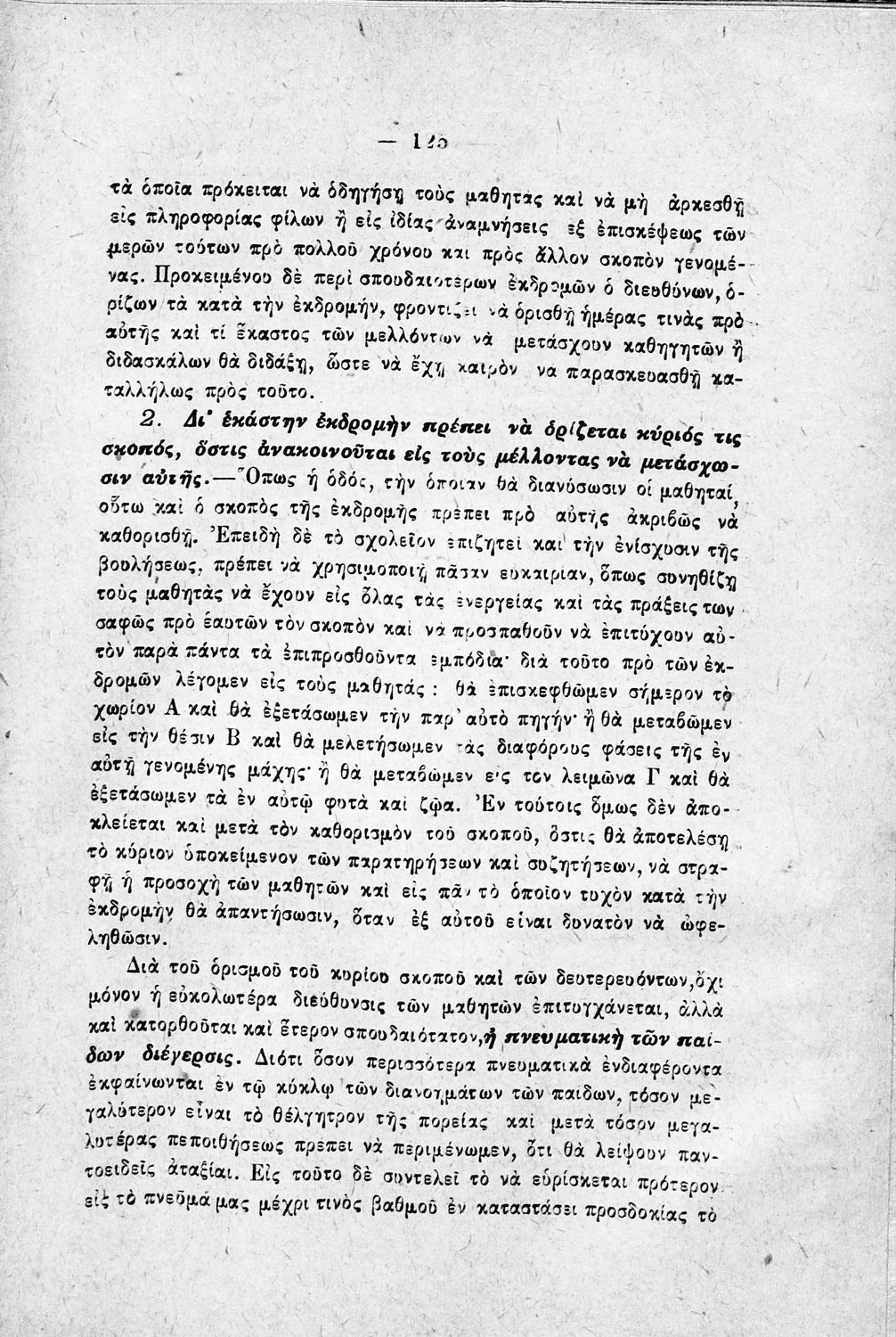 Παρουσίαση περιεχομένου: Παιδαγωγικό βοήθημα που αναφέρεται στην οργάνωση των σχολικών εκδρομών όλων των Δημοτικών, Γυμνασίων, Παρθεναγωγείων και εμπορικών σχολών. Η πρώτη έκδοση έγινε το 1917. Ο συγγραφέας ήταν Διδάκτορας Φιλολογίας και Γυμνασιάρχης στην Αθήνα.