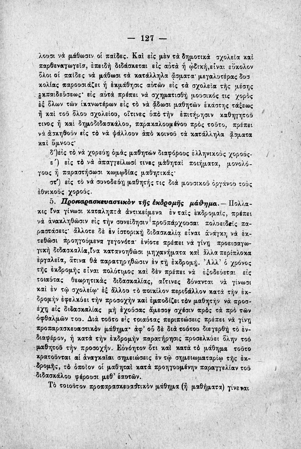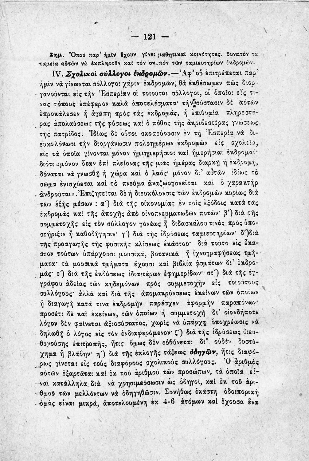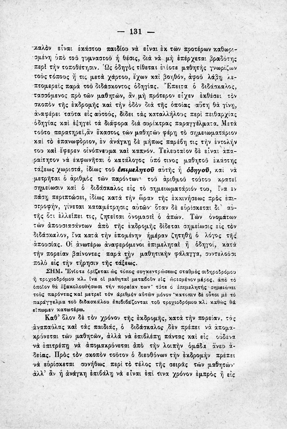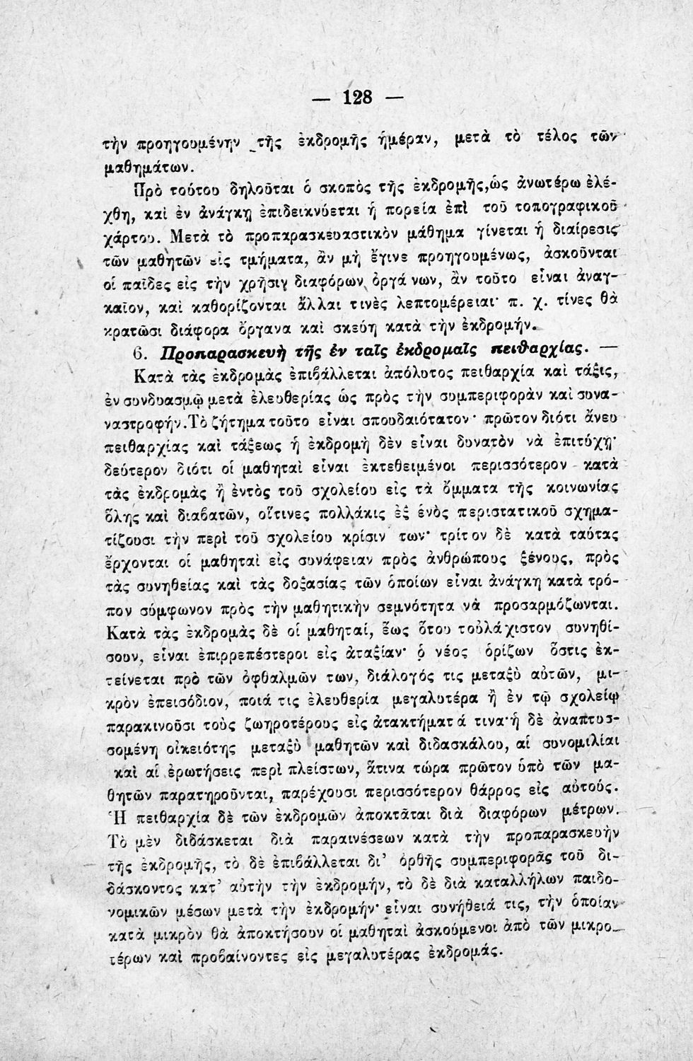 Παρουσίαση περιεχομένου: Παιδαγωγικό βοήθημα που αναφέρεται στην οργάνωση των σχολικών εκδρομών όλων των Δημοτικών, Γυμνασίων, Παρθεναγωγείων και εμπορικών σχολών. Η πρώτη έκδοση έγινε το 1917. Ο συγγραφέας ήταν Διδάκτορας Φιλολογίας και Γυμνασιάρχης στην Αθήνα.