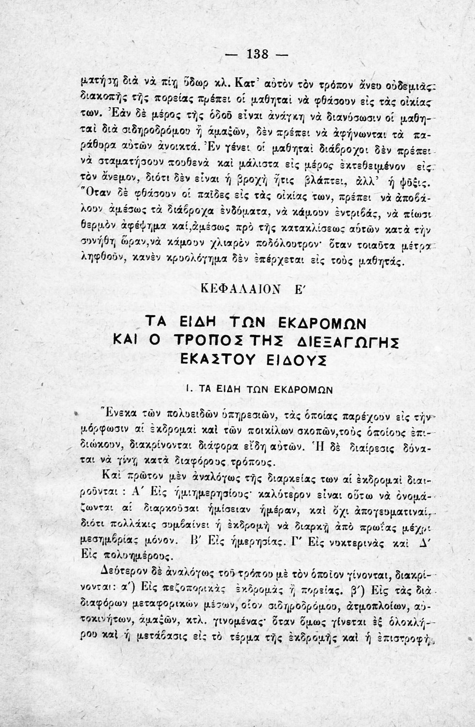 Παιδαγωγικό βοήθημα που αναφέρεται στην οργάνωση των σχολικών εκδρομών όλων των Δημοτικών, Γυμνασίων, Παρθεναγωγείων και εμπορικών σχολών. Η πρώτη έκδοση έγινε το 1917. Ο συγγραφέας ήταν Διδάκτορας Φιλολογίας και Γυμνασιάρχης στην Αθήνα.