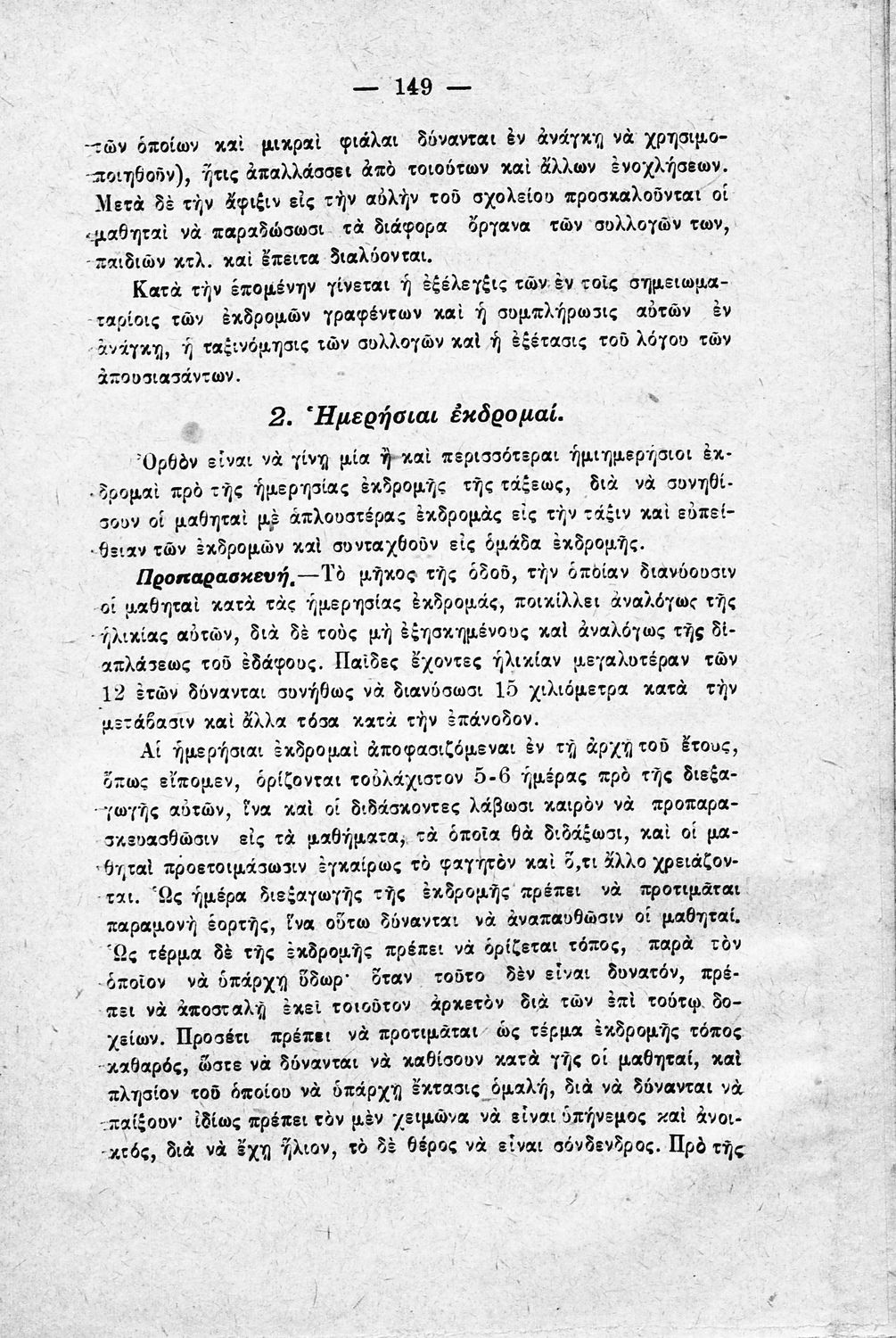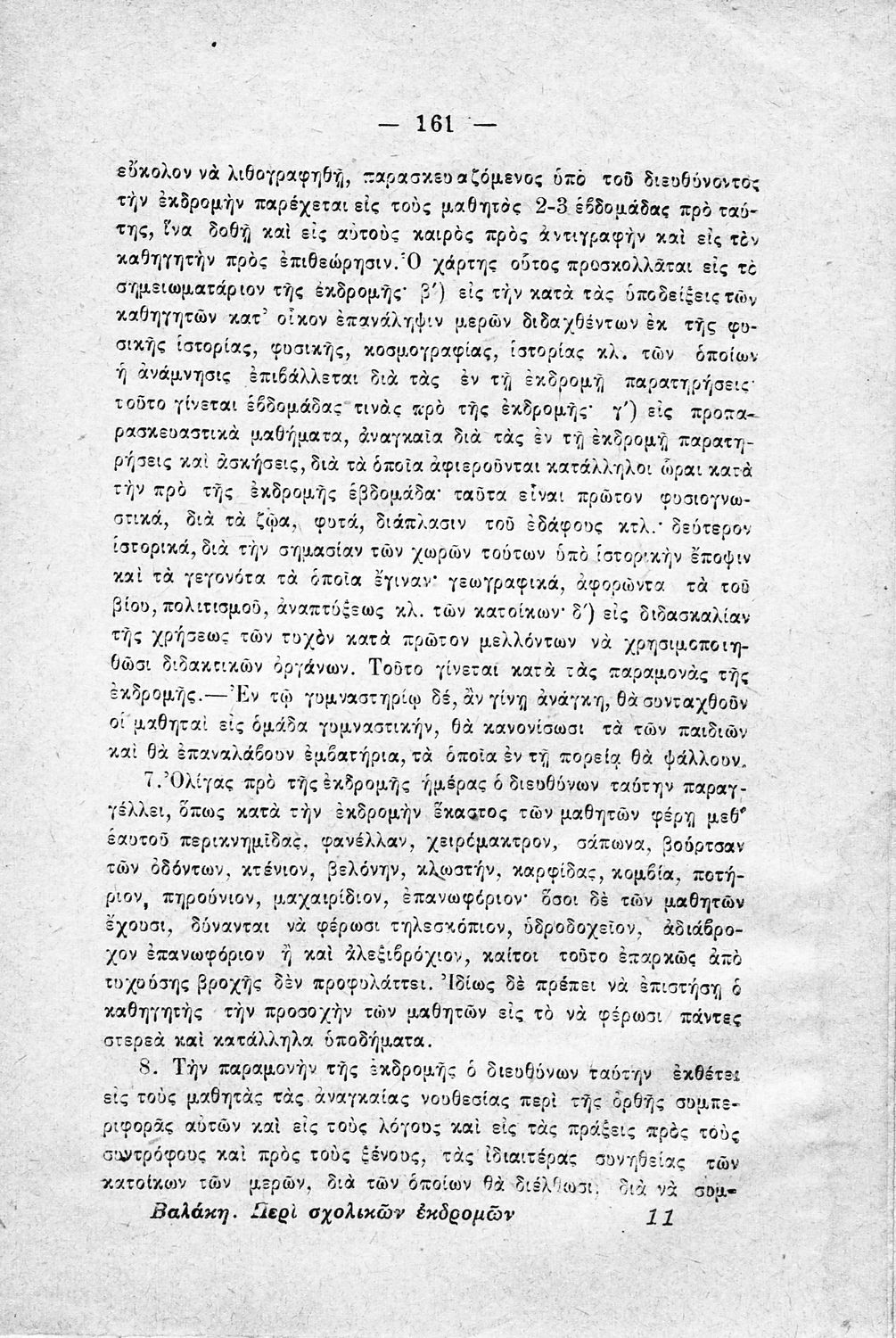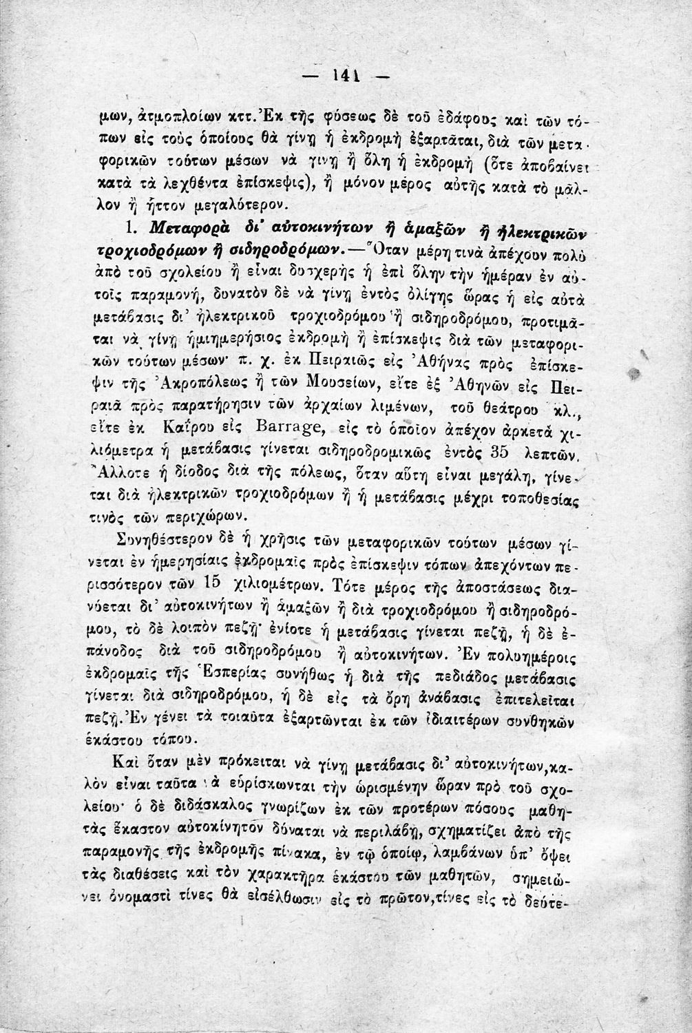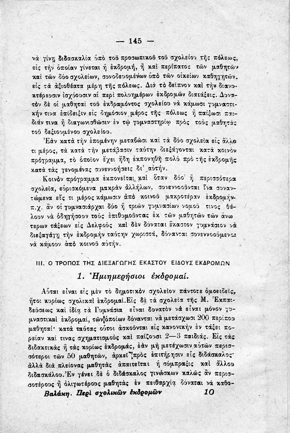 Παρουσίαση περιεχομένου: Παιδαγωγικό βοήθημα που αναφέρεται στην οργάνωση των σχολικών εκδρομών όλων των Δημοτικών, Γυμνασίων, Παρθεναγωγείων και εμπορικών σχολών. Η πρώτη έκδοση έγινε το 1917. Ο συγγραφέας ήταν Διδάκτορας Φιλολογίας και Γυμνασιάρχης στην Αθήνα.