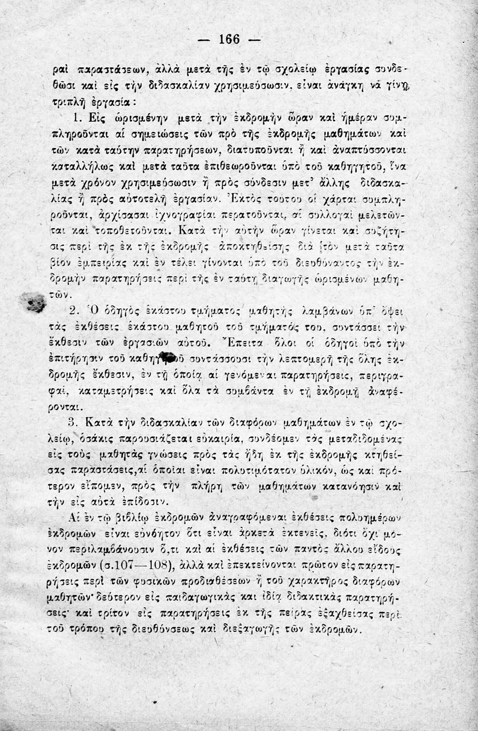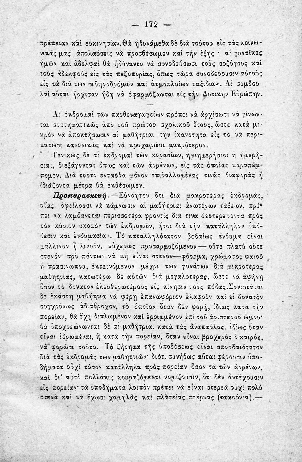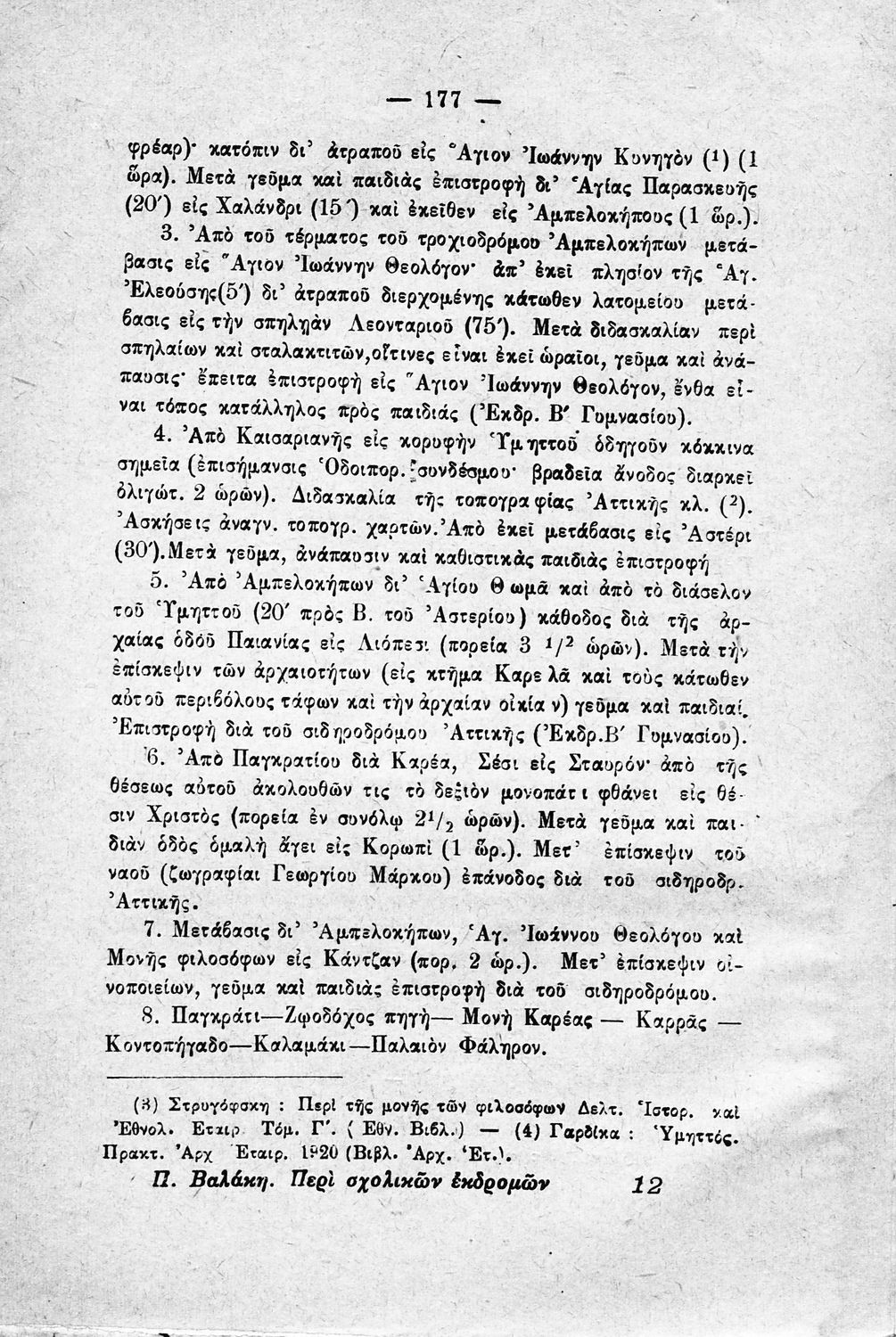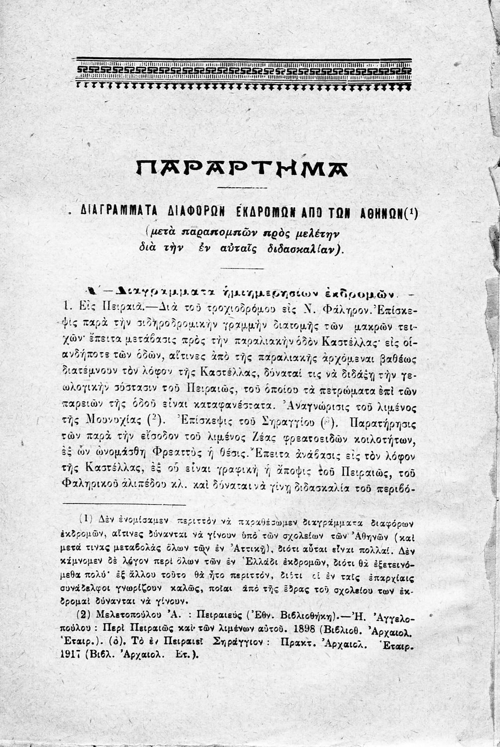 Παρουσίαση περιεχομένου: Παιδαγωγικό βοήθημα που αναφέρεται στην οργάνωση των σχολικών εκδρομών όλων των Δημοτικών, Γυμνασίων, Παρθεναγωγείων και εμπορικών σχολών. Η πρώτη έκδοση έγινε το 1917. Ο συγγραφέας ήταν Διδάκτορας Φιλολογίας και Γυμνασιάρχης στην Αθήνα.