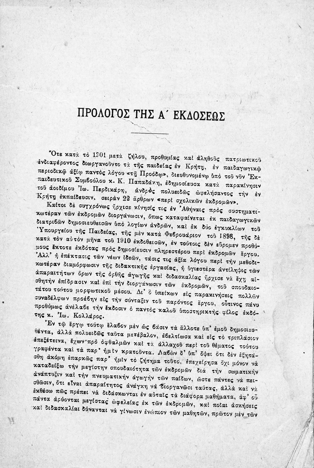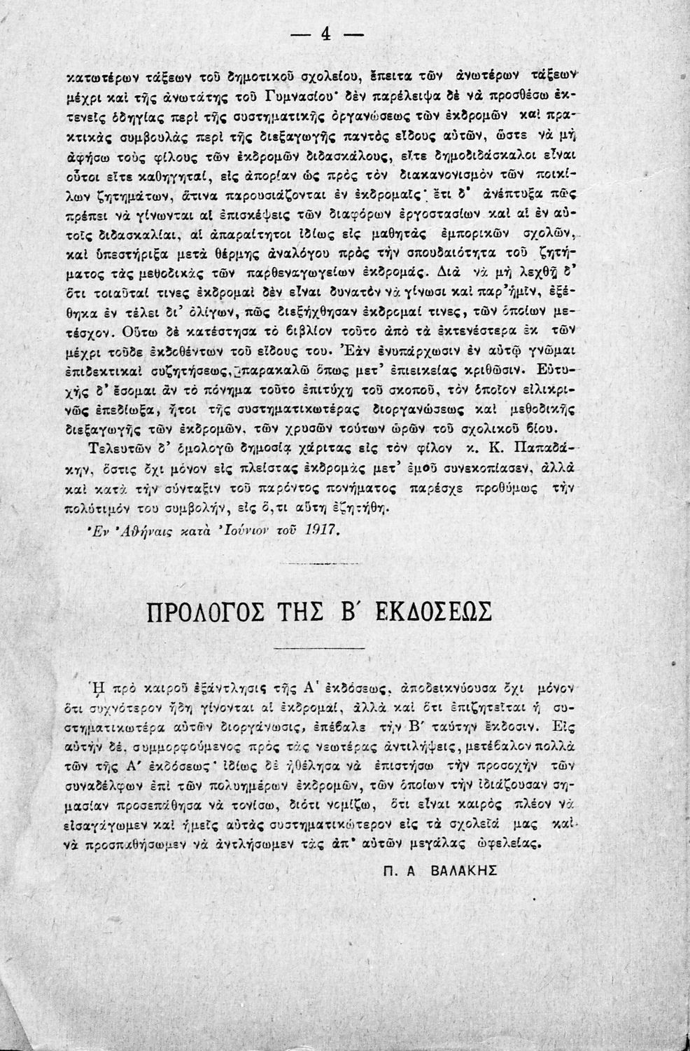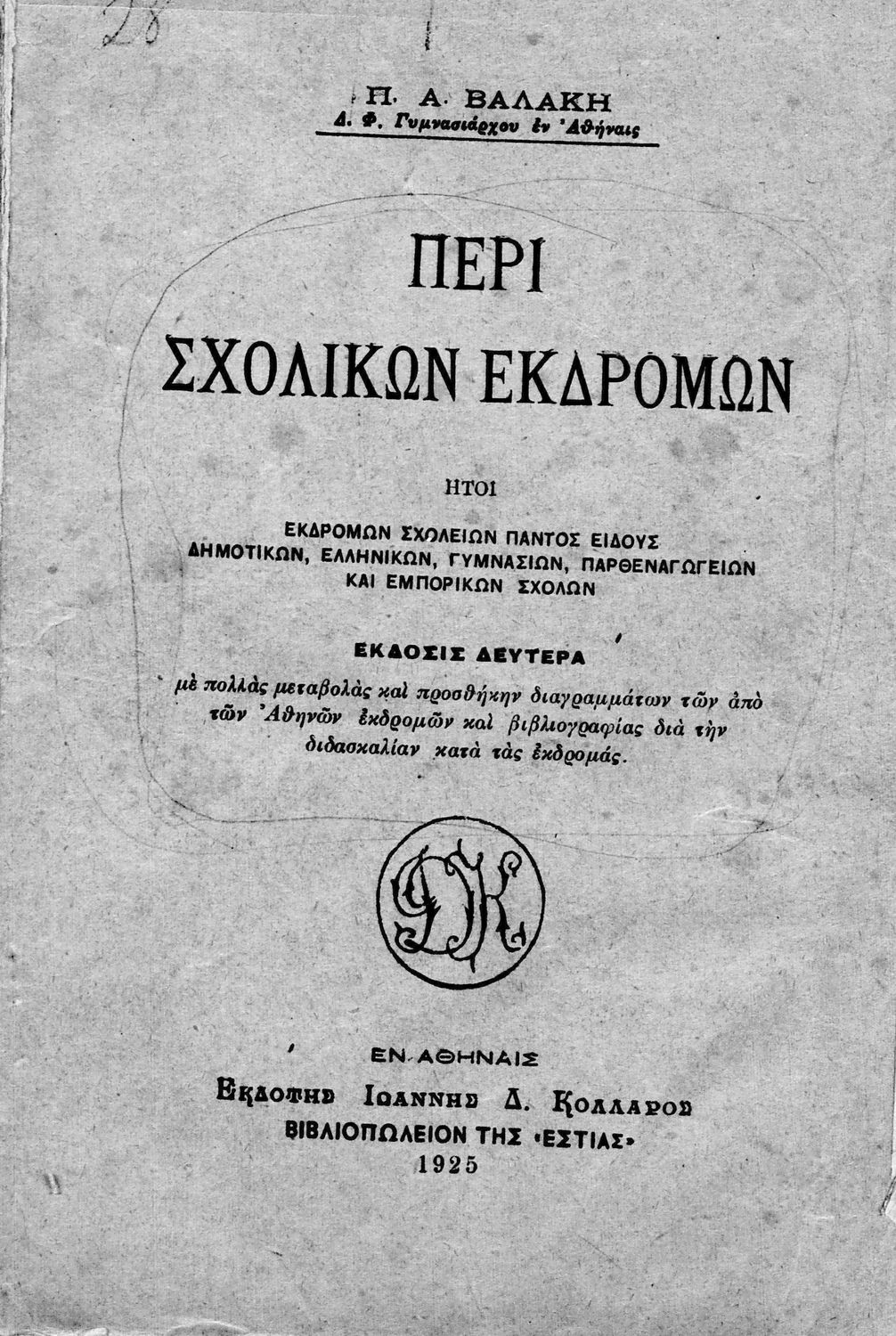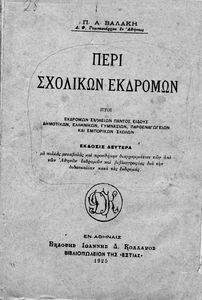 Παιδαγωγικό βοήθημα που αναφέρεται στην οργάνωση των σχολικών εκδρομών όλων των Δημοτικών, Γυμνασίων, Παρθεναγωγείων και εμπορικών σχολών. Η πρώτη έκδοση έγινε το 1917. Ο συγγραφέας ήταν Διδάκτορας Φιλολογίας και Γυμνασιάρχης στην Αθήνα.