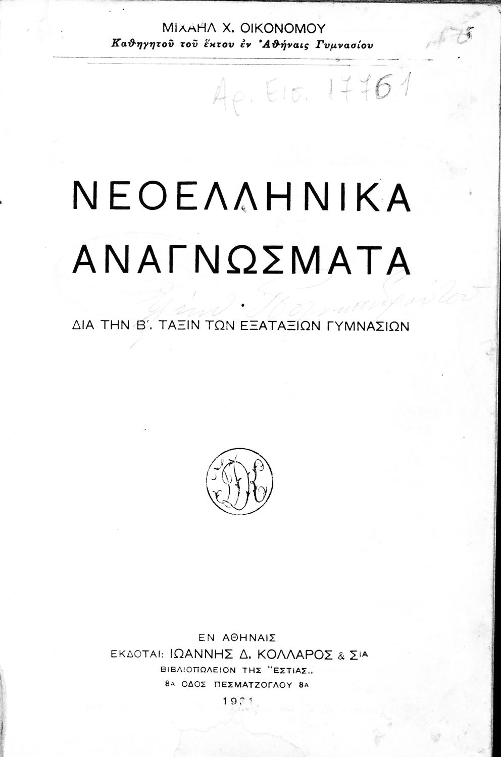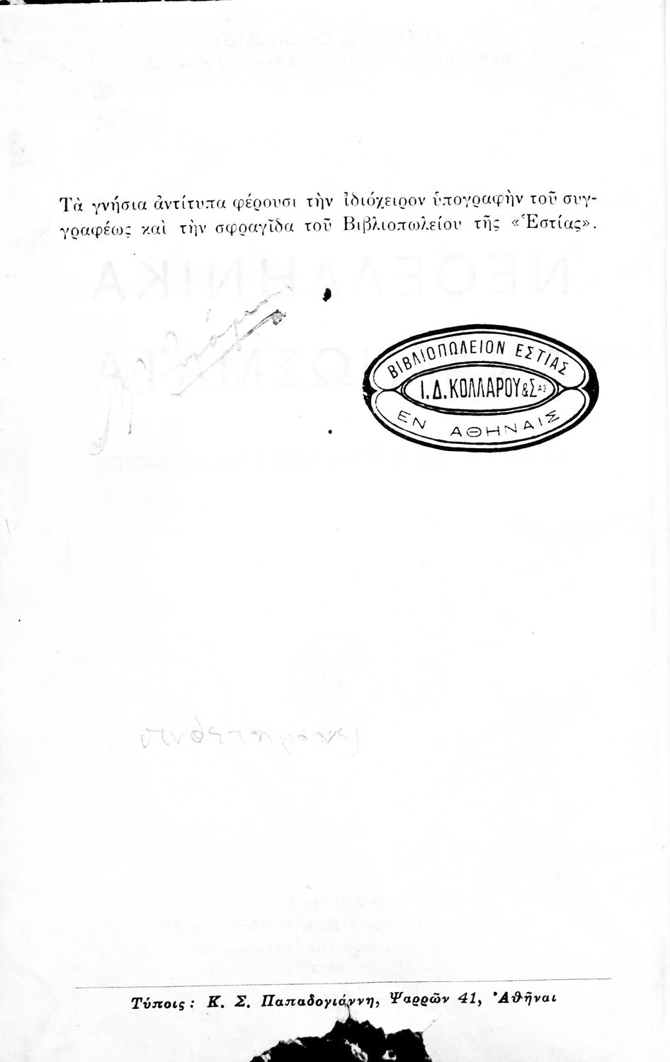 Εκδότης: Ιωάννης Δ. Κολλάρος και ΣΙΑ, Βιβλιοπωλείο της "Εστίας"
