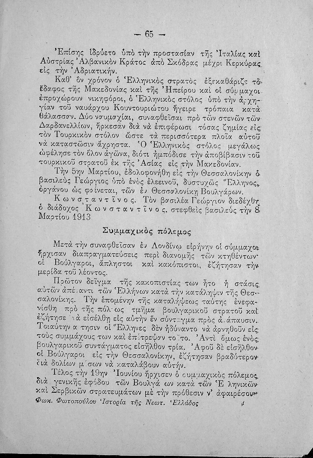 Κωδικός αναγνώρισης: 01-17770 Τίτλος: Ιστορία της Νεωτέρας Ελλάδος Περιέχουσα την ύλην του προγράμματος της ΣΤ΄ τάξεως των Δημοτικών Σχολείων Συγγραφέας: Φωκίων Φωτόπουλος Μέγεθος και υπόστρωμα: Μαθητικό βοήθημα, μαλακό εξώφυλλο, 72 σελίδες. Σκίτσα και εικόνες (ασπρόμαυρα). |