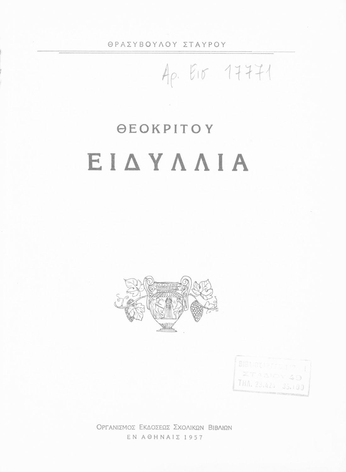 Σχολικό εγχειρίδιο Αρχαίων Ελληνικών ΣΤ΄ Γυμνασίου που περιέχει τα Ειδύλλια του Θεόκριτου, την υπόθεση του έργου, ερμηνευτικά και πραγματολογικά σχόλια και λεξιλογικές παρατηρήσεις.