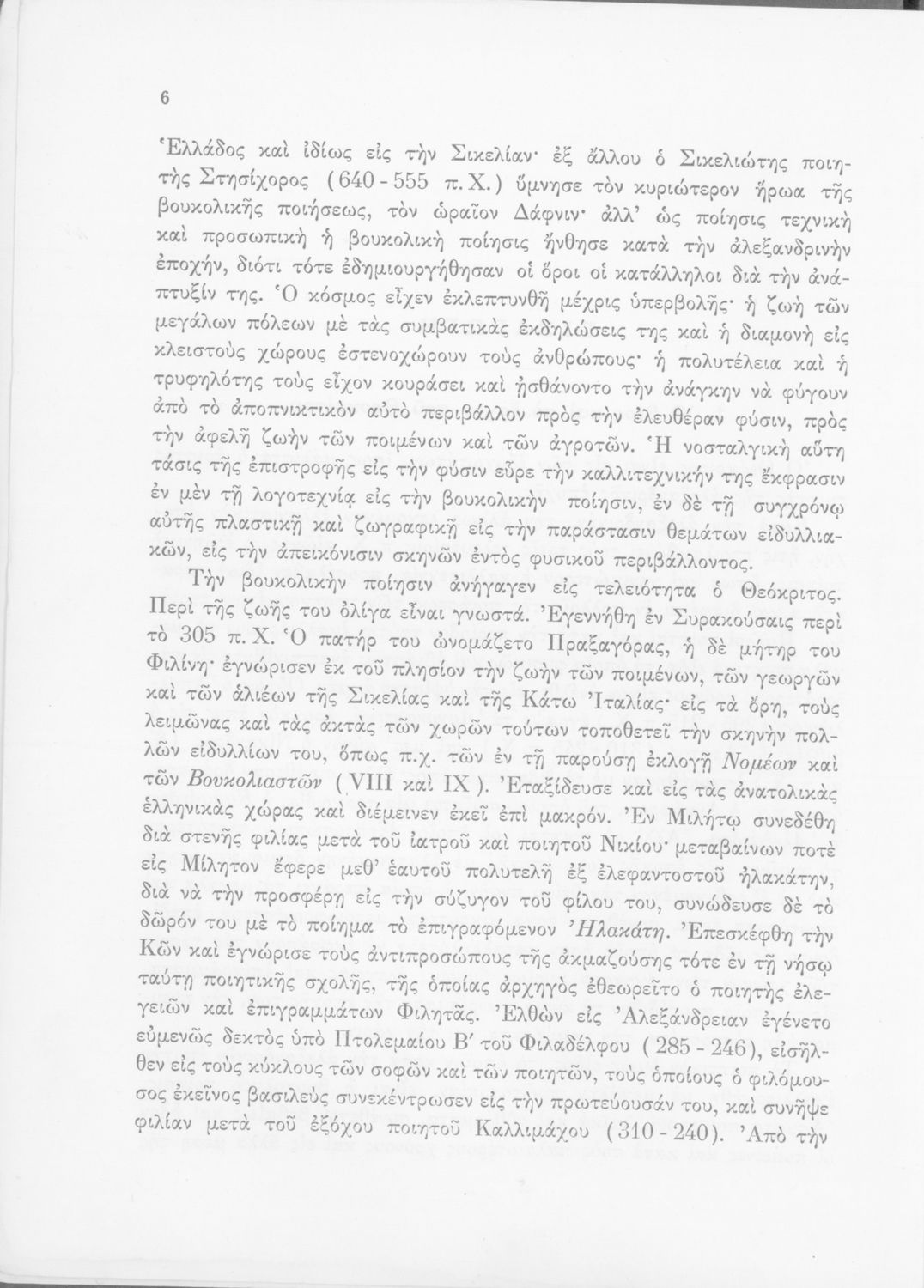 Σχολικό εγχειρίδιο Αρχαίων Ελληνικών ΣΤ΄ Γυμνασίου που περιλαμβάνει εισαγωγή στη ζωή και το έργο του Θεόκριτου, τα Ειδύλλιά του και ερμηνευτικά σχόλια.