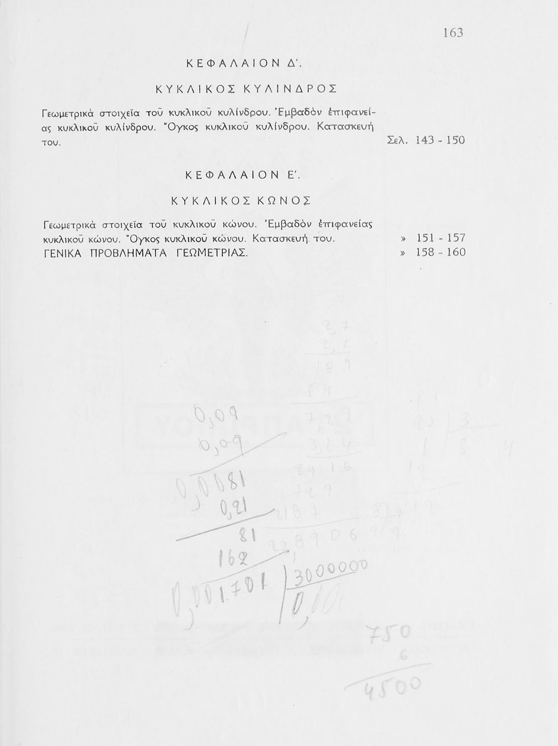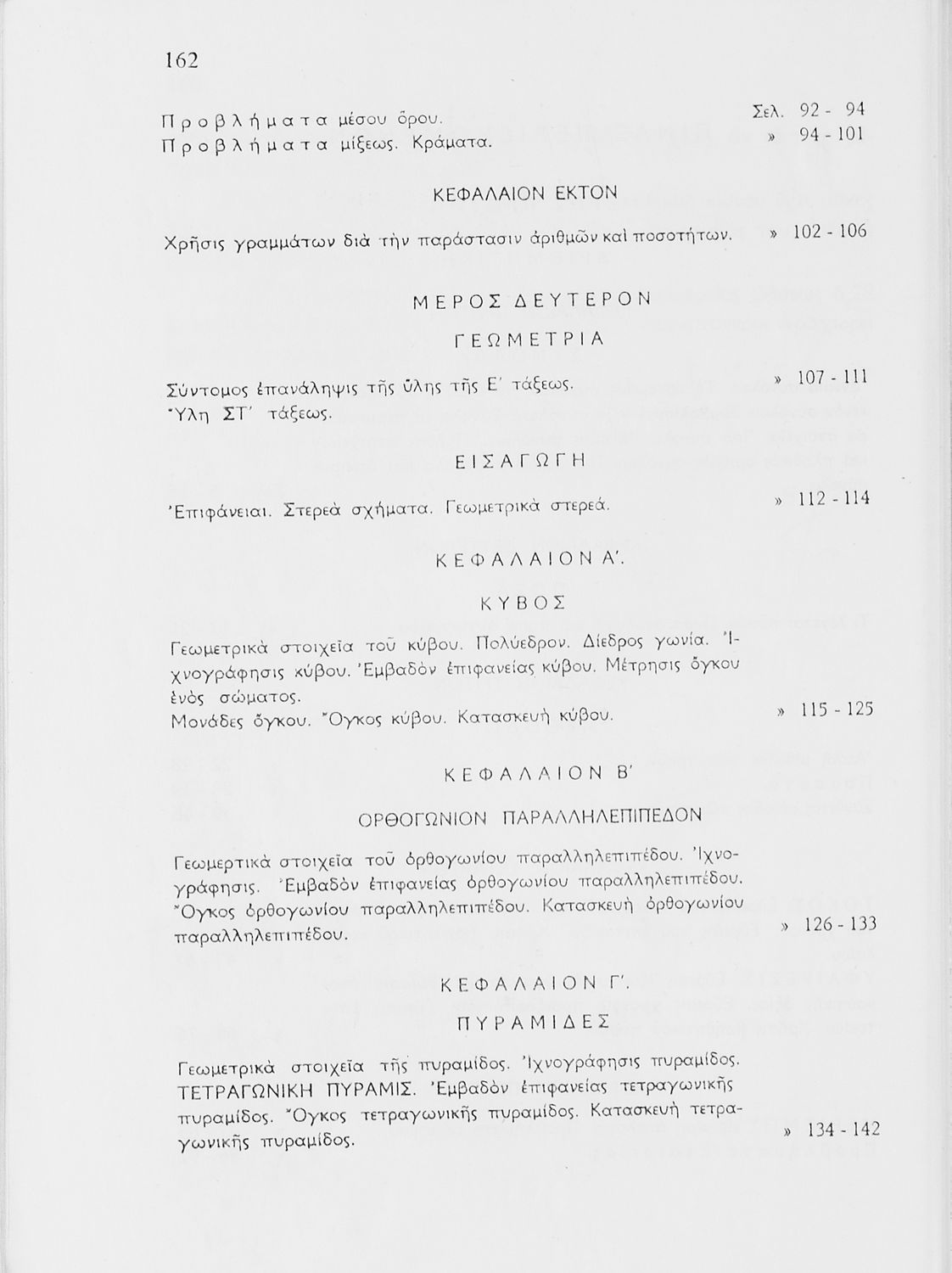 Βαθμίδα εκπαίδευσης: Δευτεροβάθμια Τάξη: ΣΤ' Δημοτικού Μάθημα: Μαθηματικά Γλώσσα: Απλή καθαρεύουσα Παρουσίαση περιεχομένου: Σχολικό εγχειρίδιο Μαθηματικών ΣΤ΄ Δημοτικού που περιλαμβάνει ασκήσεις λογιστικού χαρακτήρα και ασκήσεις μέτρησης γεωμετρικών σχημάτων. Φέρει το σύμβολο της δικτατορίας. |