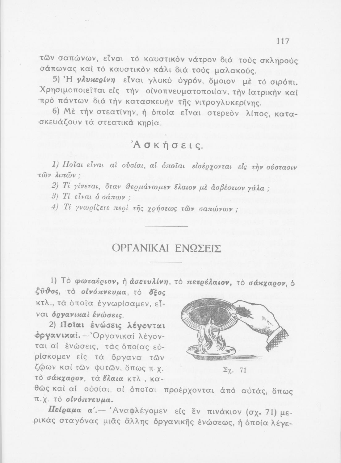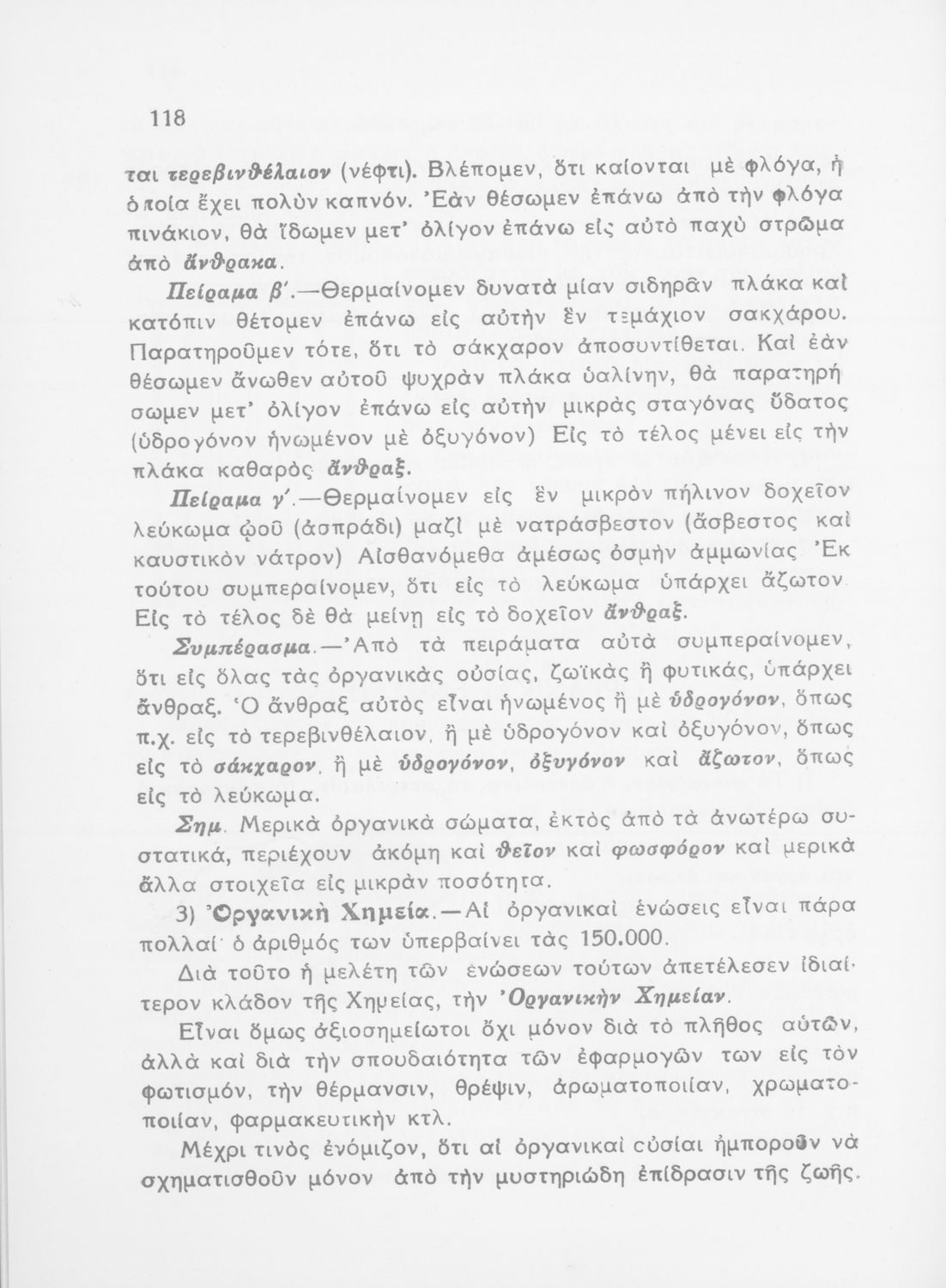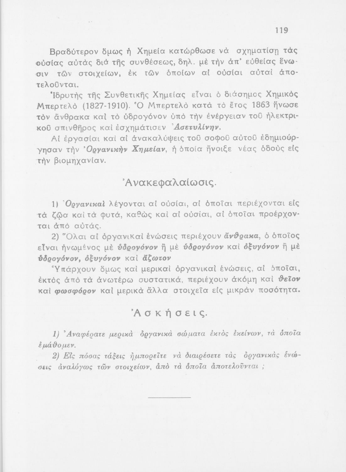 Βαθμίδα εκπαίδευσης: Δευτεροβάθμια Τάξη: Β' Γυμνασίου Μάθημα: Χημεία Γλώσσα: Καθαρεύουσα Παρουσίαση περιεχομένου: Το συγκεκριμένο εγχειρίδιο αφορά το μάθημα της Χημείας και αναφέρεται σε μαθητές της Β΄ τάξης των Οκταταξίων Γυμνασίων. Περιγράφει τις χημικές ενώσεις των σωμάτων και τα μείγματα τους, φυσικούς και τεχνικούς άνθρακες, βάσεις, άλατα, οξέα και αναλύεται η σύσταση διάφορων μετάλλων |
