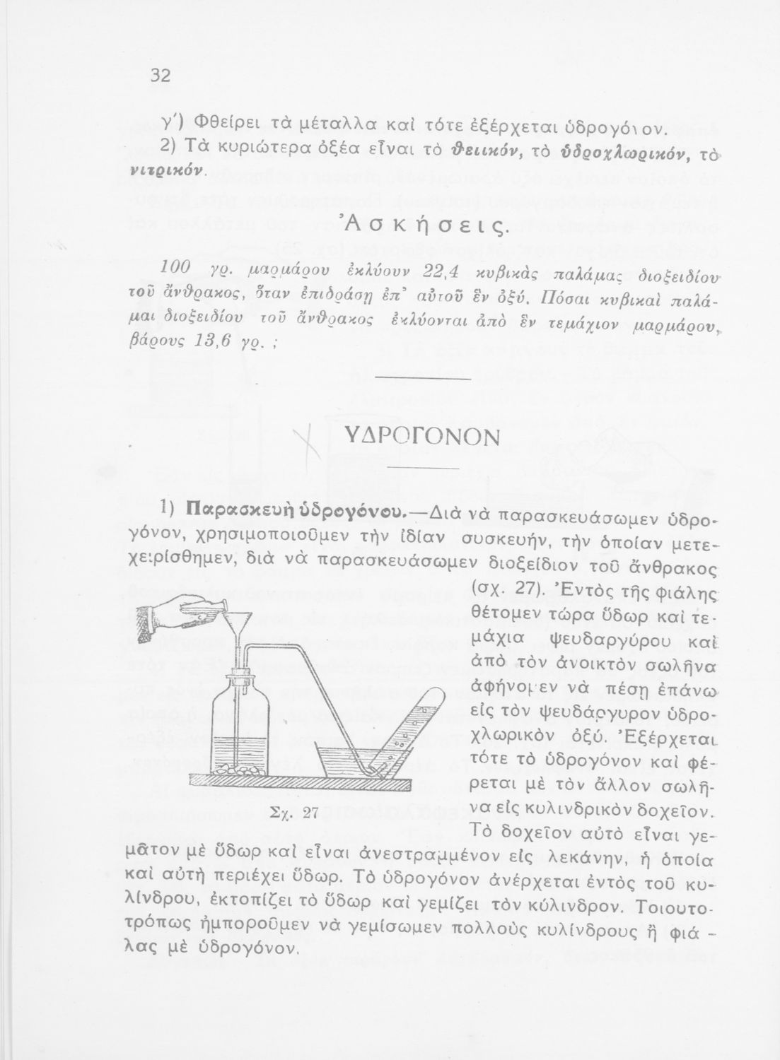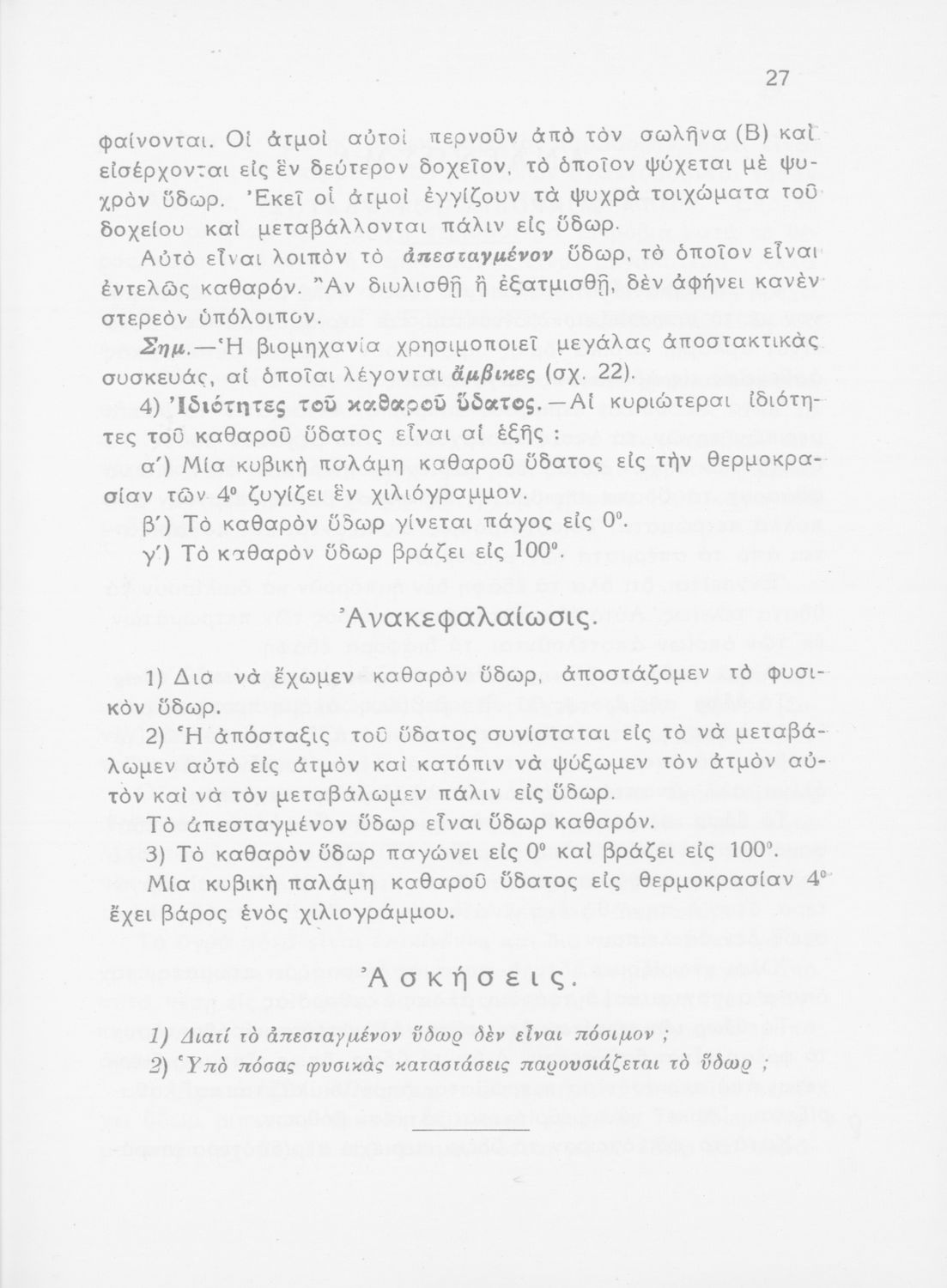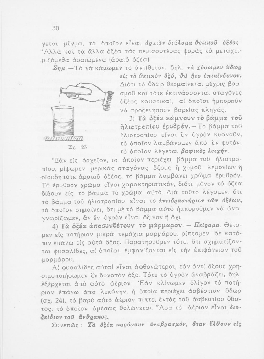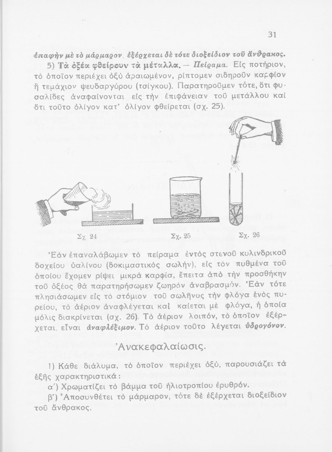 Βαθμίδα εκπαίδευσης: Δευτεροβάθμια Τάξη: Β' Γυμνασίου Μάθημα: Χημεία Γλώσσα: Καθαρεύουσα Παρουσίαση περιεχομένου: Το συγκεκριμένο εγχειρίδιο αφορά το μάθημα της Χημείας και αναφέρεται σε μαθητές της Β΄ τάξης των Οκταταξίων Γυμνασίων. Περιγράφει τις χημικές ενώσεις των σωμάτων και τα μείγματα τους, φυσικούς και τεχνικούς άνθρακες, βάσεις, άλατα, οξέα και αναλύεται η σύσταση διάφορων μετάλλων |