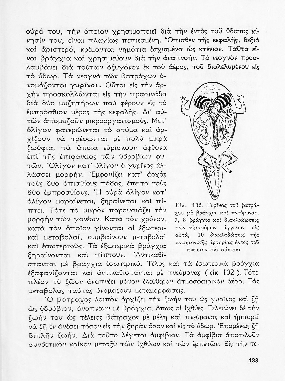 Σχολικό εγχειρίδιο Ζωολογίας Α΄ Γυμνασίου που εστιάζει στη φυσιολογία και ανατομία και παρουσιάζει τα διάφορα ζώα ανάλογα με την συνομοταξία στην οποία ανήκουν. Φέρει το σύμβολο της δικτατορίας.