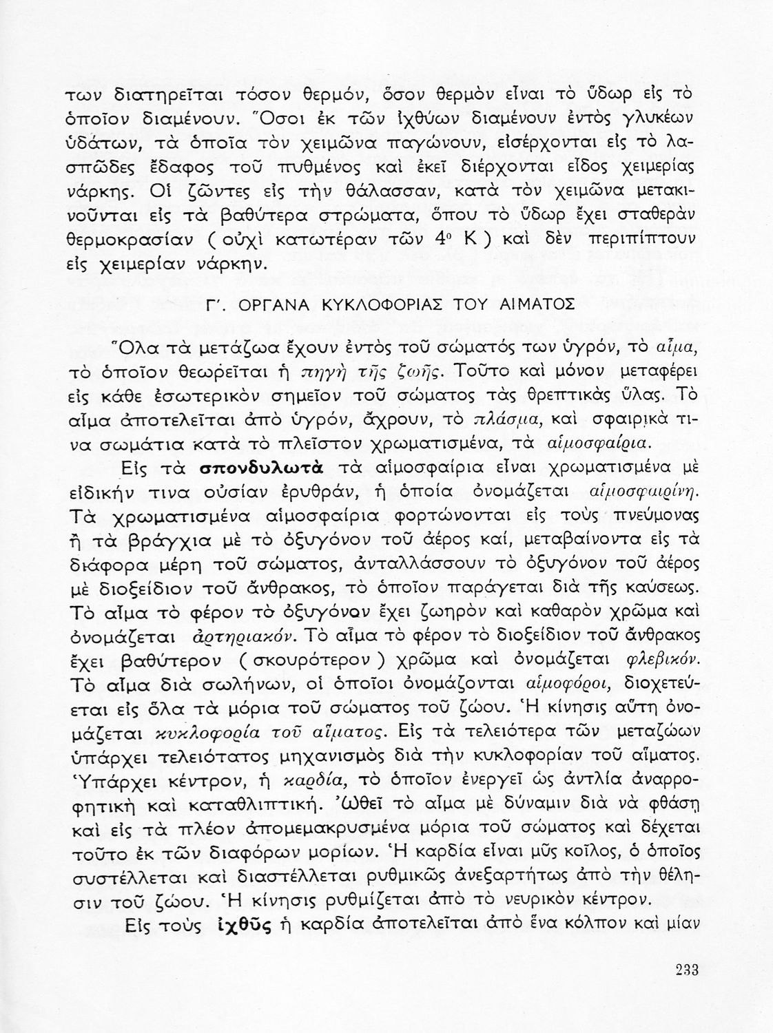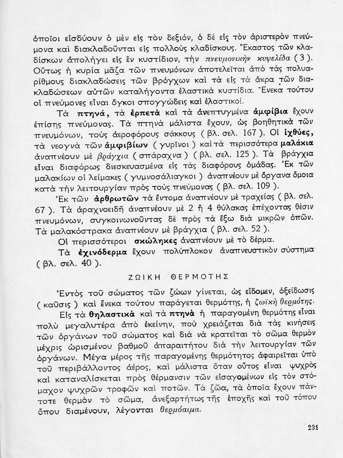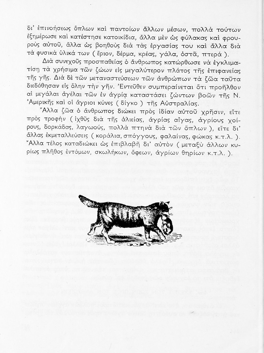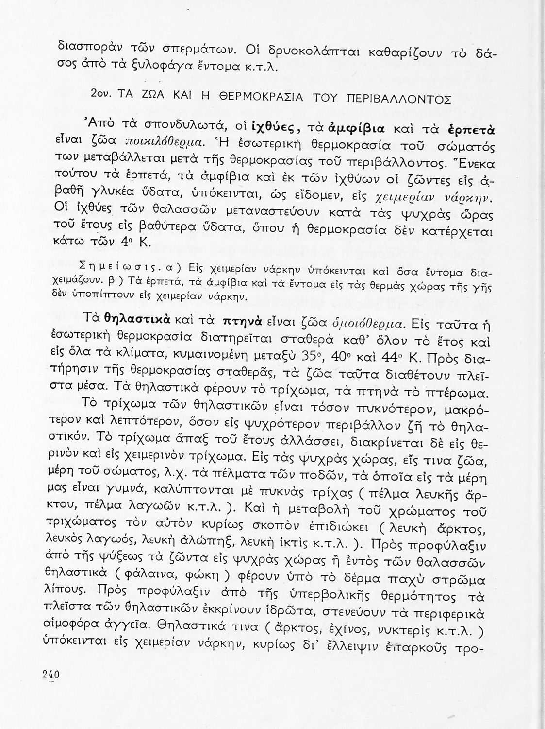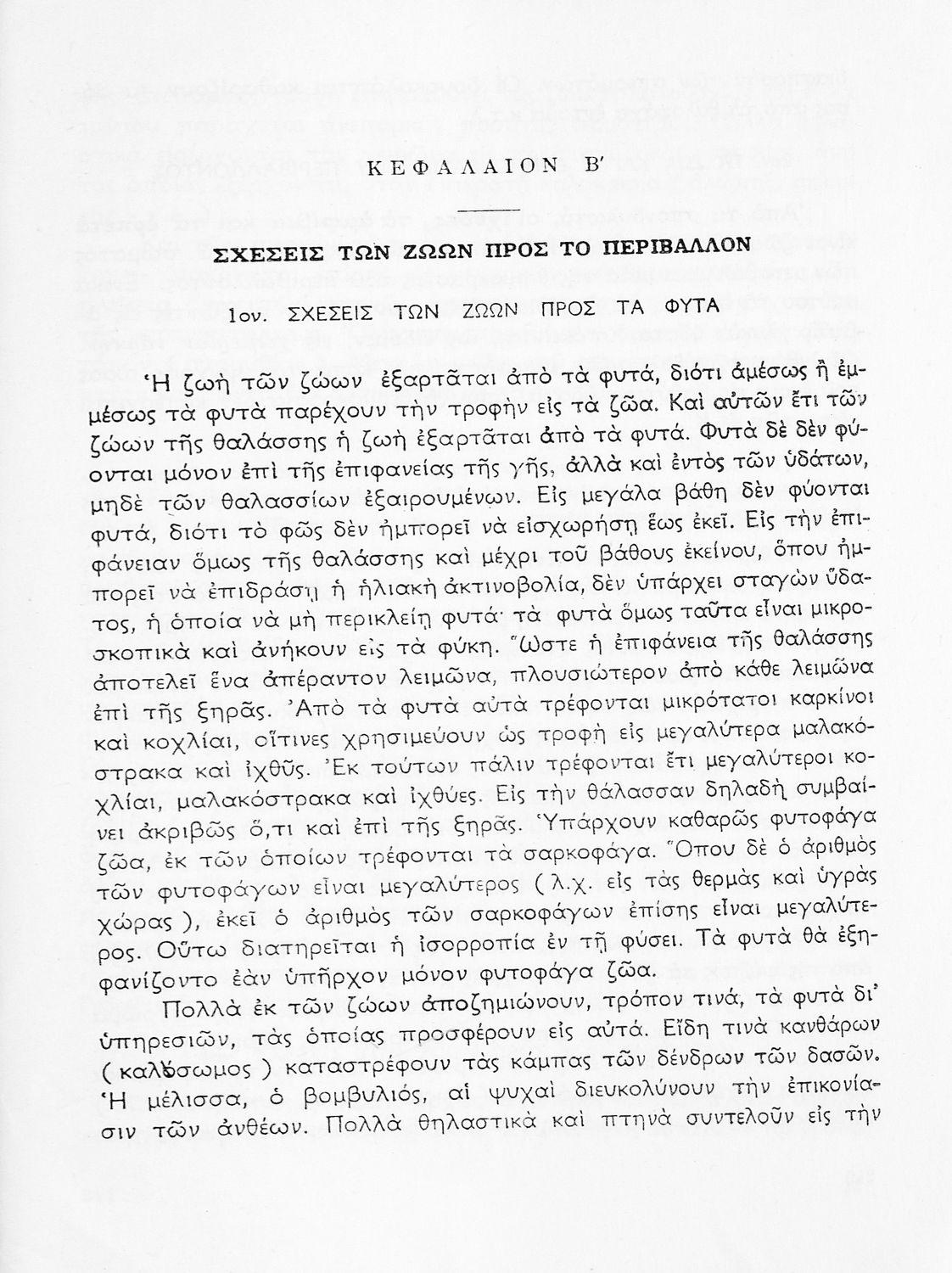 Σχολικό εγχειρίδιο Ζωολογίας Α΄ Γυμνασίου που εστιάζει στη φυσιολογία και ανατομία και παρουσιάζει τα διάφορα ζώα ανάλογα με την συνομοταξία στην οποία ανήκουν. Φέρει το σύμβολο της δικτατορίας.