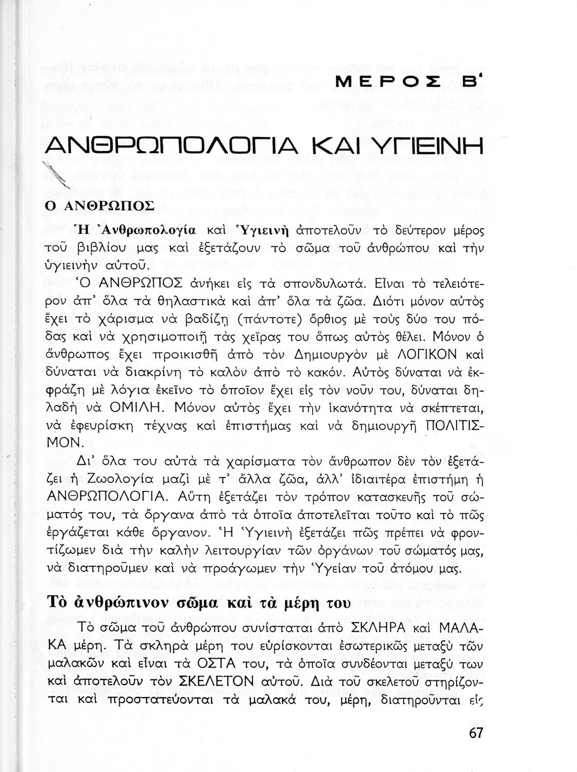 Σχολικό εγχειρίδιο της ΣΤ΄ Δημοτικού για το μάθημα της Φυσικής Ιστορίας. Περιέχει πληροφορίες για την ανθρωπολογία και την ζωολογία. Στο τελευταίο κεφάλαιο περιλαμβάνονται πληροφορίες για τις πρώτες βοήθειες και την υγιεινή. Το βιβλίο έχει εικόνες, οι οποίες διευκολύνουν τη διδασκαλία. Ο λόγος των κειμένων είναι απλός και κατανοητός για τους μαθητές.