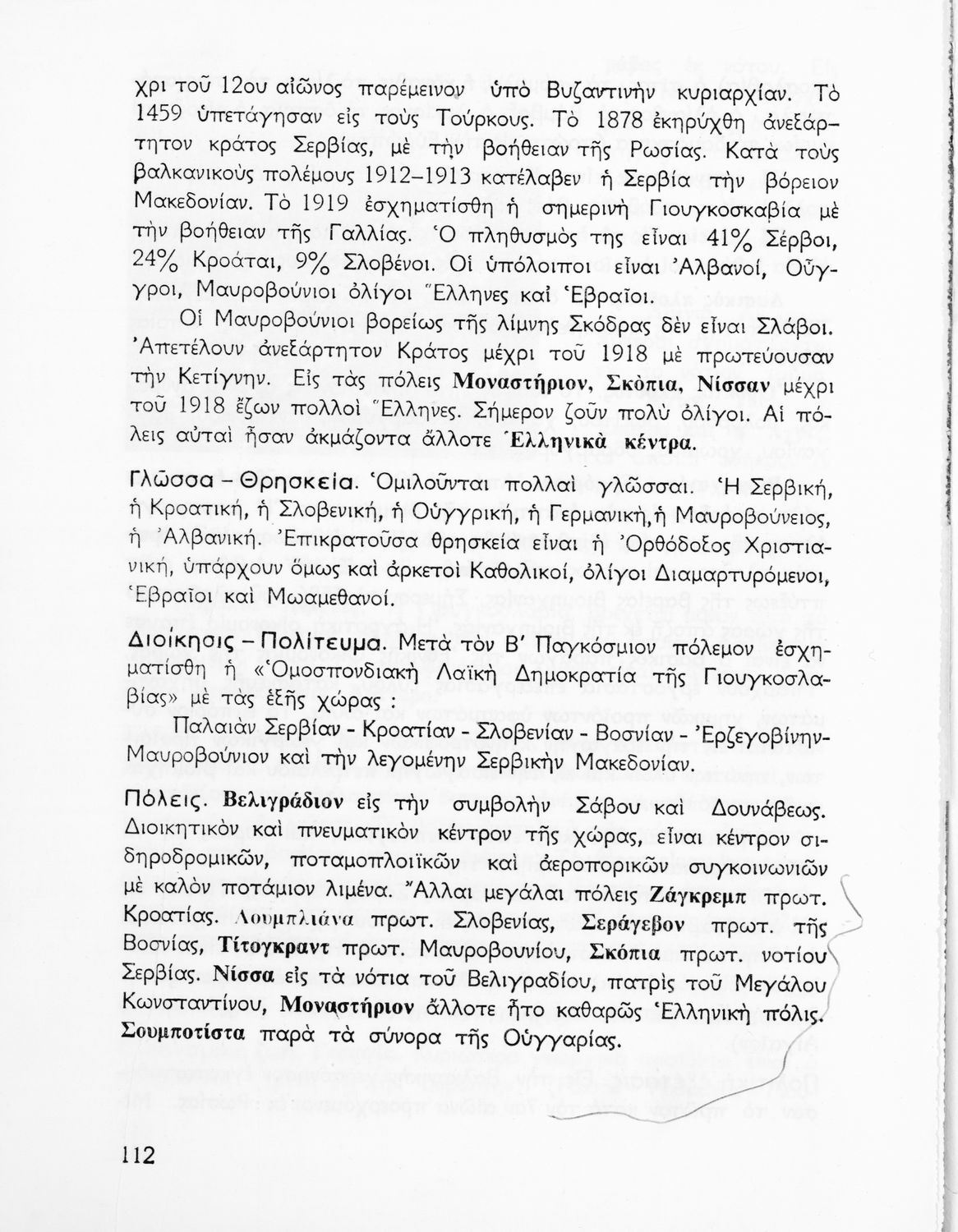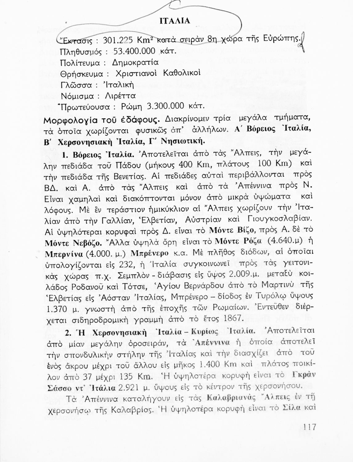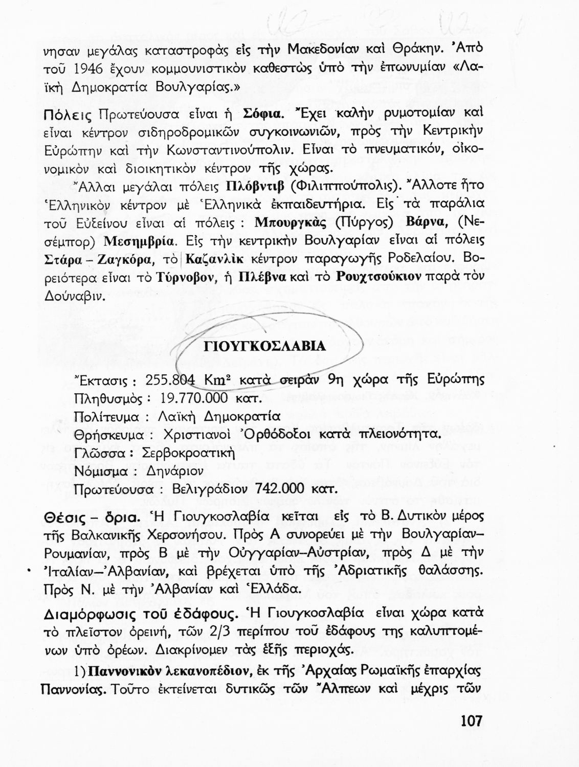 Σχολικό εγχειρίδιο Γεωγραφίας Β' Γυμνασίου που περιλαμβάνει εισαγωγή στη φυσική και μαθηματική γεωγραφία και παρουσιάζει τις χώρες της Ευρώπης από γεωμορφολογική, πολιτική, πολιτισμική και οικονομική άποψη. Περιέχει και αναφορά στις οικονομικές σχέσεις της Ελλάδας με τα ευρωπαϊκά κράτη. Φέρει το σύμβολο της δικτατορίας.