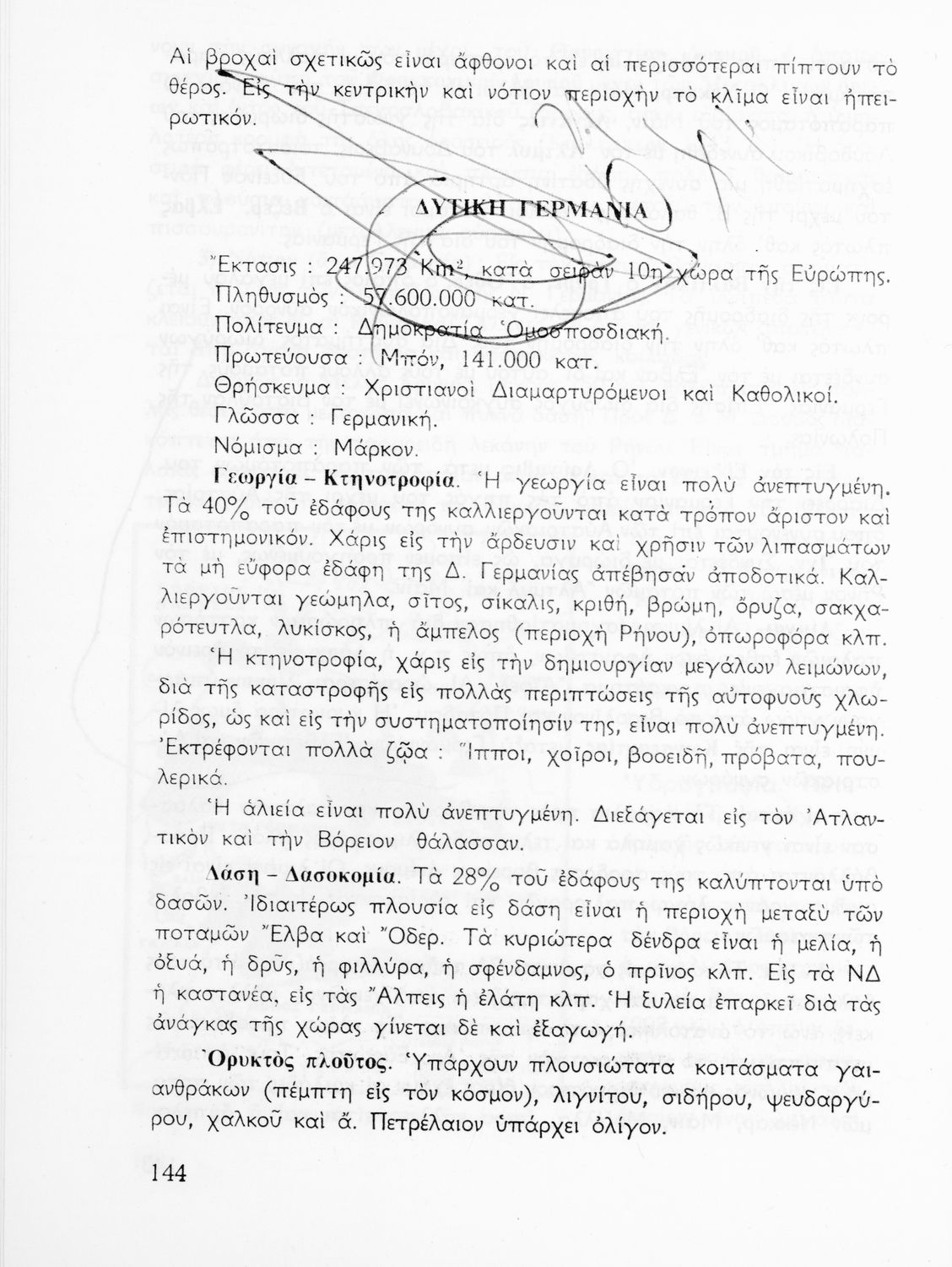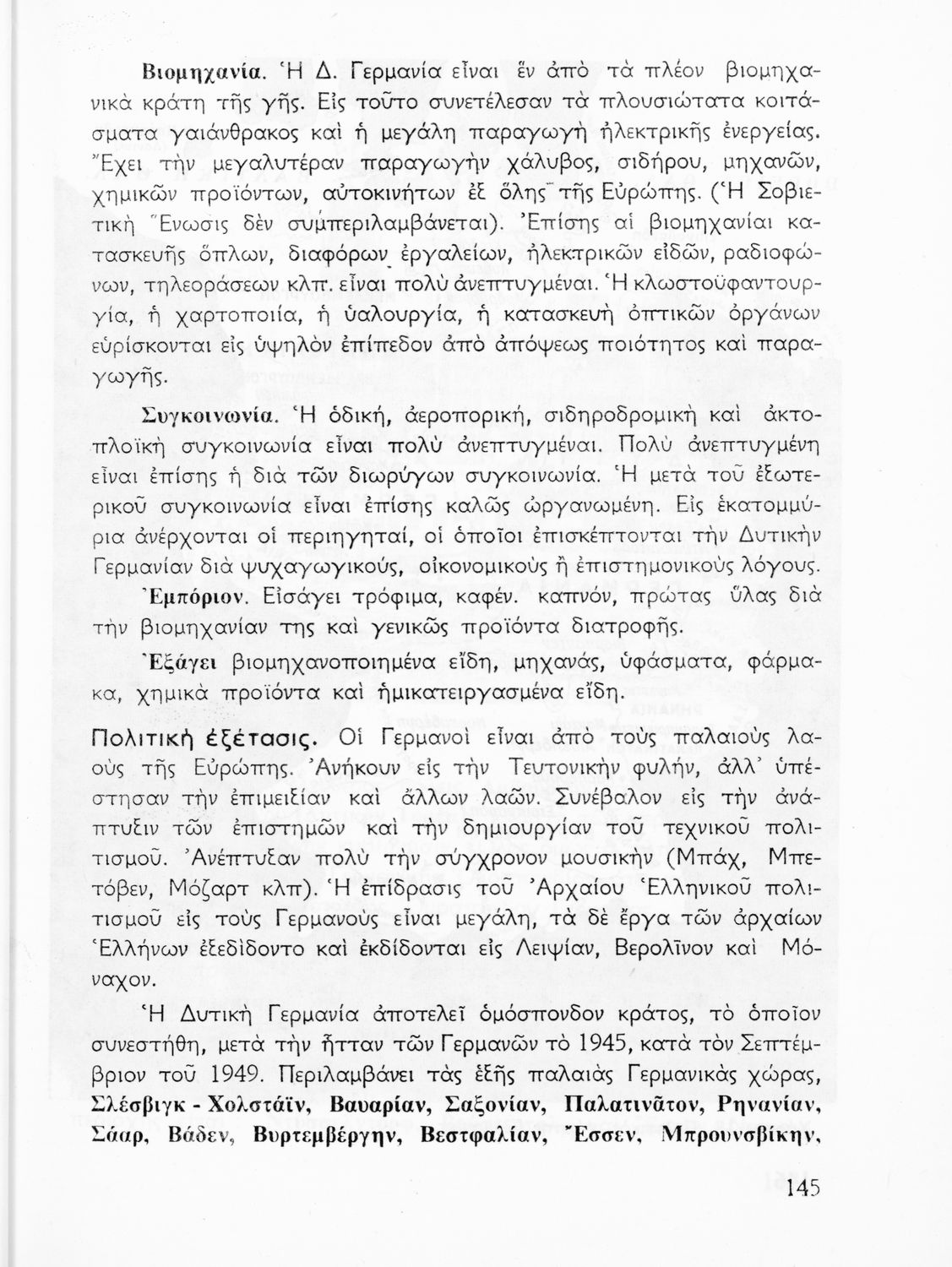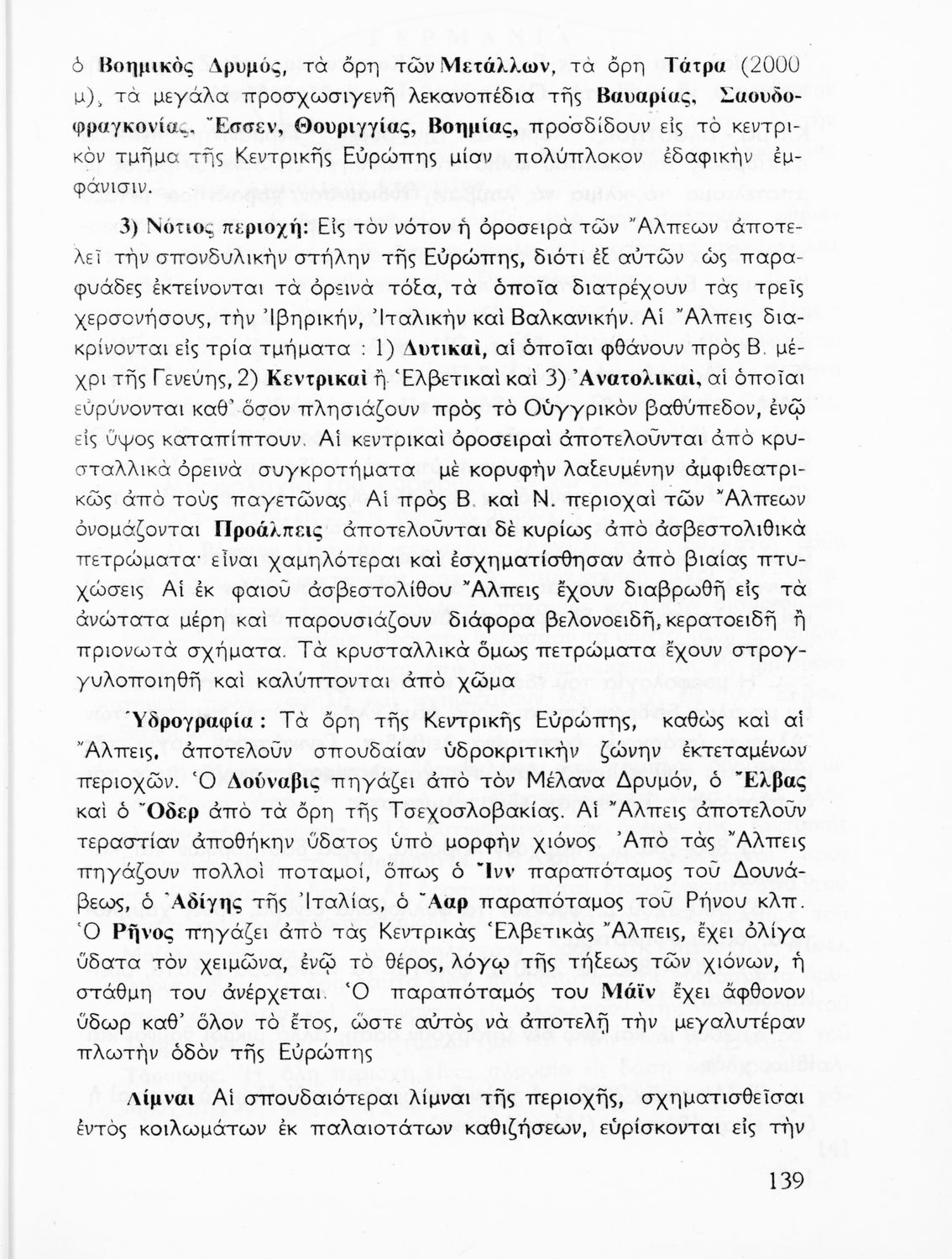 Σχολικό εγχειρίδιο Γεωγραφίας Β' Γυμνασίου που περιλαμβάνει εισαγωγή στη φυσική και μαθηματική γεωγραφία και παρουσιάζει τις χώρες της Ευρώπης από γεωμορφολογική, πολιτική, πολιτισμική και οικονομική άποψη. Περιέχει και αναφορά στις οικονομικές σχέσεις της Ελλάδας με τα ευρωπαϊκά κράτη. Φέρει το σύμβολο της δικτατορίας.